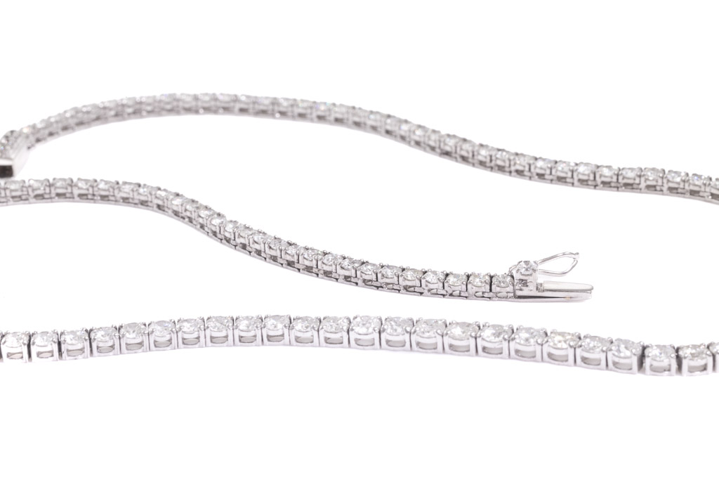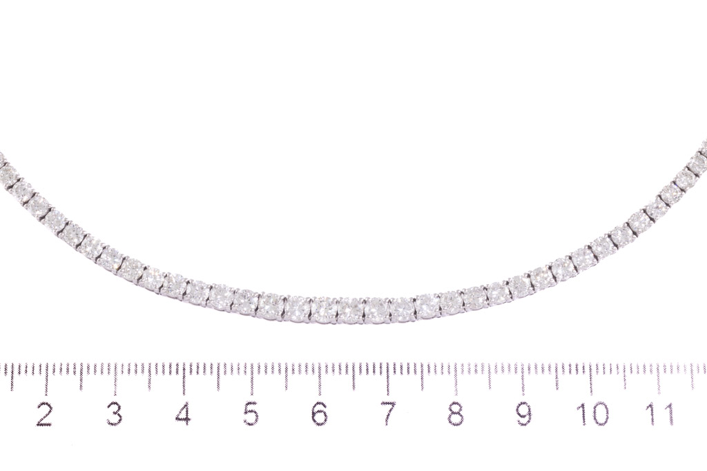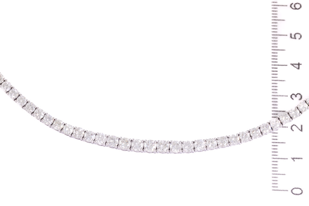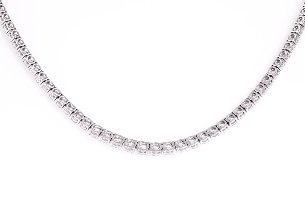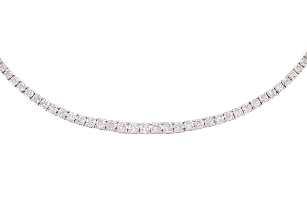 Diamond tennis necklace with graduated round Diamonds totalling 13.87cts (Estimated grading: H-I SI). 18ct white gold. Length: 42cm. Weight: 22.7g. With certificate #416758. (Pre-owned)