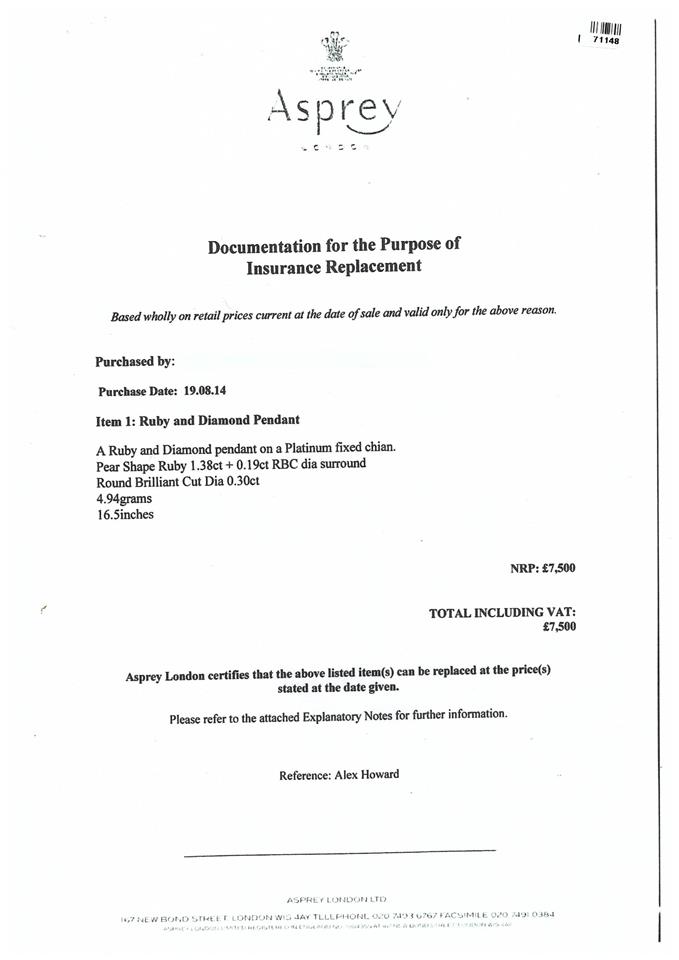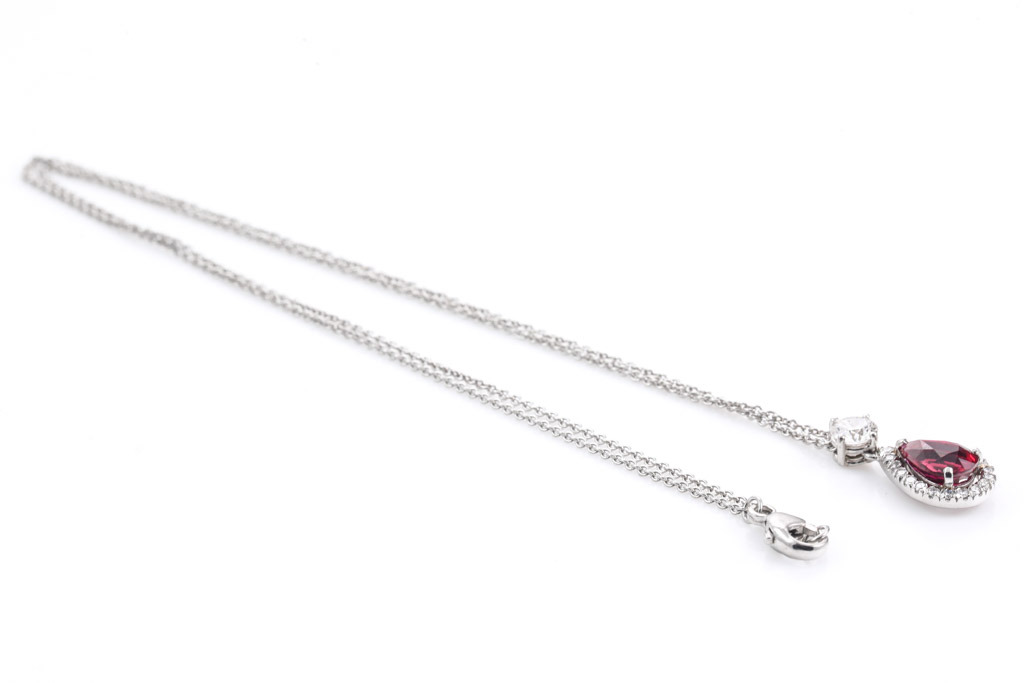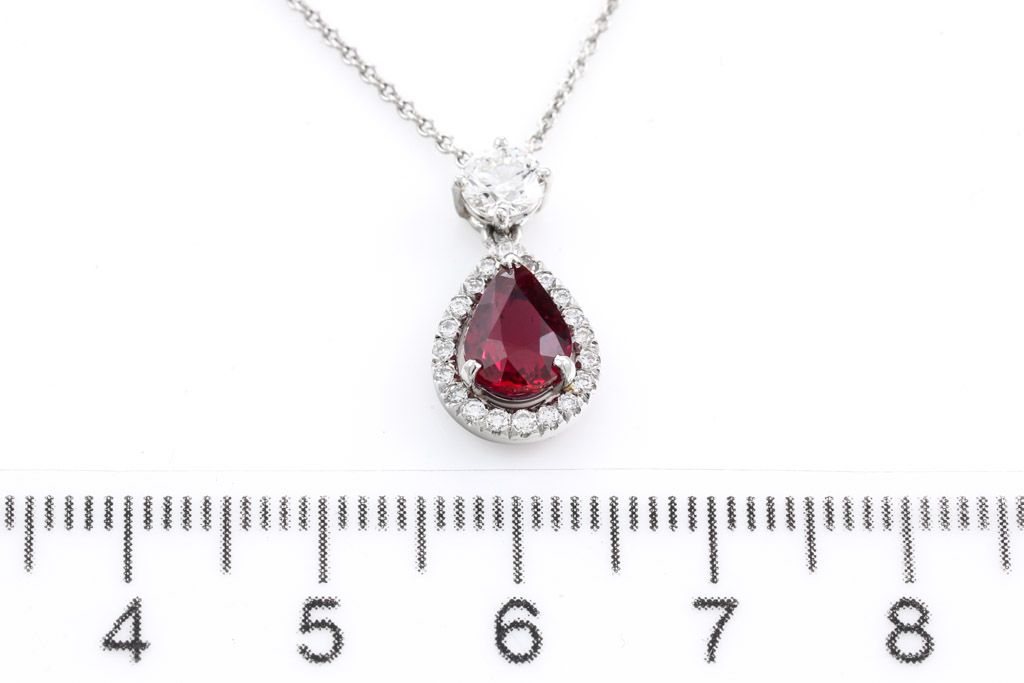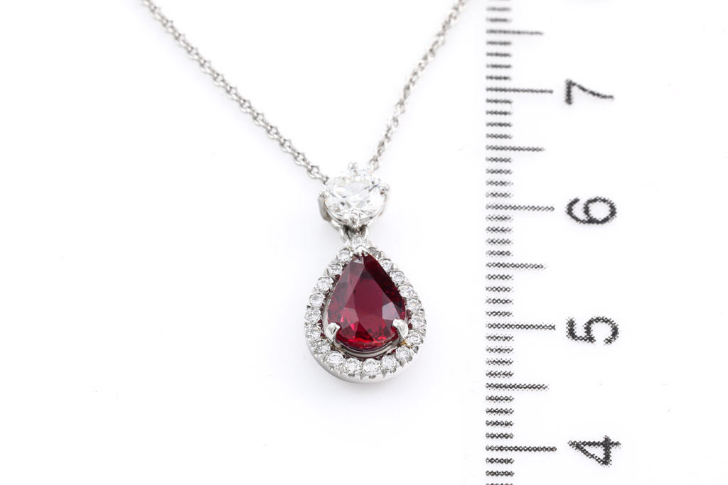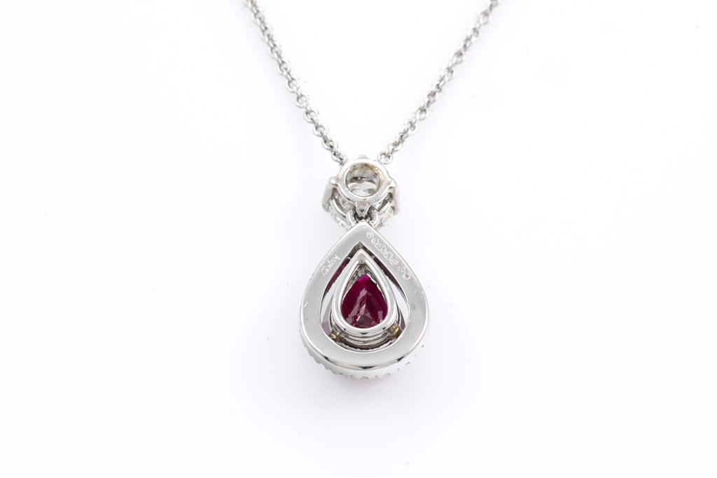 Asprey Ruby and Diamond pendant with pear shape Ruby of 1.38ct and round Diamonds totalling 0.49cts (Estimated grading: G VS). Platinum with 42cm platinum chain. Weight: 4.9g. With copy of Asprey Valuation Certificate. With Asprey Box. (Pre-owned)