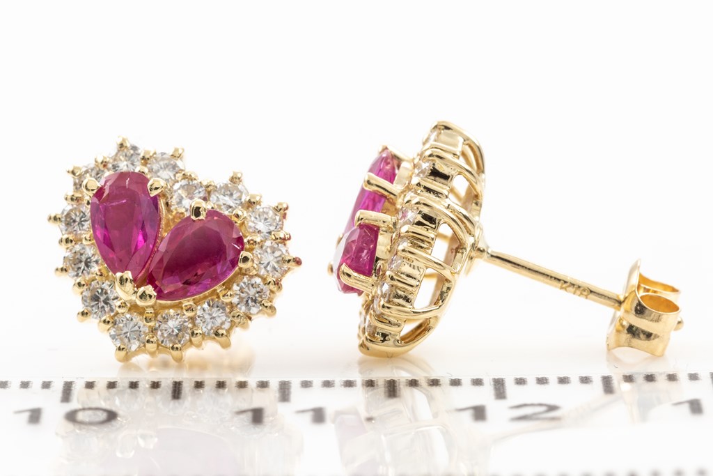 Ruby and Diamond earrings with 4 pear shape Rubies totalling 1.38cts (note: with surface reaching inclustions) and round Diamonds totalling 0.68cts (Estimated grading: G-H SI). 18ct yellow gold. Weight: 4.9g. (Pre-owned)