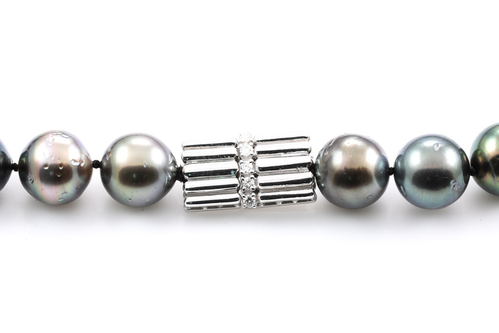 Tahitian Pearl and Diamond necklace with graduated Tahitian pearls of 10.2 - 13.8mm. 18ct white gold and platinum clasp set with round Diamonds totalling 0.10cts. Length: 47cm. Weight: 79.6g. (Pre-owned)