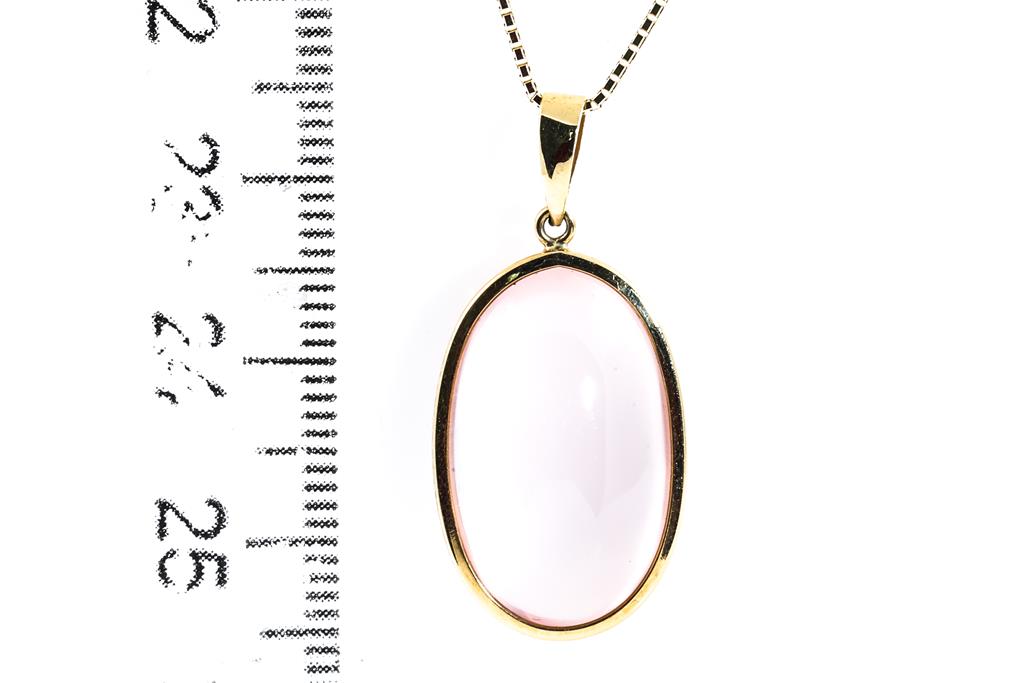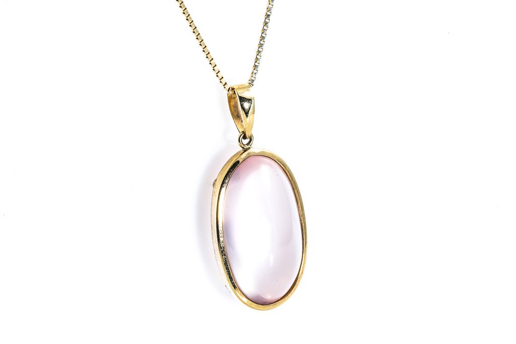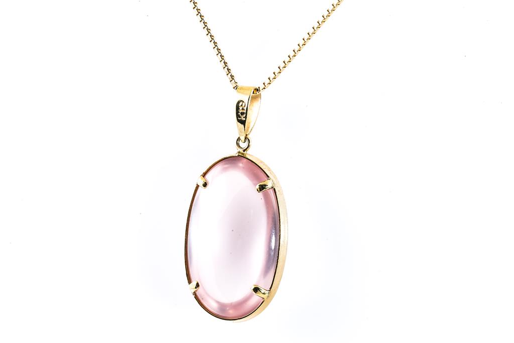 Quartz pendant with cabochon cut Rose Quartz of approximately 13.95ct. 18ct yellow gold with 18ct yellow gold adjustable 44cm chain. Weight: 5.5g. (Pre-owned)