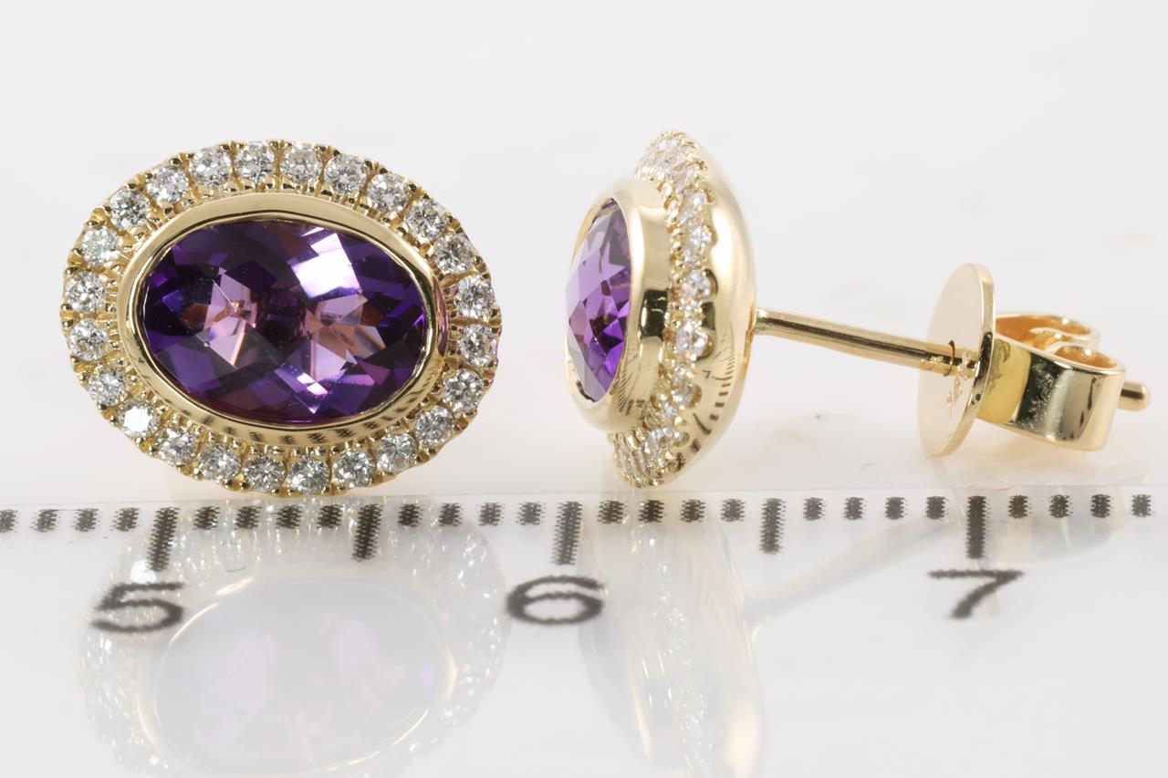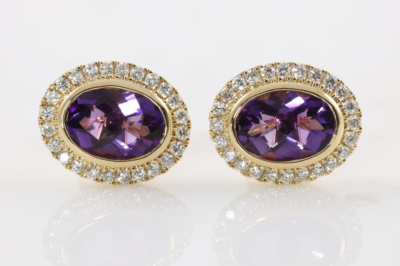 Amethyst and Diamond earrings with oval Amethysts totalling 1.39ct and Diamonds totalling 0.25cts. 14ct yellow gold. Weight: 2.7g (New)