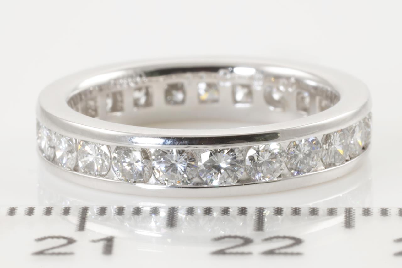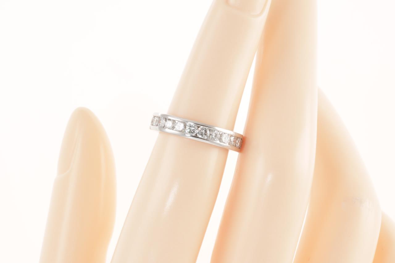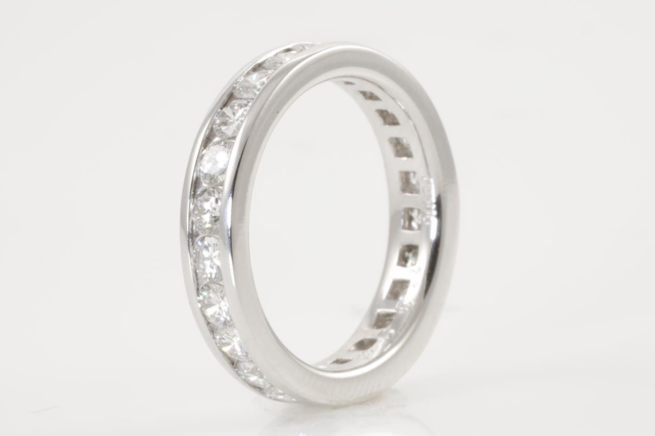 Diamond full hoop eternity ring with round Diamonds totalling 1.39cts (Estimated grading: G-H VS-SI). Platinum. Ring size I1/2 - ring resizing is not recommended. Weight: 5.7g. (Pre-owned)