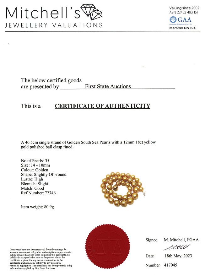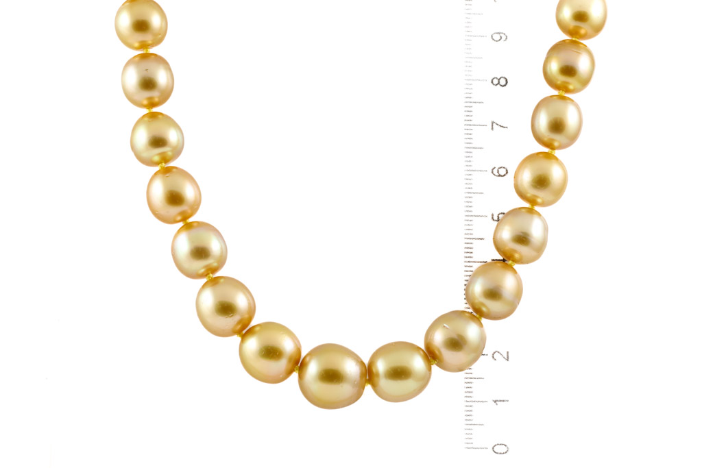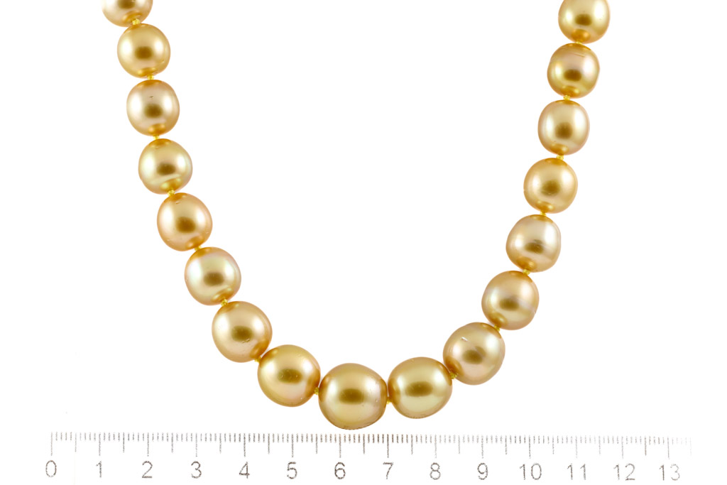 Pearl necklace with 35 Golden South Sea Pear of 14-10mm. 18ct yellow gold 12mm ball clasp. Length: 46.5cm. Weight: 80.9g. With Certificate #417045. (As new).
