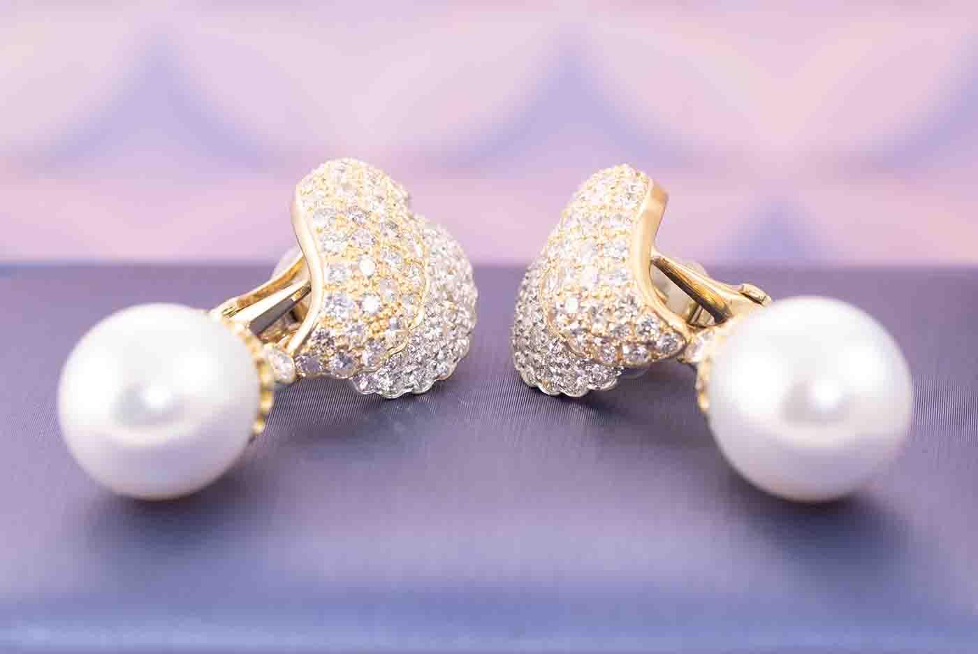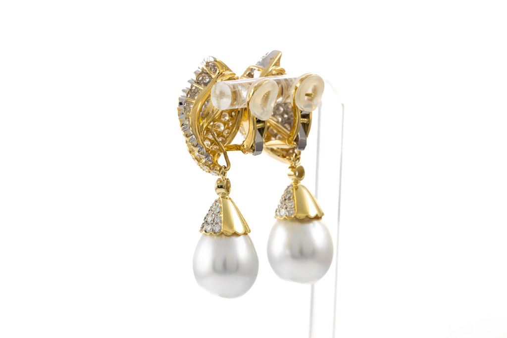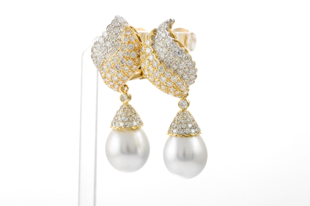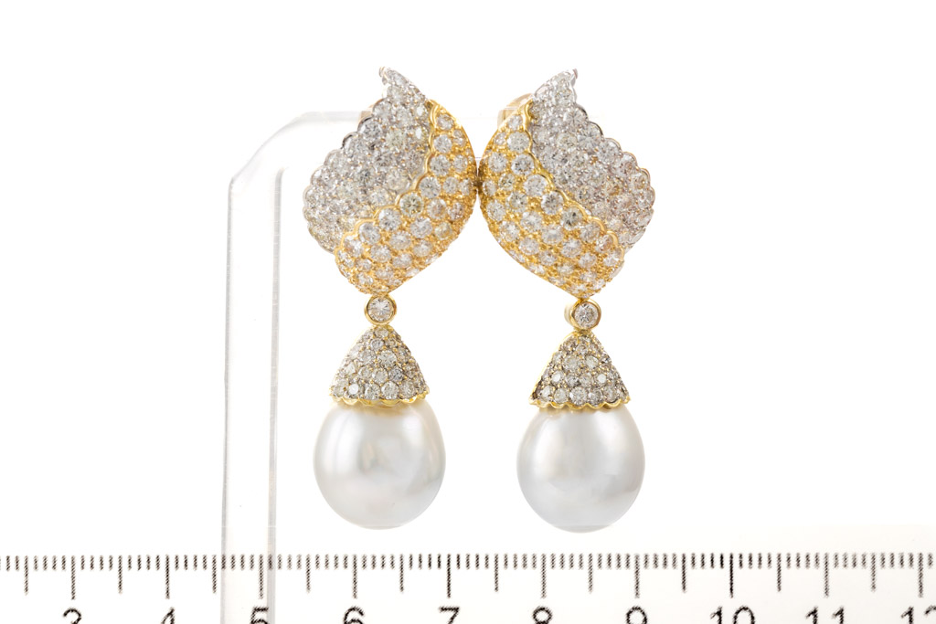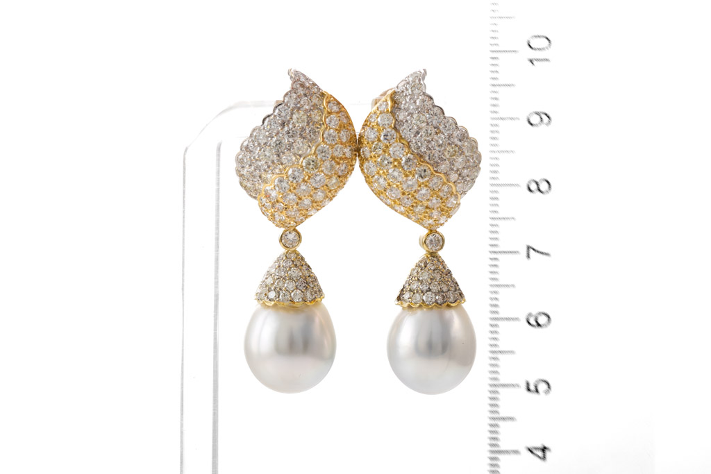 Pearl and Diamond earrings with drop shape South Sea Pearls of 14-14.5mm and round Diamonds totalling 6.85cts (Estimated grading: H-I SI). 18ct yellow gold. Weight: 31.4g. With Certificate #416819. (Pre-owned)