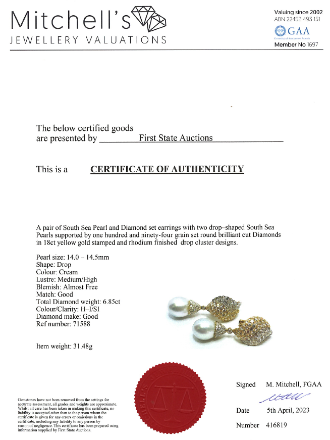 14-14.5mm South Sea Pearl & 6.85ct Diamond Earrings | First State Auctions