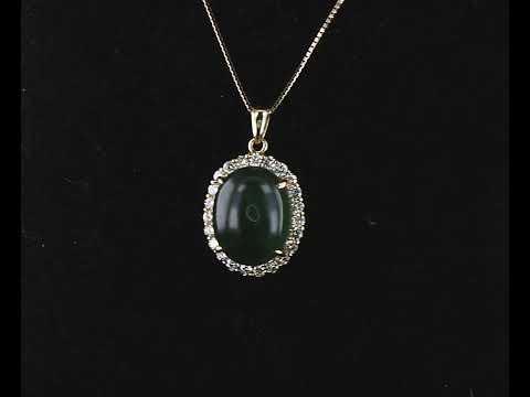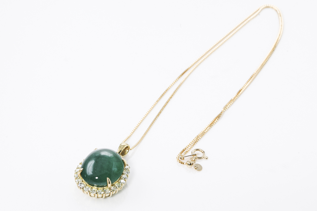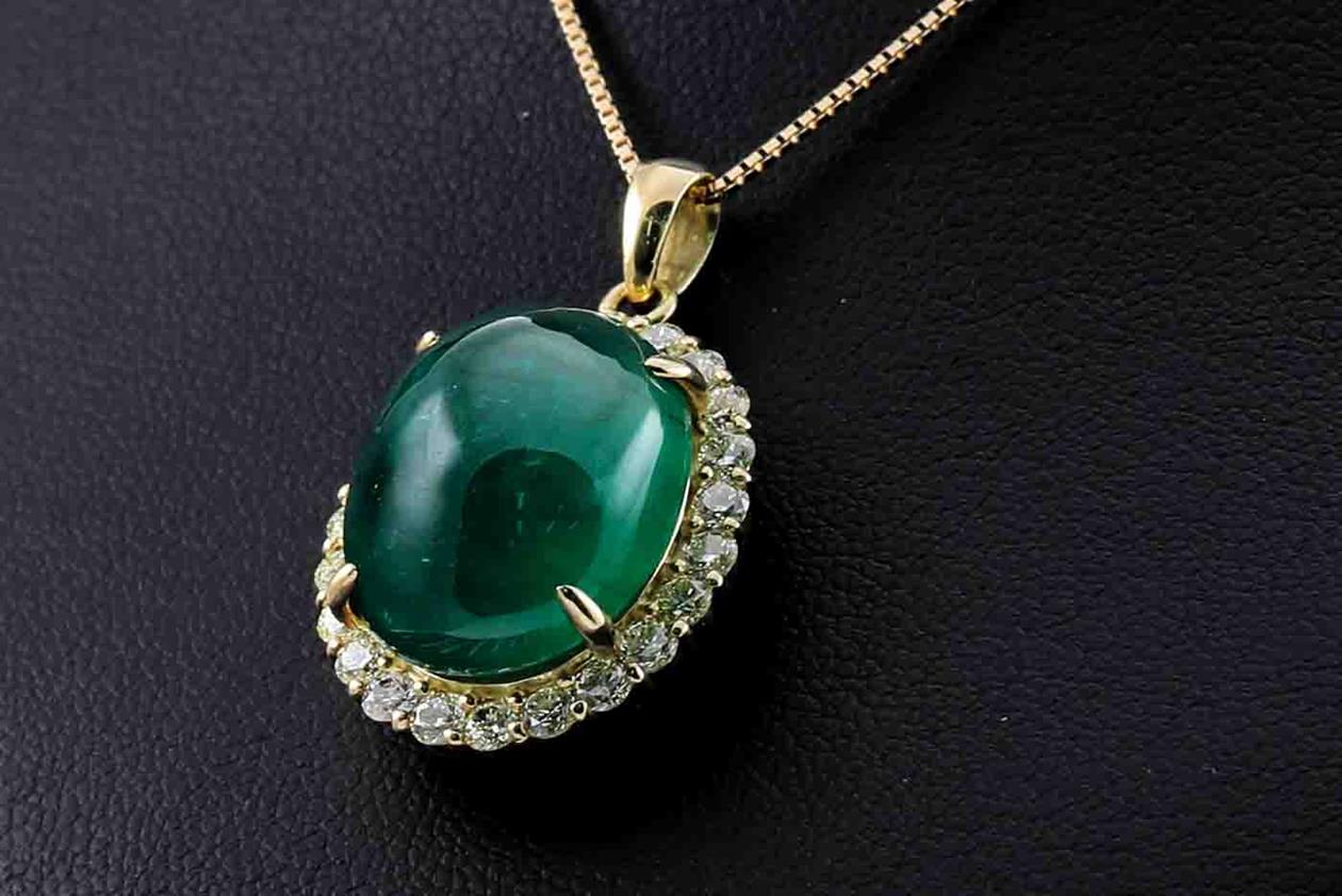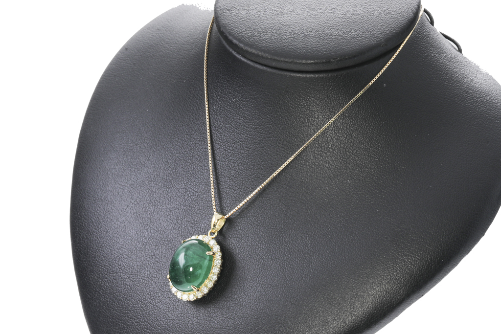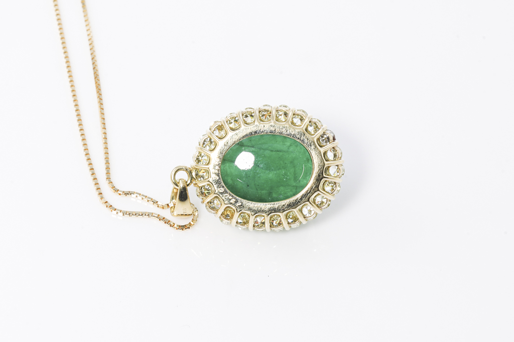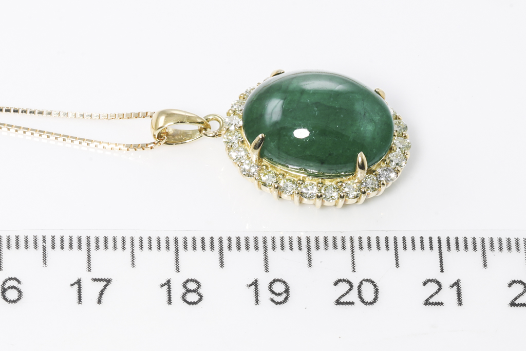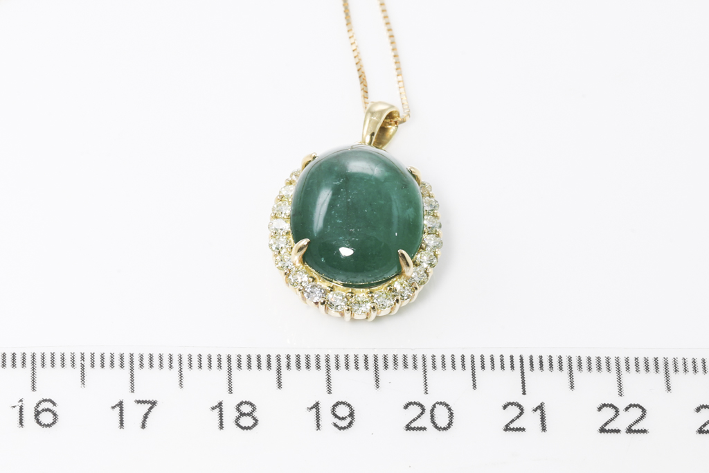 Emerald and Diamond pendant with oval cabochon cut emerald of 14.00ct and Diamonds totalling 1.19cts (Estimated grading: L-M SI). 18ct yellow gold with 44cm adjustable chain. Weight: 9.7g. With certificate #416371. (Pre-owned)