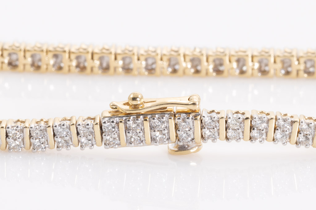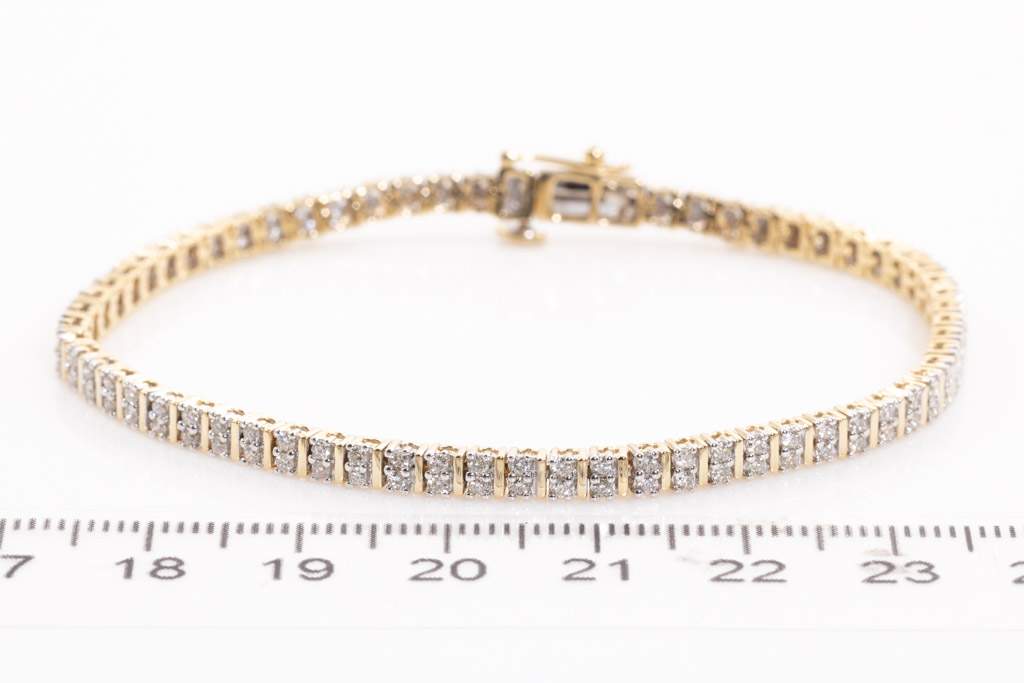 Diamond bracelet with 132 round Diamonds totalling 1.40cts (Estimated grading: H-I SI). 14ct yellow gold with rhodium plated claws. Length: 17.5cm. Weight: 8.9g. (New)