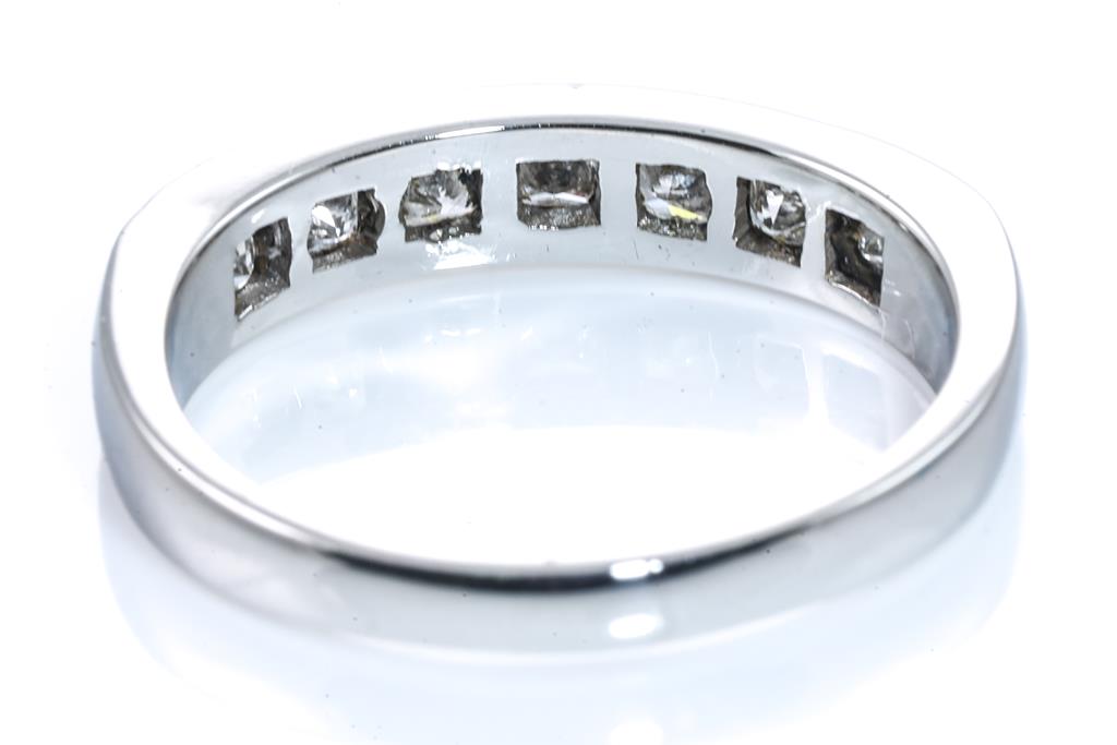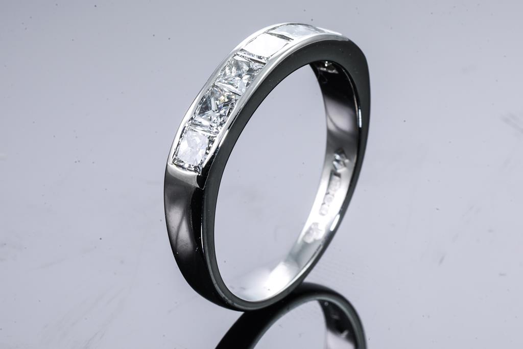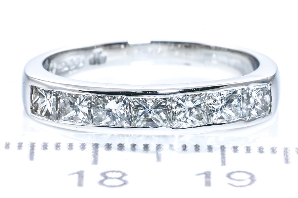 Diamond ring with princess cut Diamonds totalling approximately 1.40cts (Estimated grading H SI). Platinum. Ring size N. Weight 5.6g. (Pre-owned)