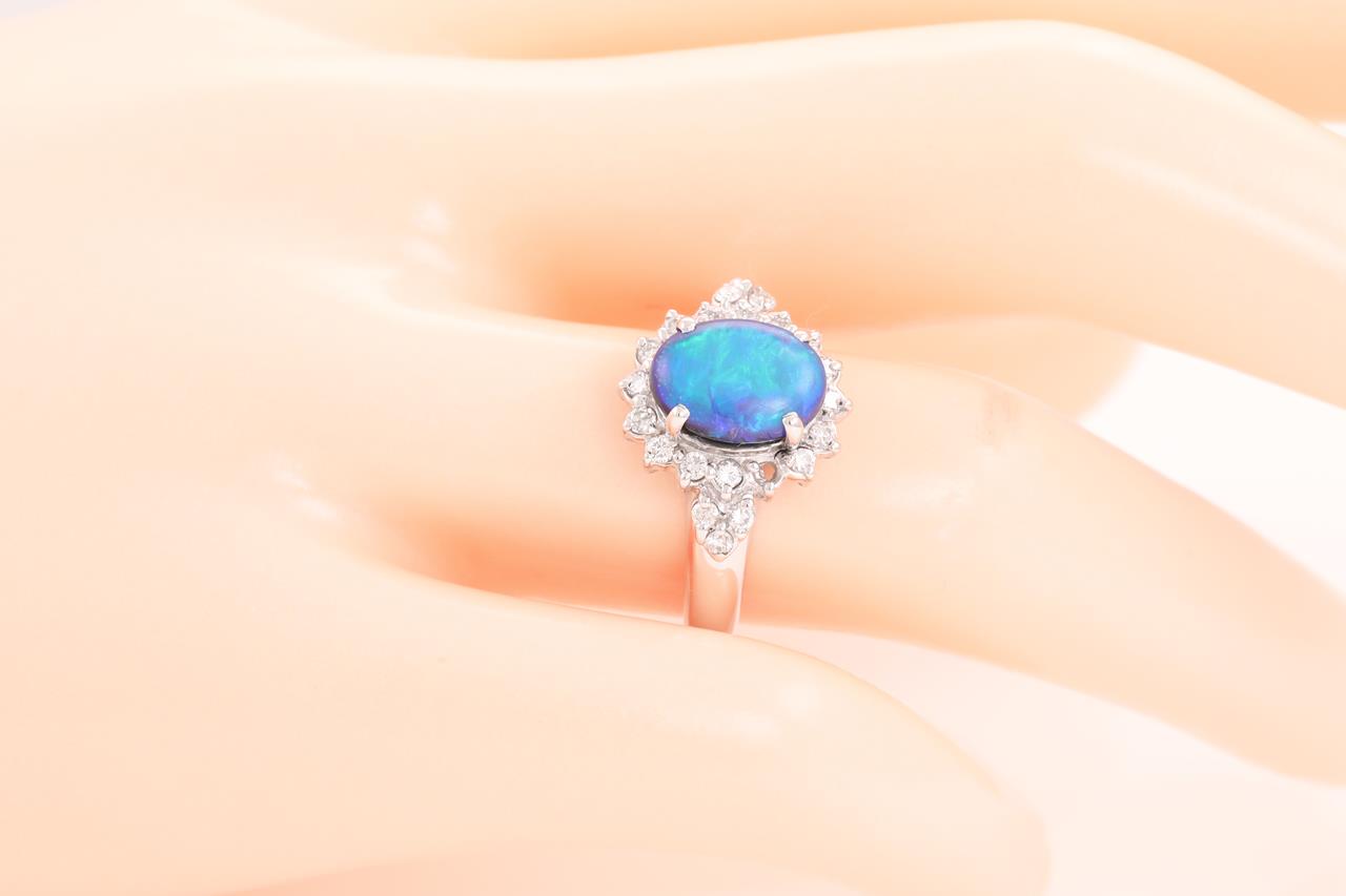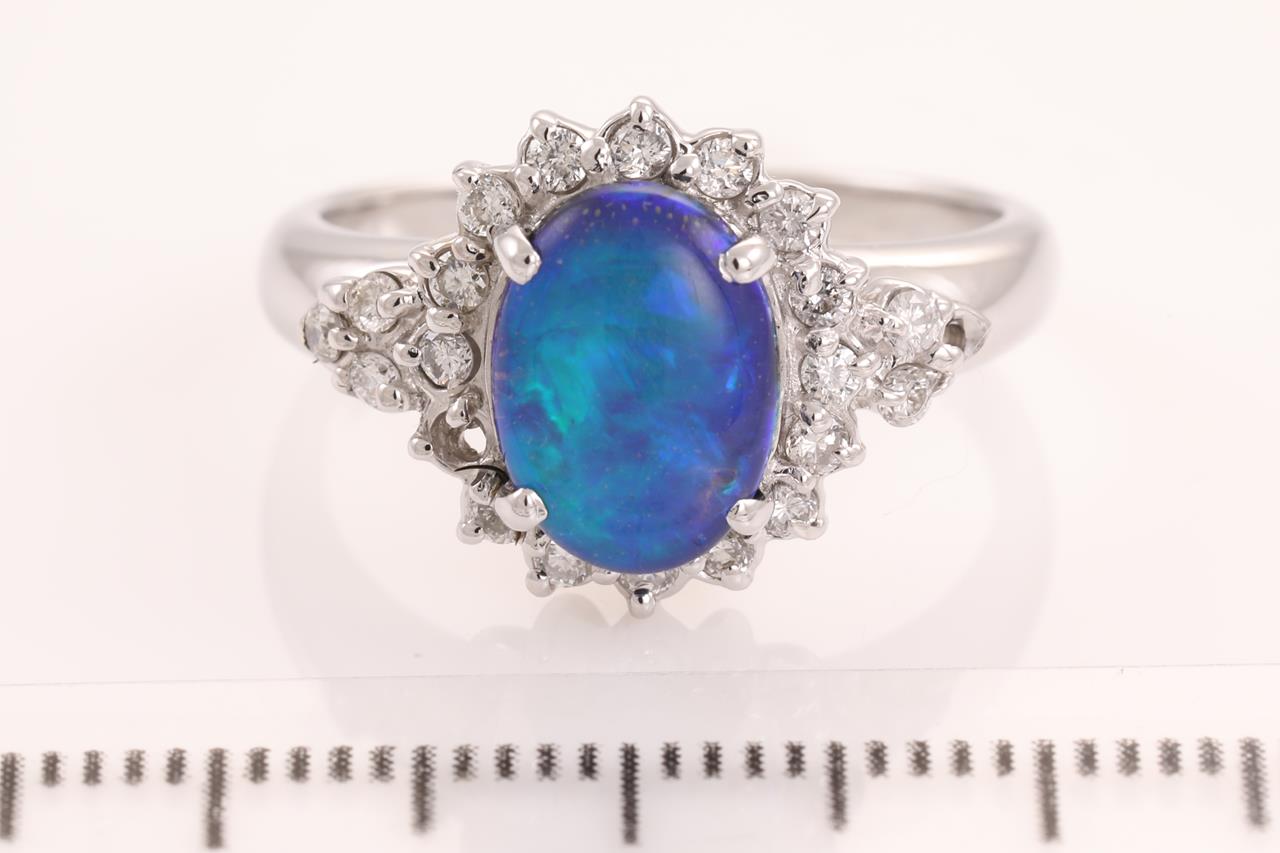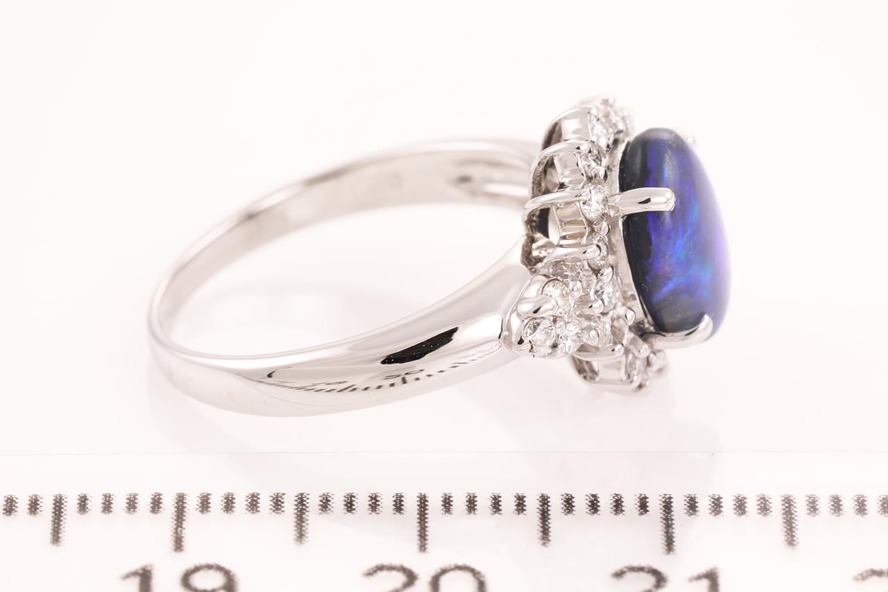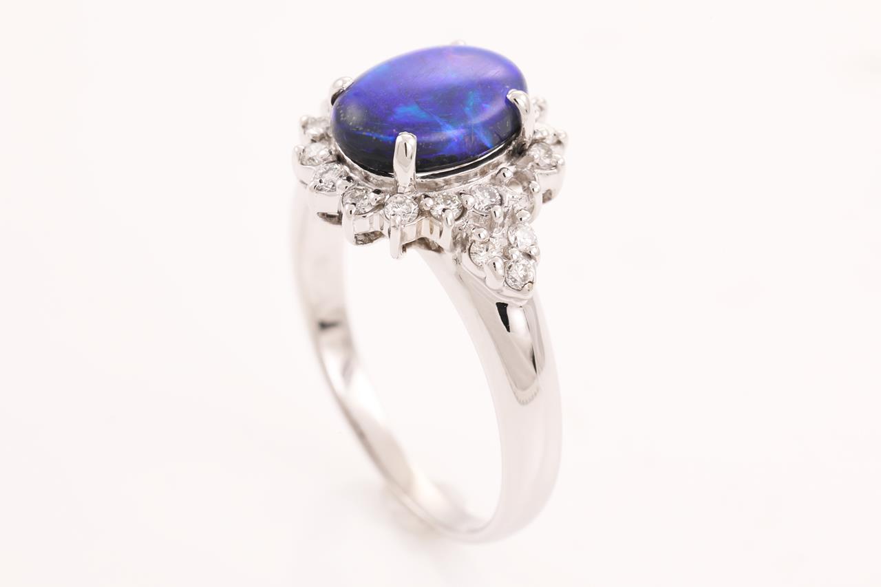 Opal and Diamond Ring with a black Opal of approximately 1.40ct and Diamonds totalling approximately 0.33cts (Estimated grading: G SI-P1). 18ct white gold. Ring size N. Weight: 5.0g (Pre-owned)
