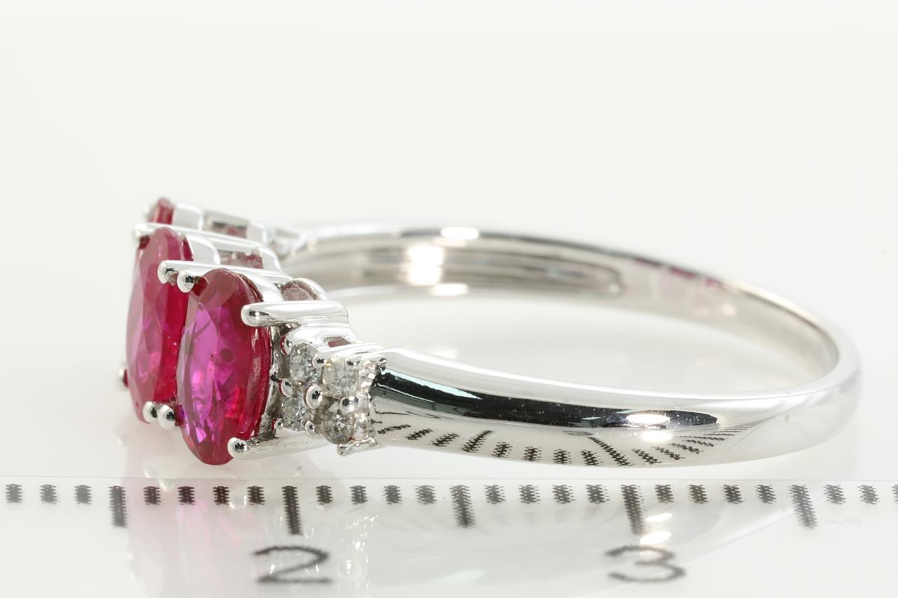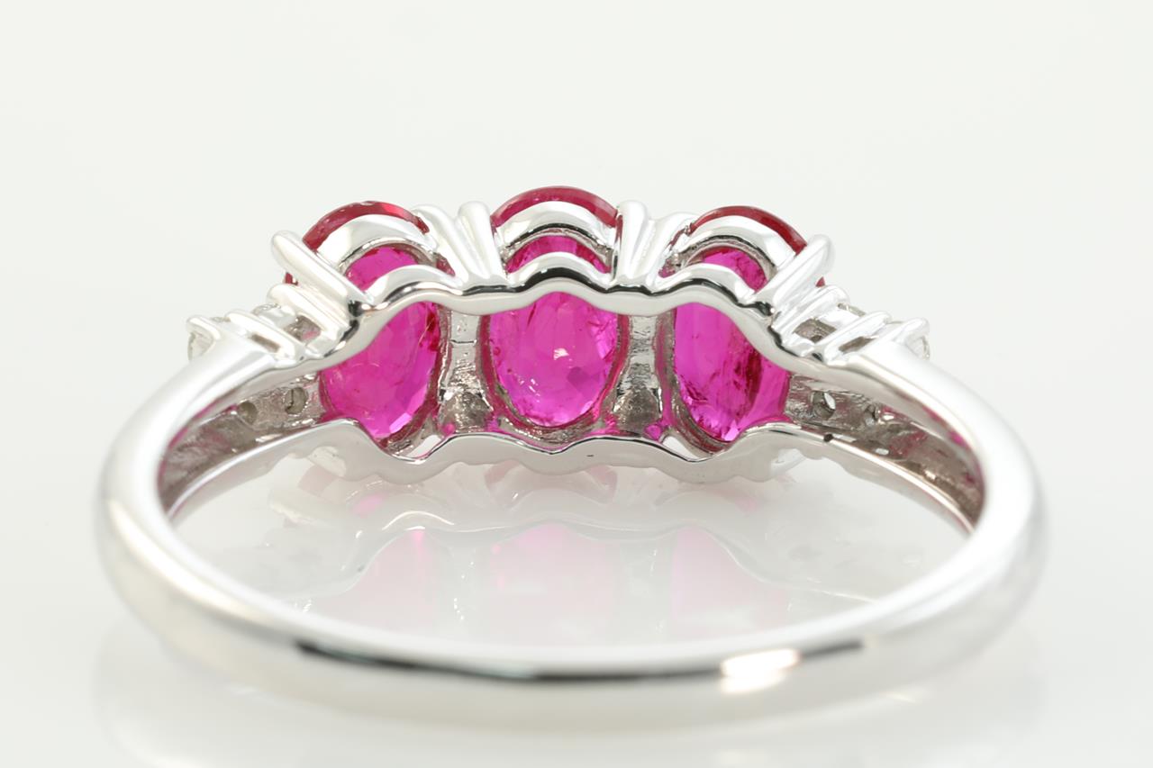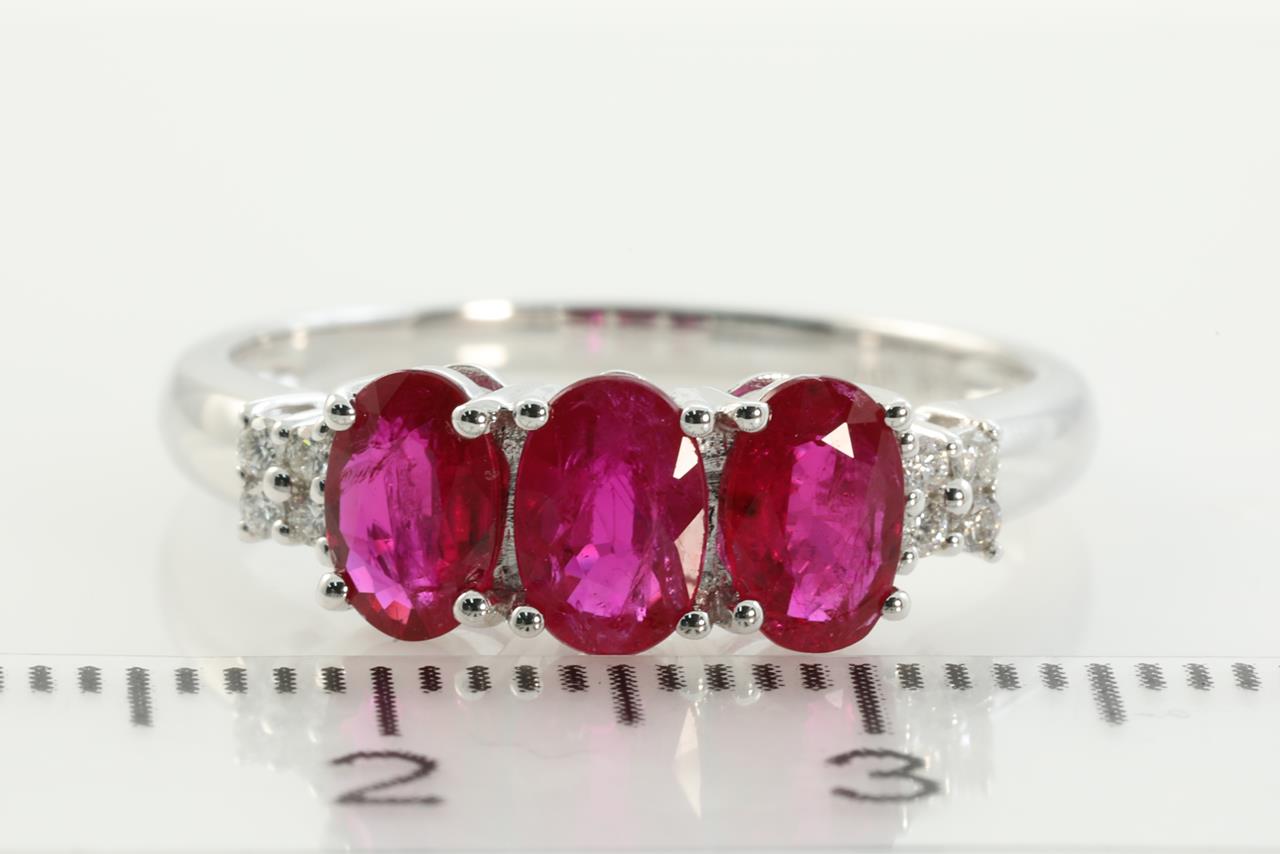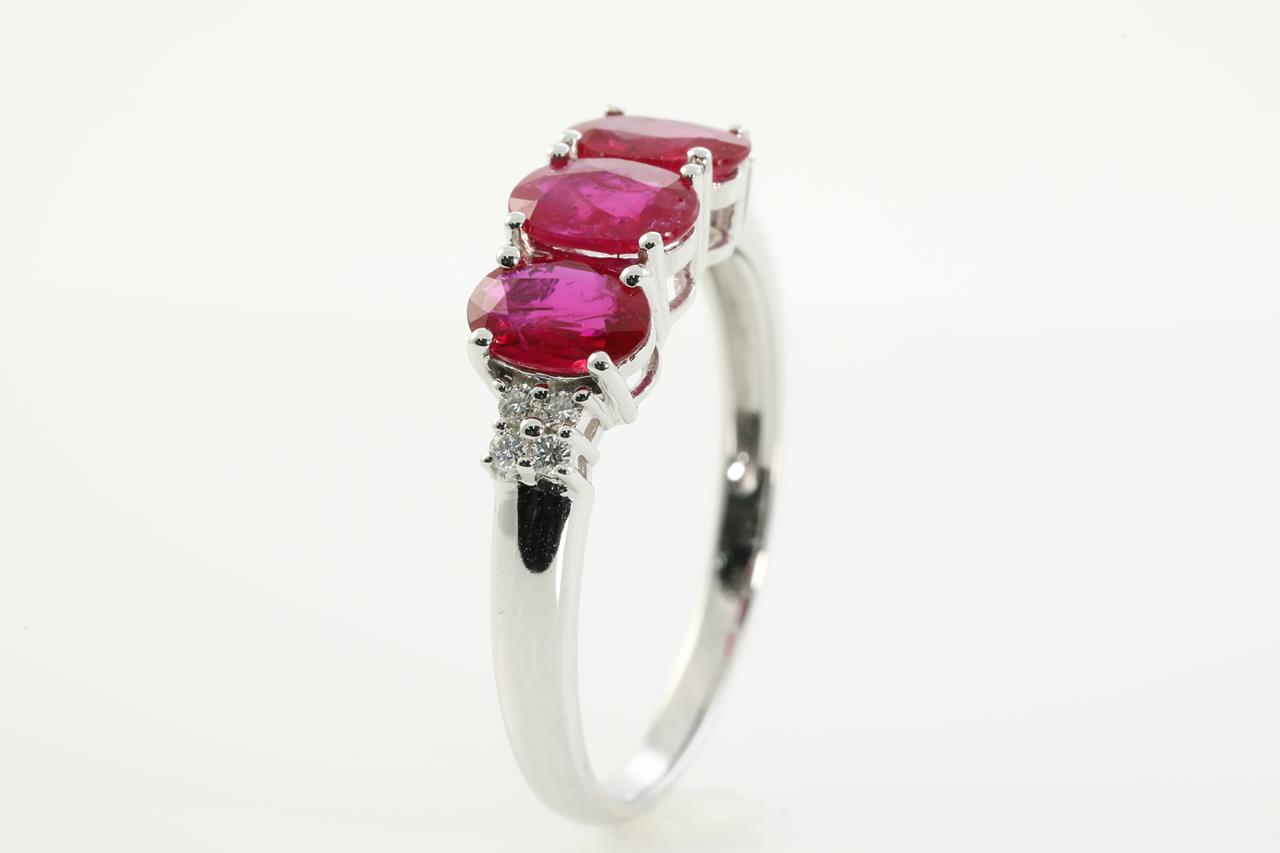 Ruby and Diamond ring with 3 oval Rubies totalling 1.40cts and Diamonds totalling 0.06cts. 14ct white gold. Ring size N. Weight: 2.3g (As New)