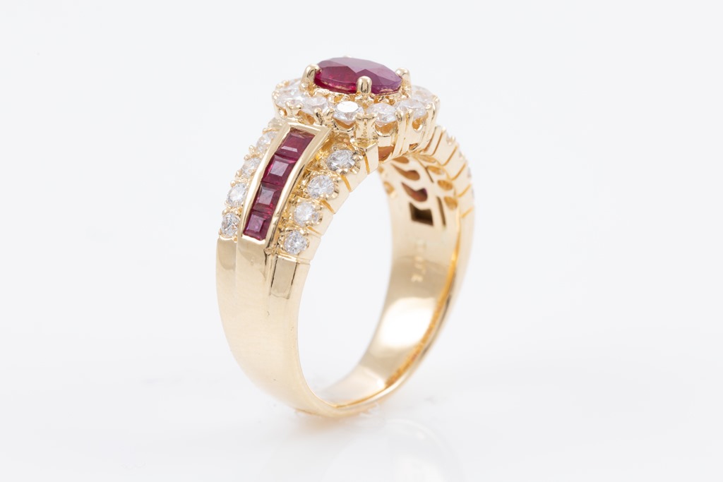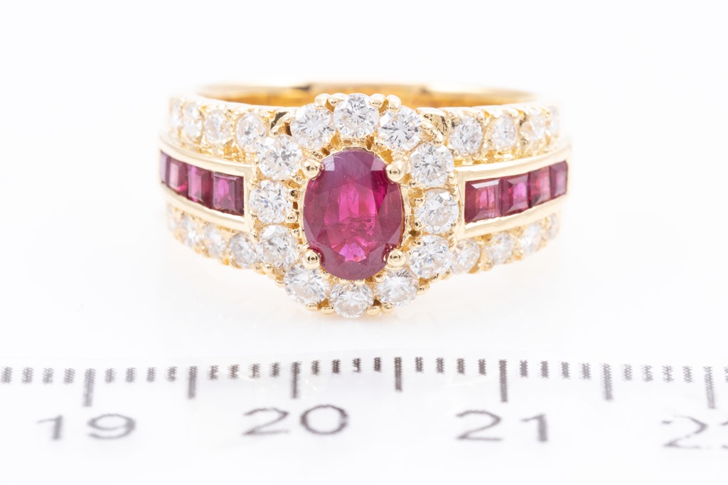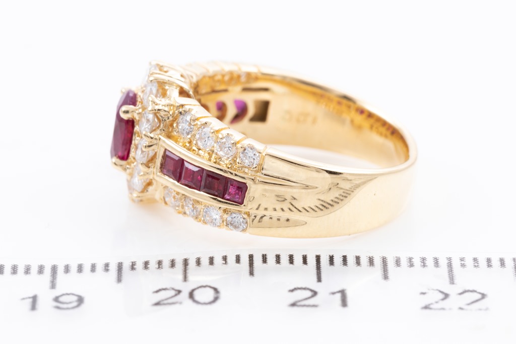 Ruby and Diamond Ring with oval & carre cut Rubies totalling 1.40cts and round Diamonds totalling 1.00cts (Estimated grading: H SI). 18ct yellow gold. Ring size M1/2 - ring resizing is not recommended. Weight: 8.4g. (Pre-owned)