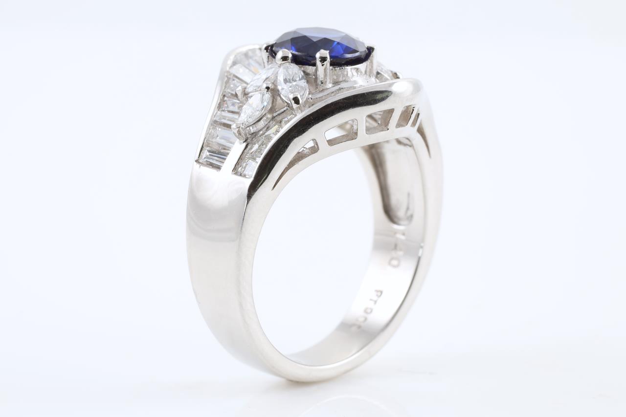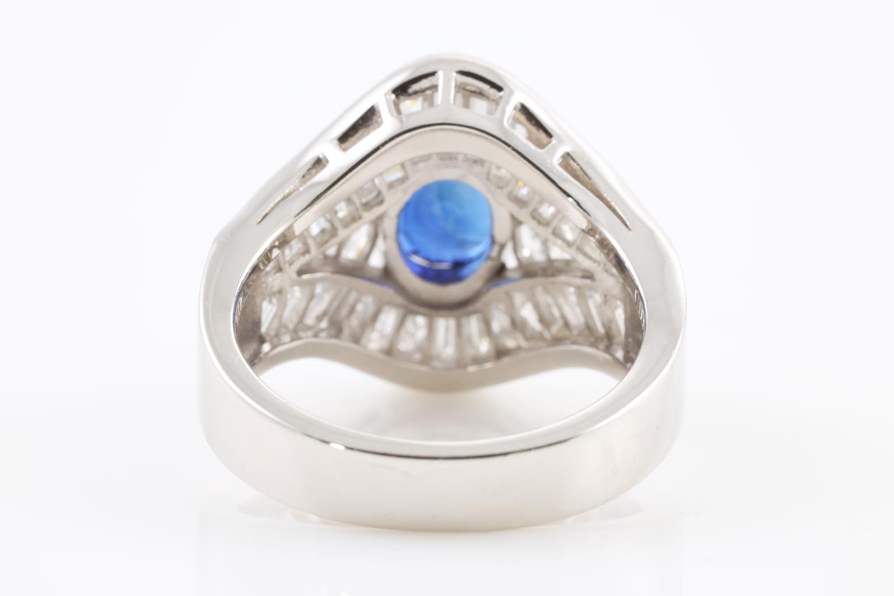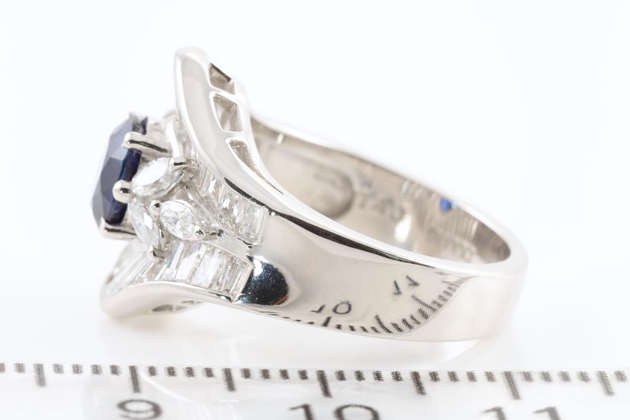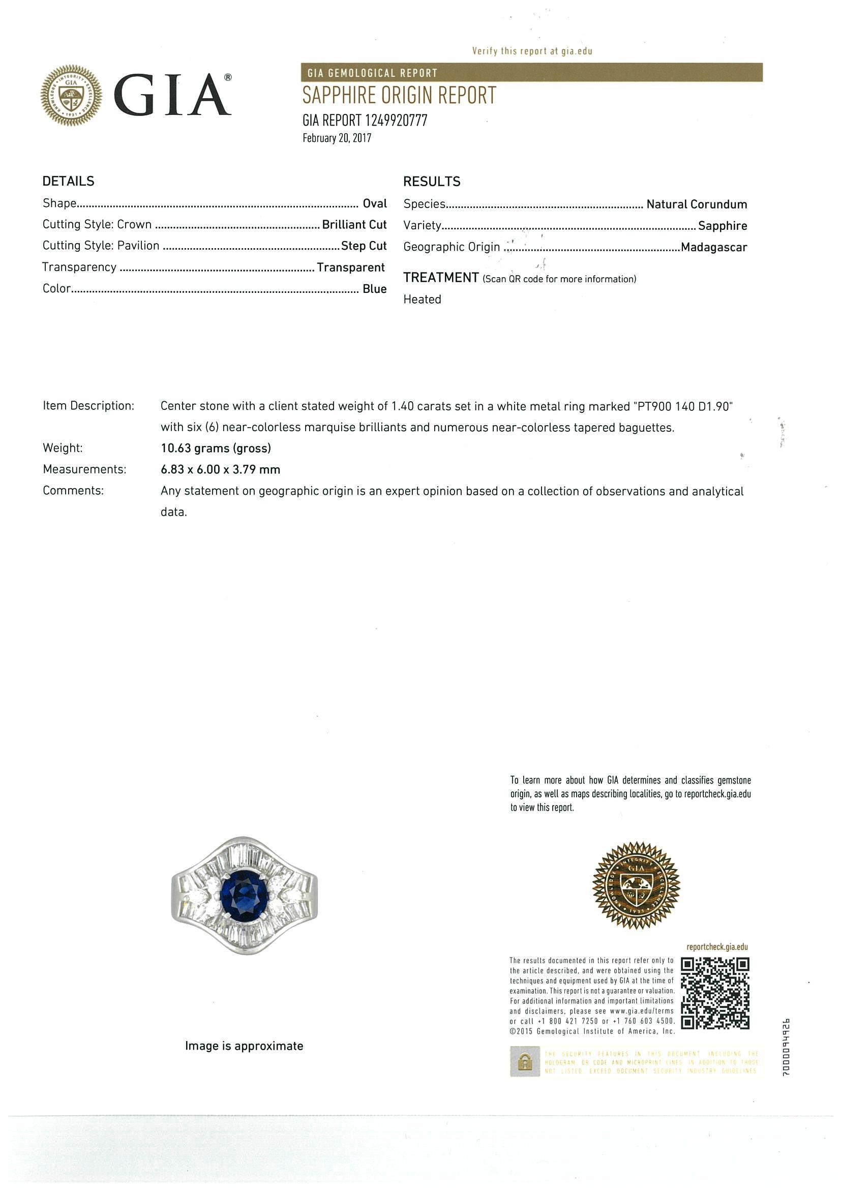 Sapphire and Diamond ring with oval shape Natural Blue Sapphire of 1.40ct (with GIA report #1249920777) and baguette and marquise cut Diamonds totalling 1.90cts (Estimated grading: F-G VS-SI). Platinum. Ring size: K1/2 – Ring resizing is not recommended. Weight: 10.6g (Pre-owned)