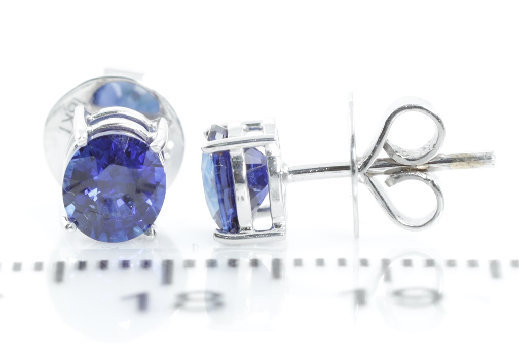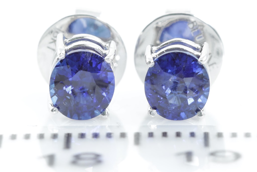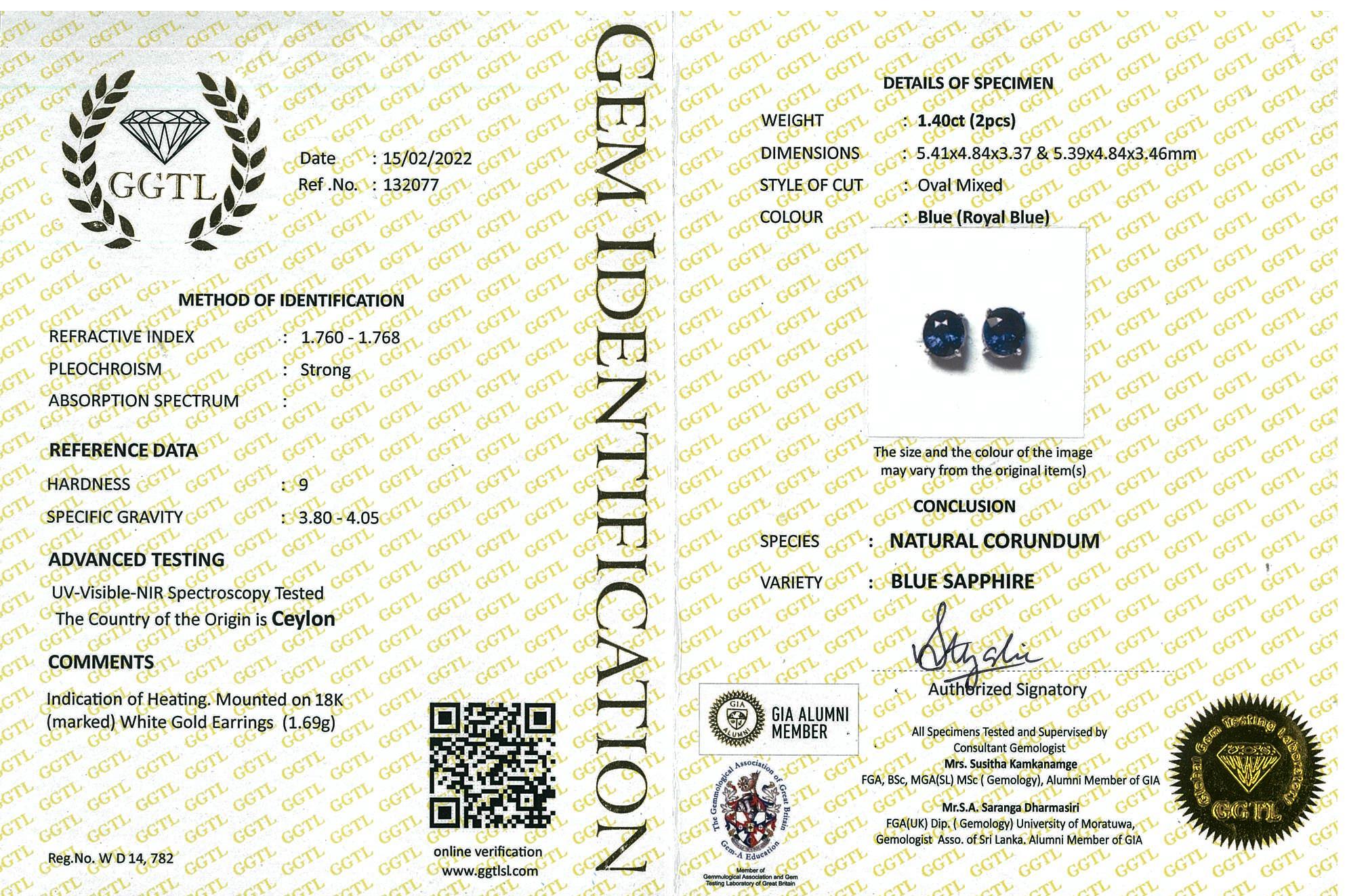 Sapphire stud earrings with oval cut Royal Blue Ceylon Sapphires totalling 1.40cts. 18ct white gold. Weight 1.6g. With GGTL report #132077. (As New)