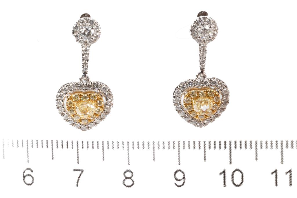 Diamond earrings with 2 centre heart shaped diamonds totalling 0.48cts (Estimated grading: light yellow SI) and remaining yellow & white Diamonds totalling 0.92cts (Estimated grading: light yellow-G-H SI). 22ct yellow and 18ct white gold. Weight: 6.4g. (As New)