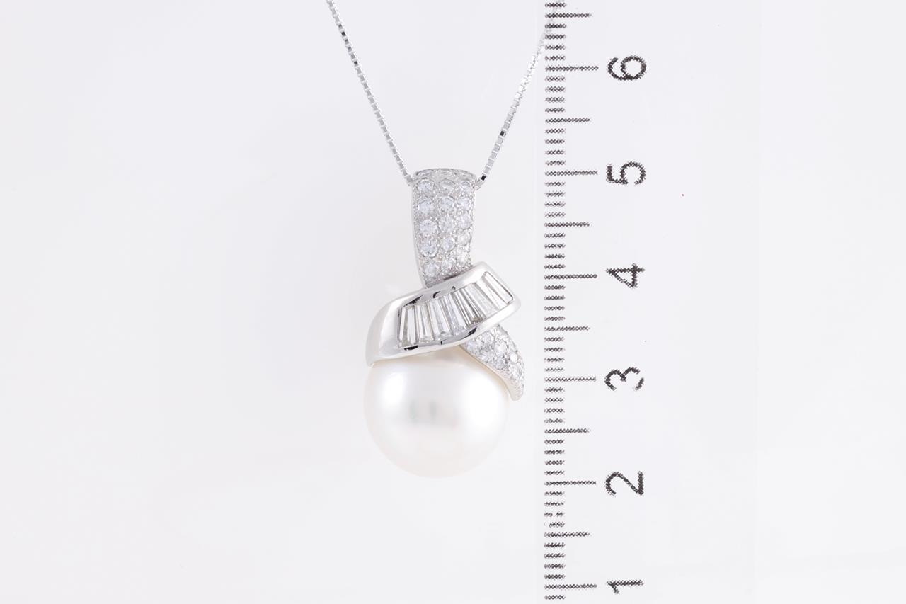 Pearl and Diamond pendant with South Sea Pearl of 14.0mm with baguette and round Diamonds totalling 0.93cts (Estimated grading: G-H VS-SI). Platinum with 18ct white gold 45cm adjustable chain. Weight: 13.2g (Pre-owned)