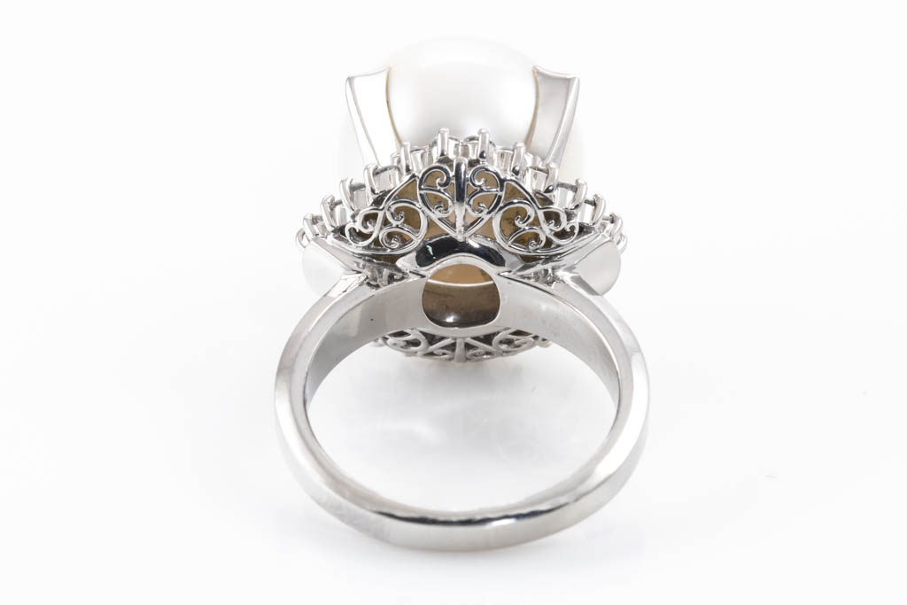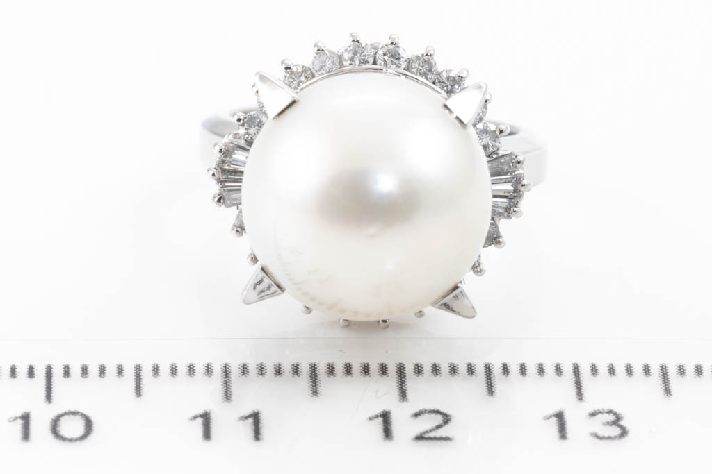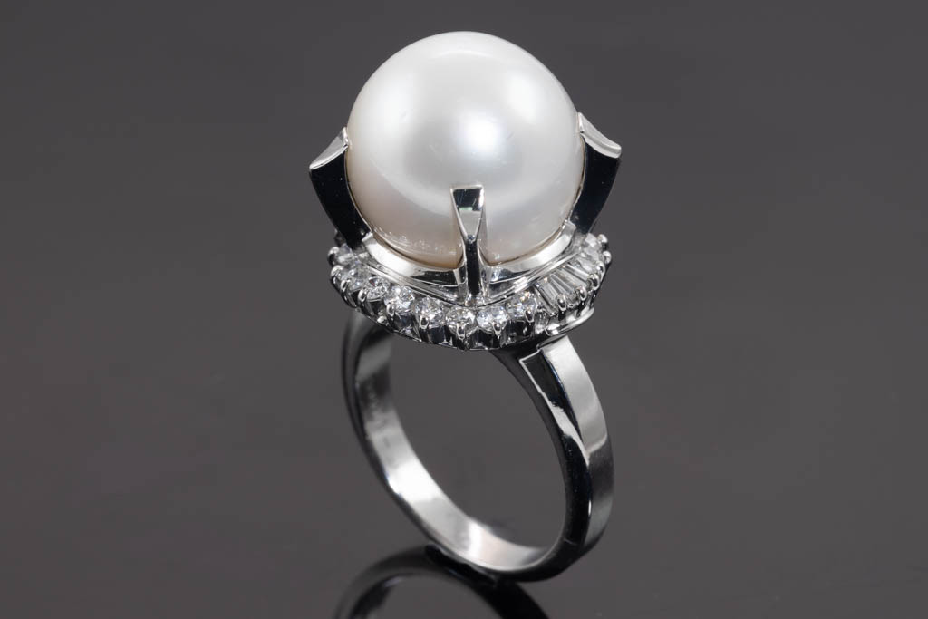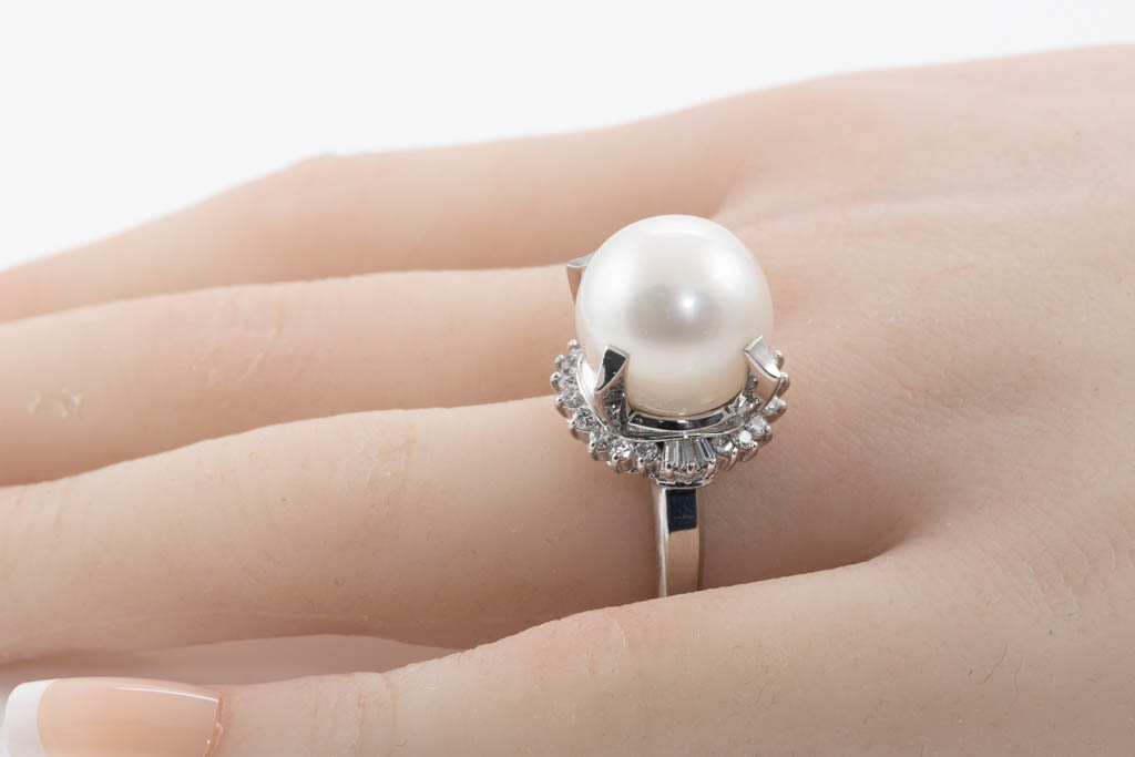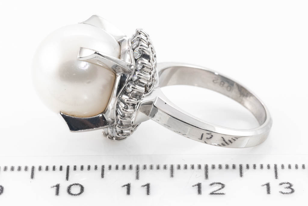 Pearl and Diamond ring with White South Sea Pearl of 14.0mm and round & baguette cut Diamonds totalling 0.82cts (Estimated grading: G VS-SI). Platinum. Ring size M. Weight: 15.8g. (Pre-owned)