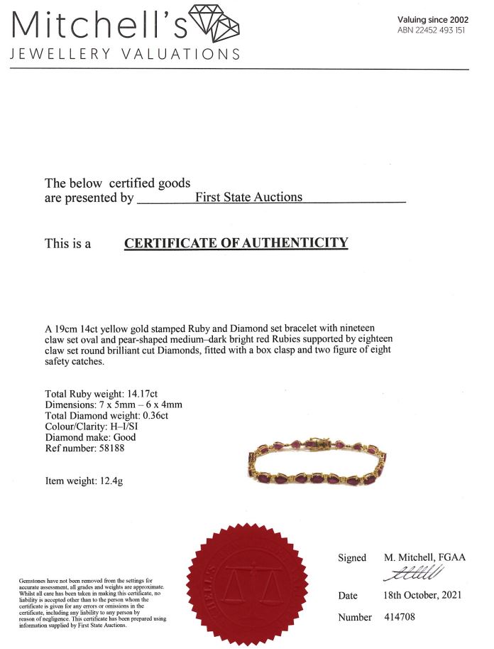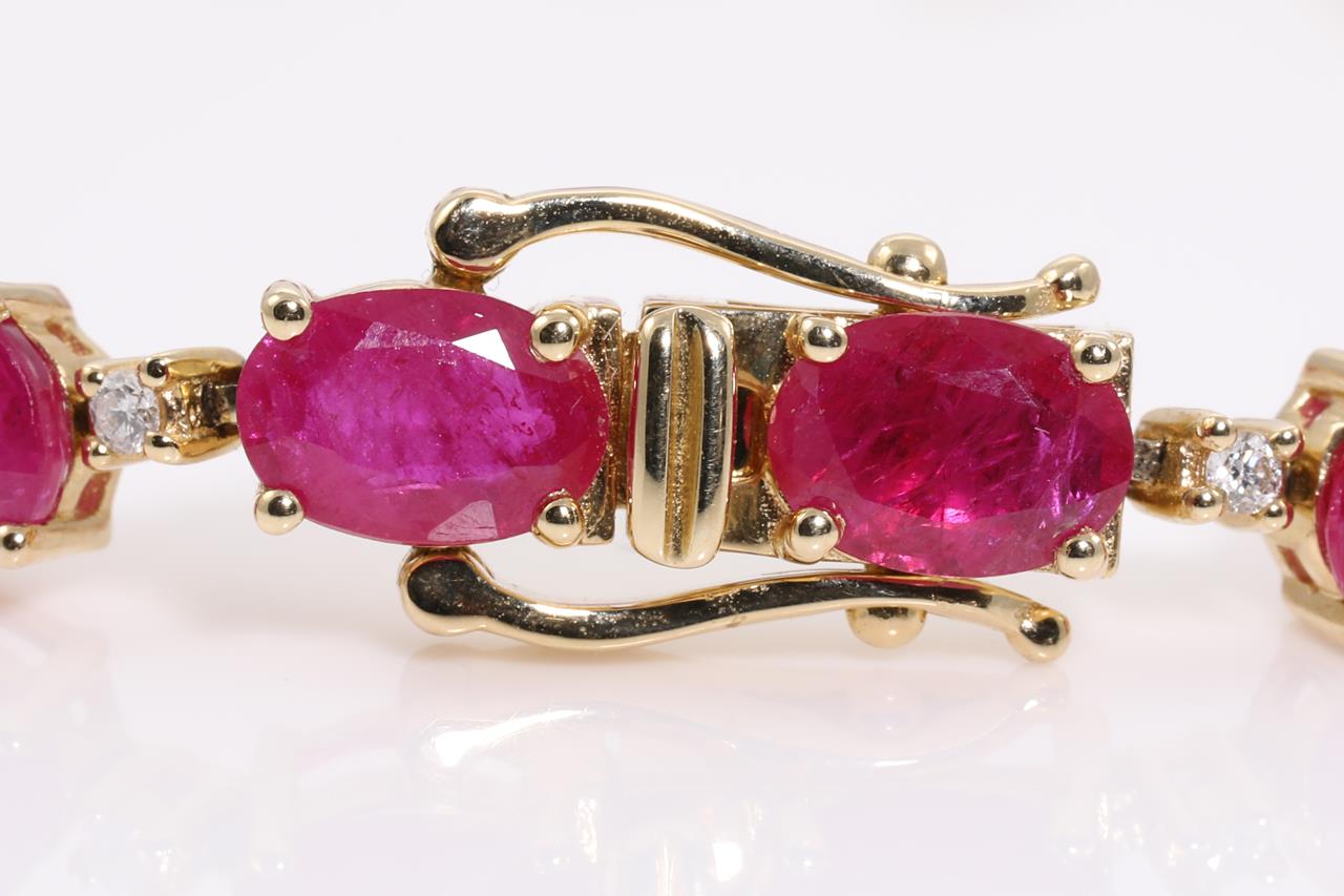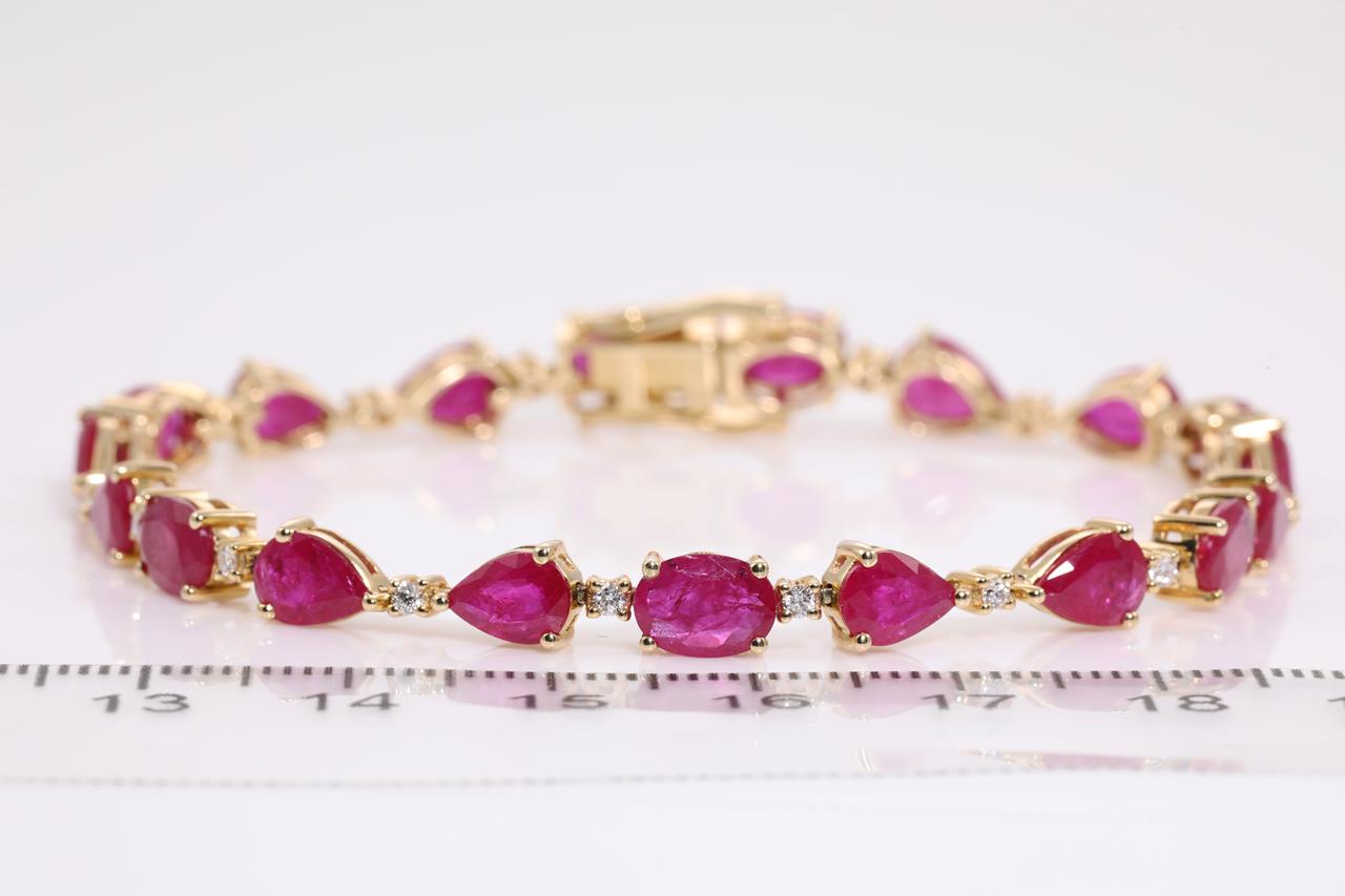 Ruby and Diamond bracelet with pear and oval shape Rubies totalling 14.17cts and Diamonds totalling 0.36cts (Estimated grading: H-I SI). 14ct yellow gold. Length: 19cm Weight: 12.4g. With Certificate #414708. (As new)