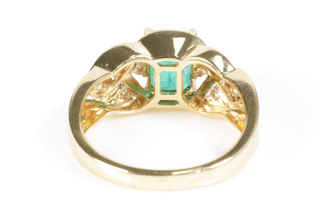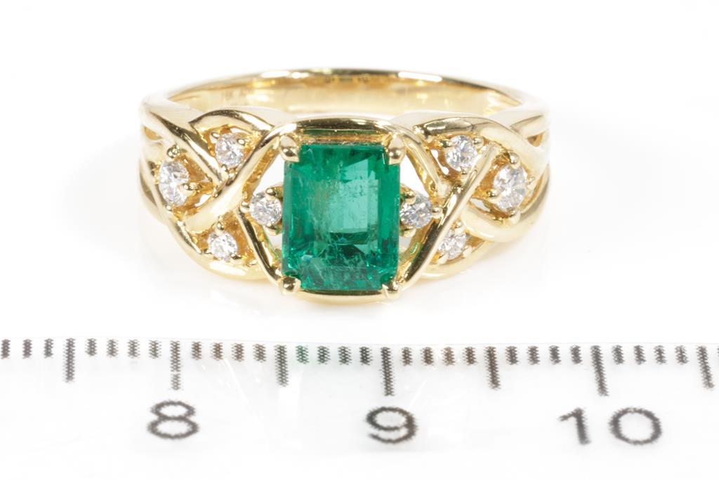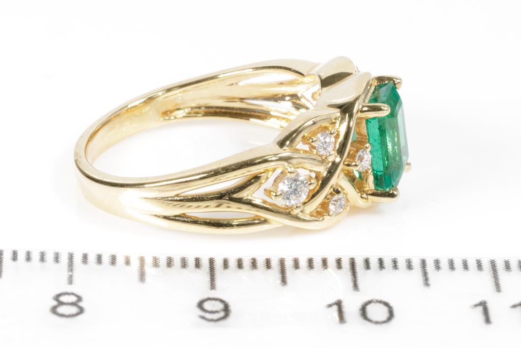 Emerald and Diamond ring with an emerald cut Emerald of 1.41ct and round Diamonds totalling 0.23cts. 18ct yellow gold. Ring size N1/2 - ring resizing is not recommended. Weight: 5.0g. (As new)