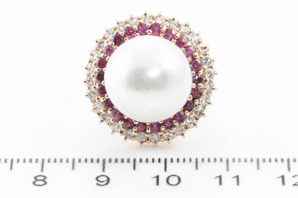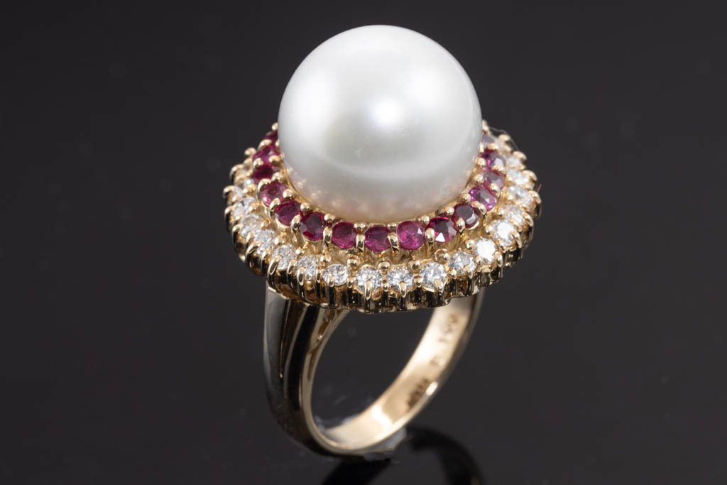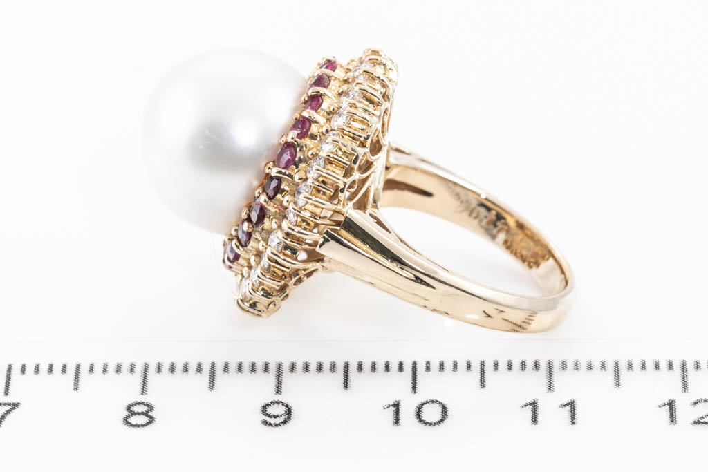 Pearl, Ruby and Diamond ring with South Sea Pearl of 14.1mm, round Rubies totalling 1.00cts and round Diamonds totalling 0.77cts (Estimated grading: G VS). 18ct yellow gold. Ring size L172. Weight: 17.9g. (Pre-owned)