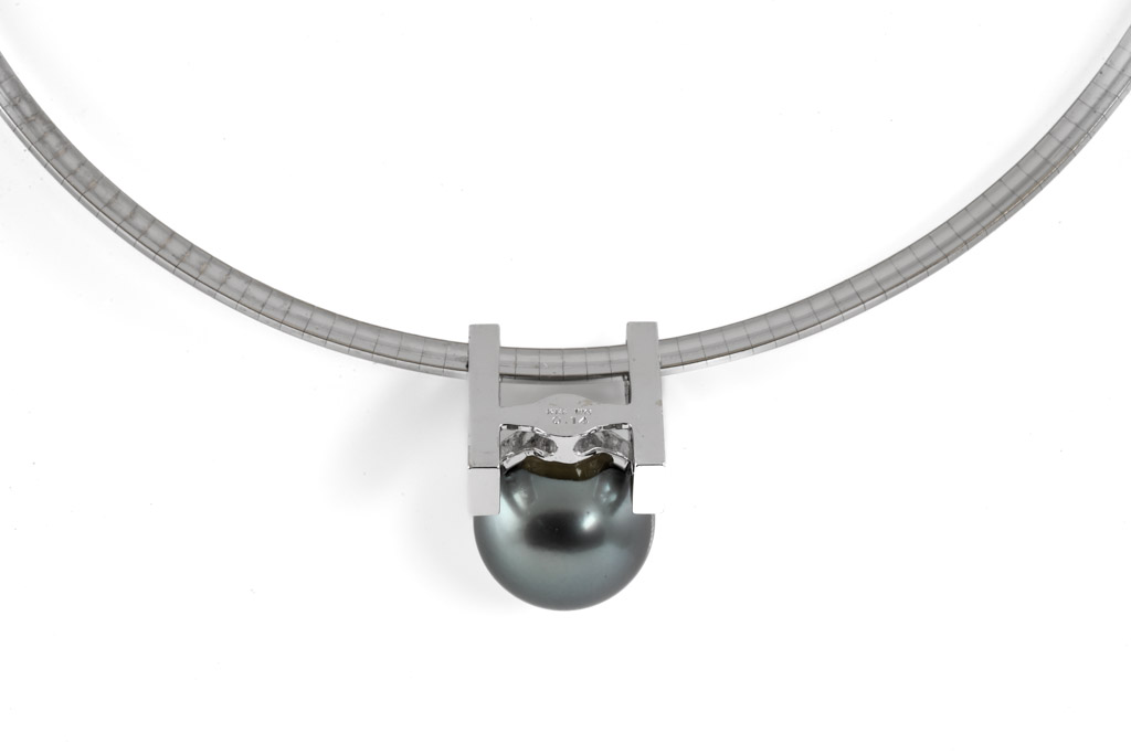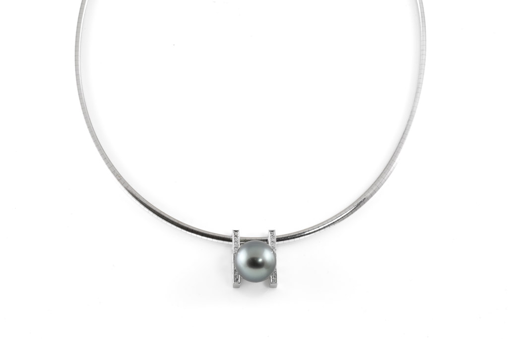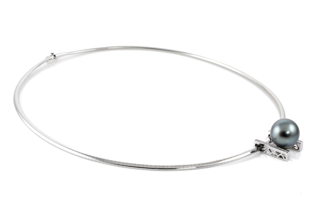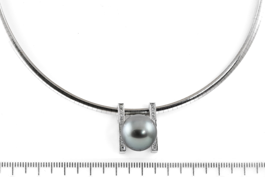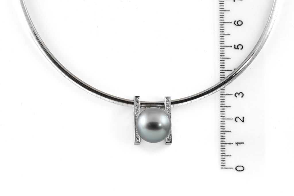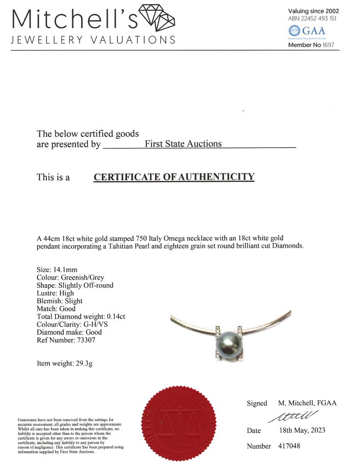Pearl and Diamond pendant with Tahitian Pearl of 14.1mm and round Diamonds totalling 0.14cts. 18ct white gold with 44cm 18ct white gold omega style chain. Weight: 29.3g. With Certificate #417048. (Pre-owned)