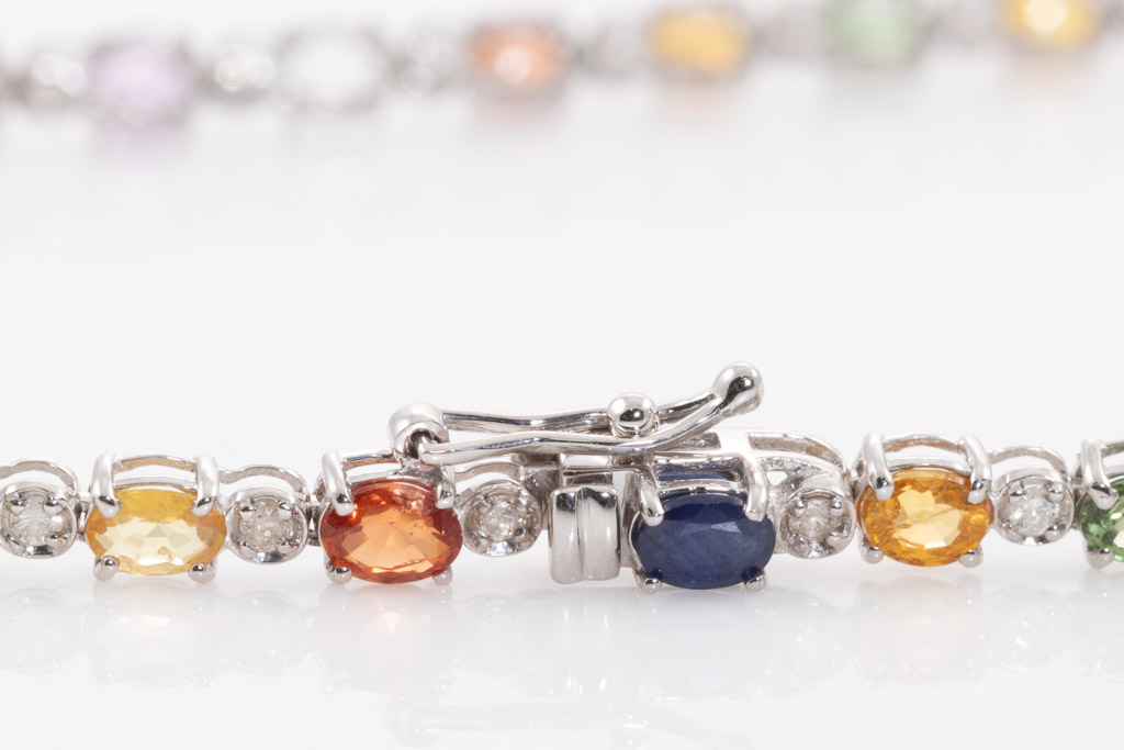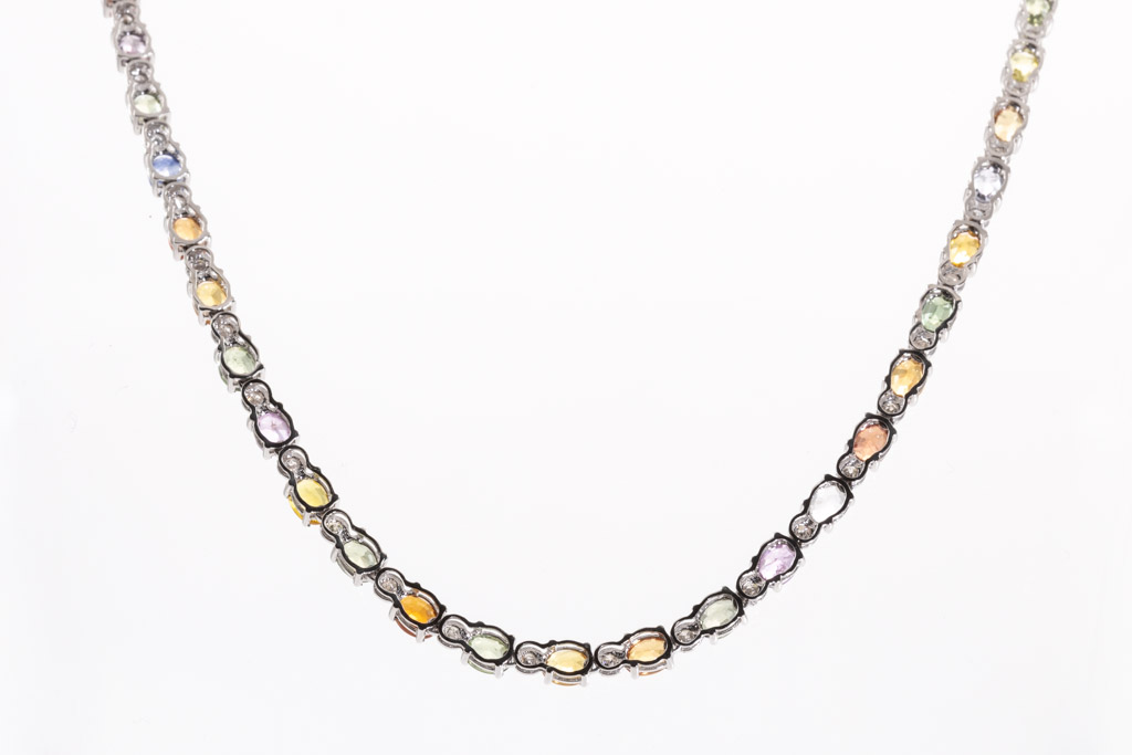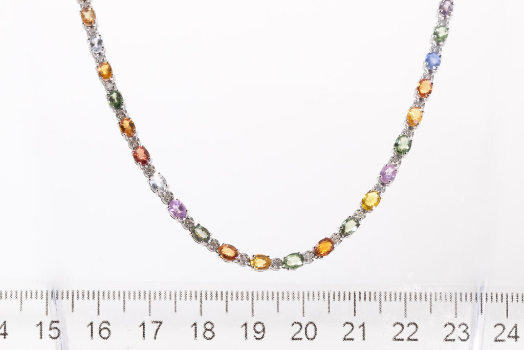 Multi-coloured Sapphire and Diamond necklace with multi-colouredd oval shape Sapphires totalling 14.23 and round Diamonds totalling 0.90cts (Estimated grading: H-I SI). 18ct white gold with 42cm. Weight: 12.9g. With certificate #416551. (Pre-owned)