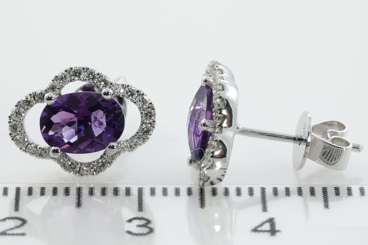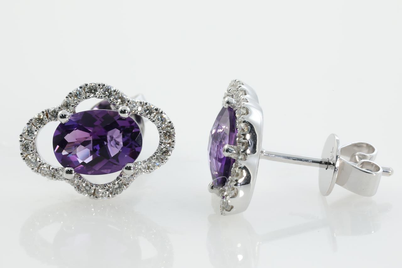 Amethyst and Diamond earrings with oval shape Amethysts totalling 1.42ct and Diamonds totalling 0.32cts (Estimated grading: H SI) 14ct white gold. Weight: 2.3g (New)