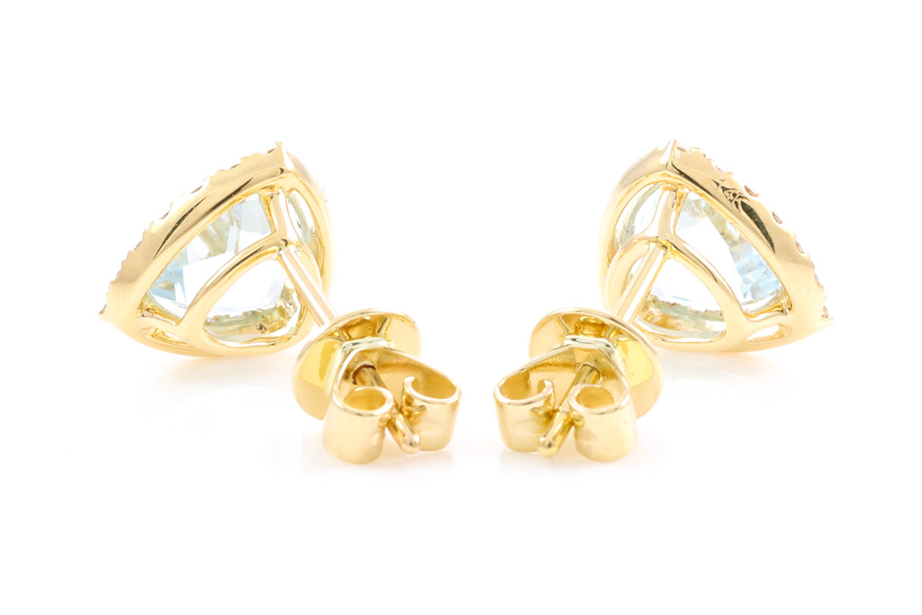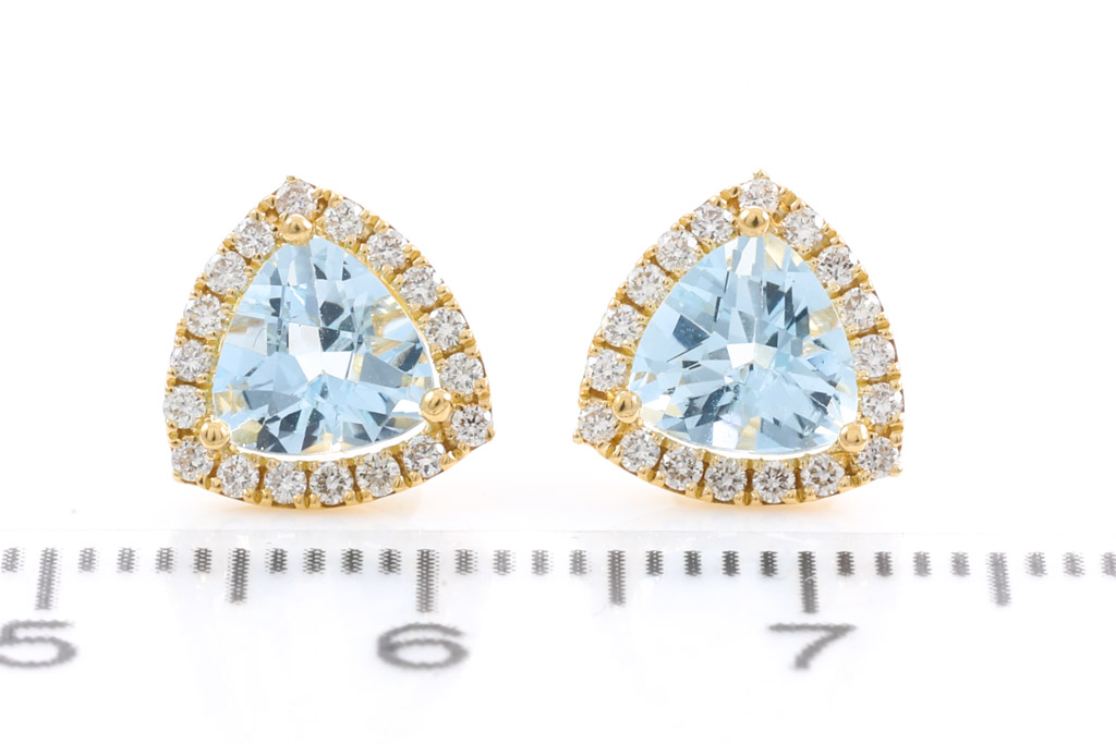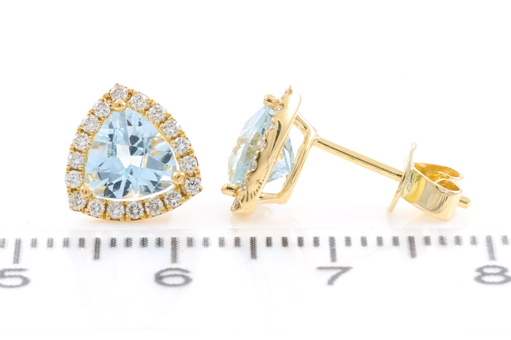 Aquamarine and Diamond earrings with trilliant cut Aquamarines totalling 1.42cts and round Diamonds totalling 0.24cts. 14ct yellow gold. Weight: 2.0g. (New).