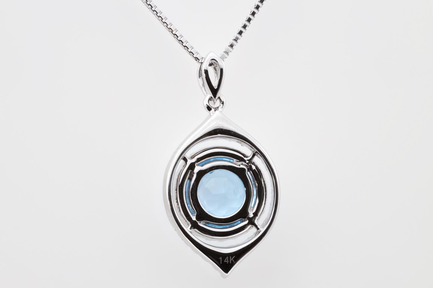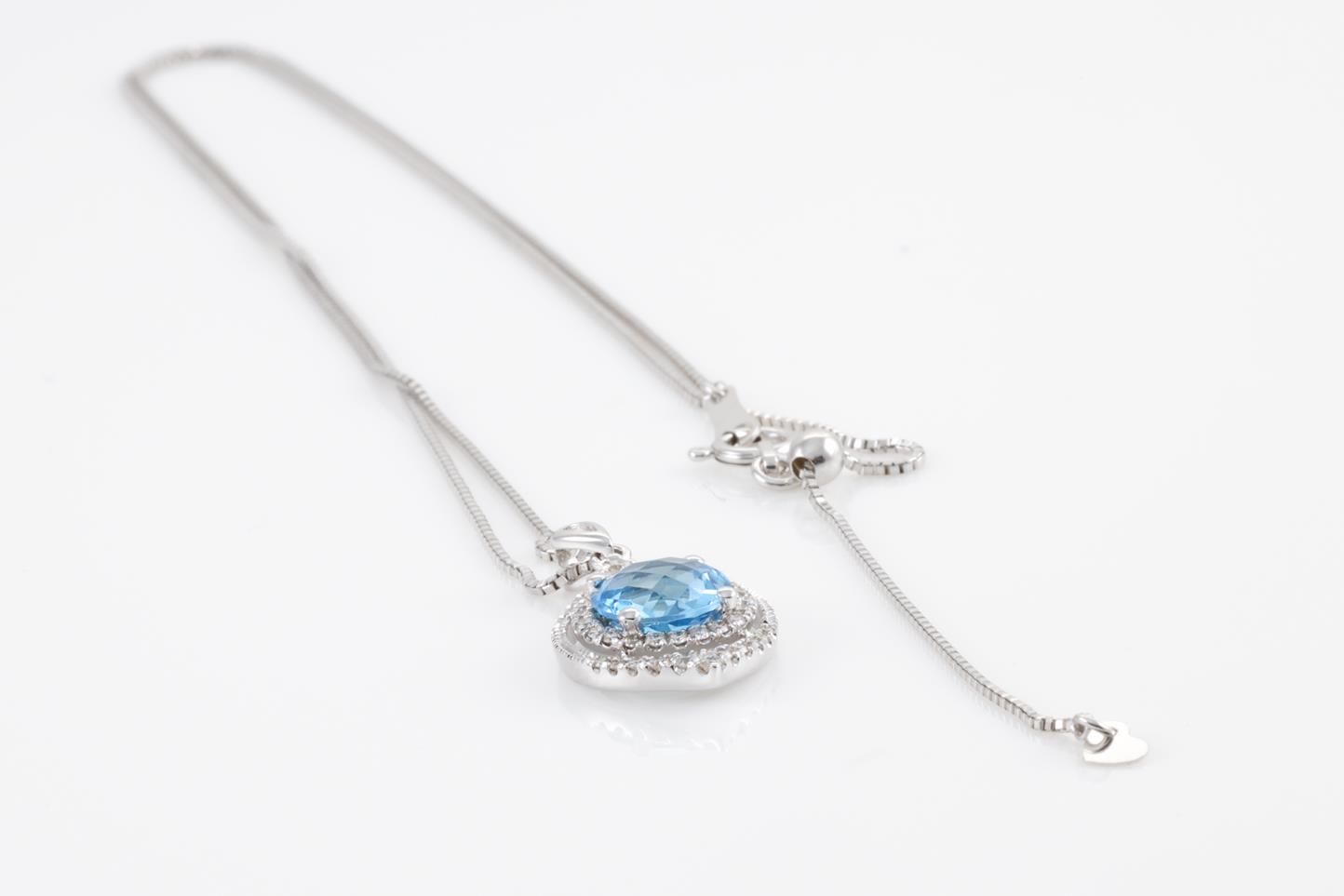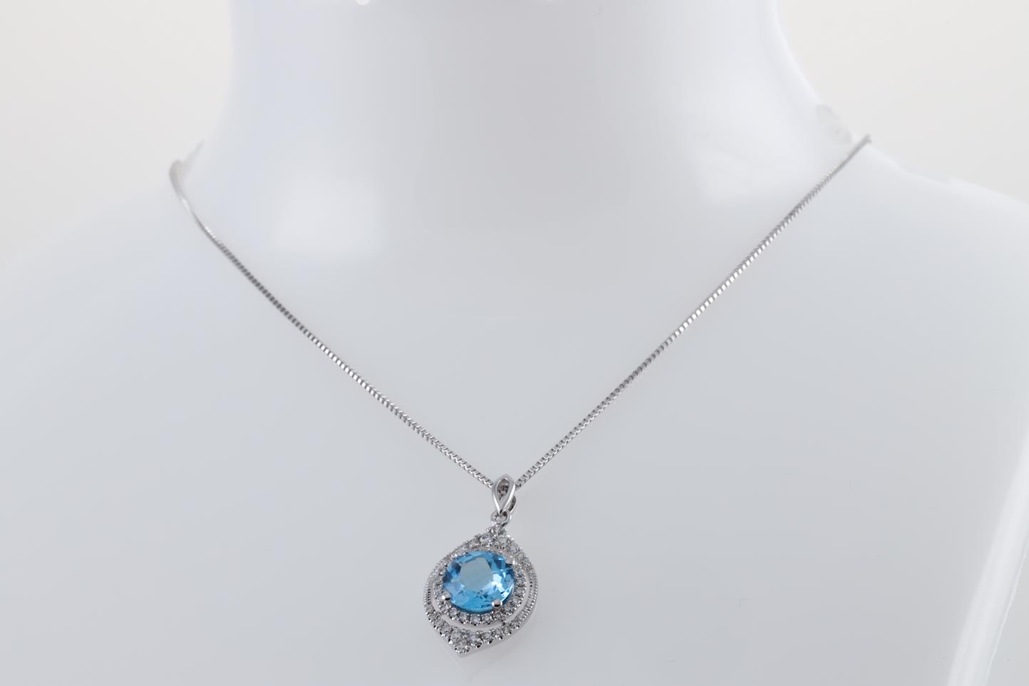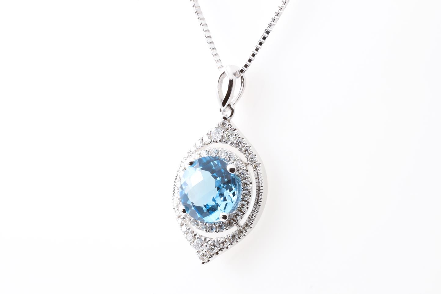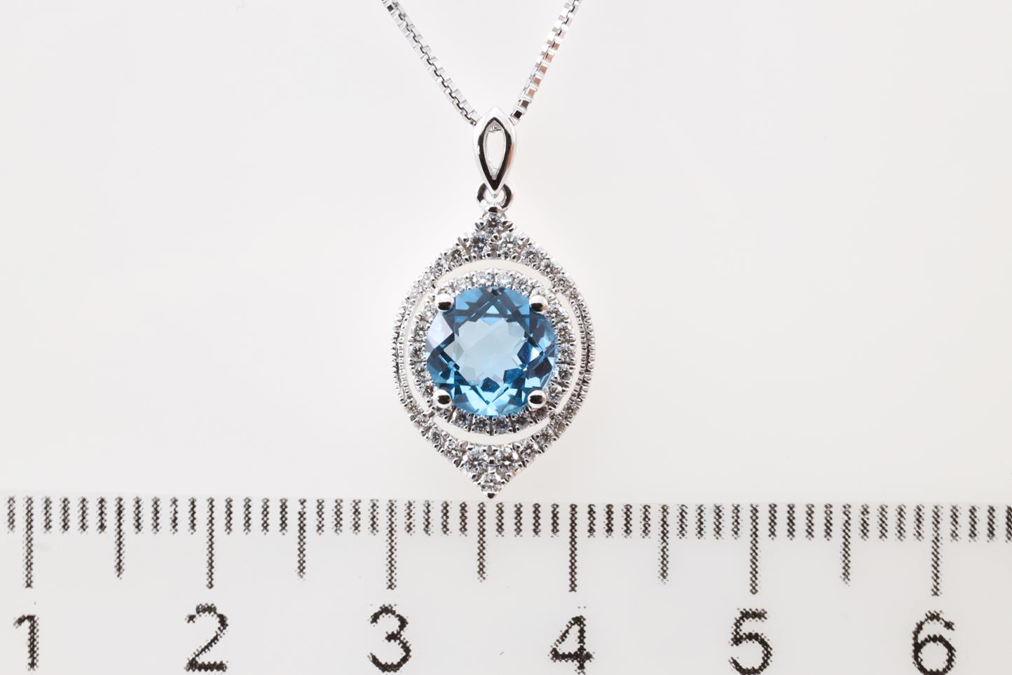 Topaz and Diamond pendant with round Blue Topaz of 1.42ct and Diamonds totalling 0.24cts. 14ct white gold with 18ct gold adjustable 45cm chain. Weight: 5.4g (New)