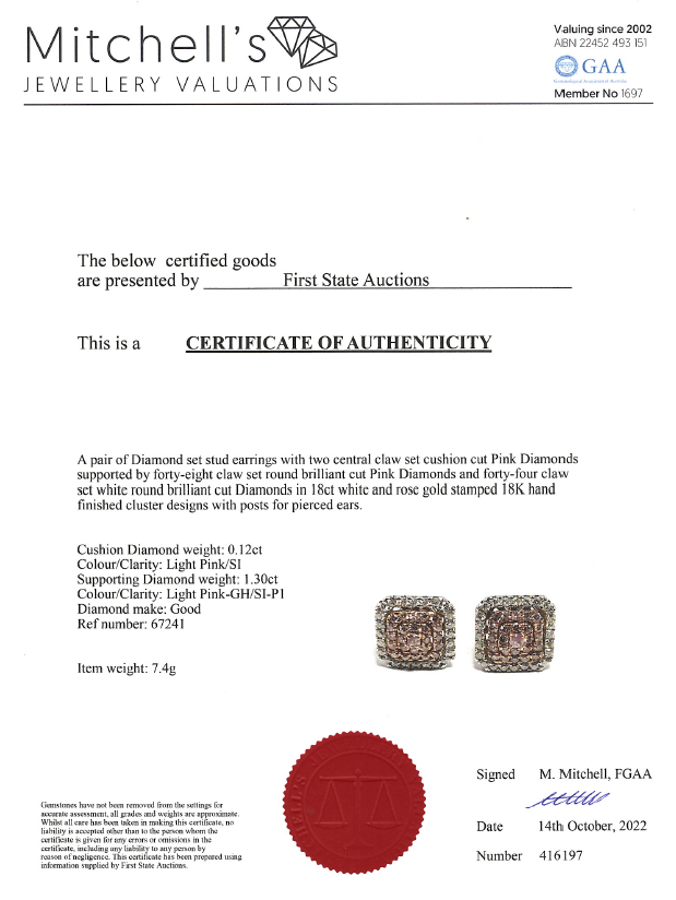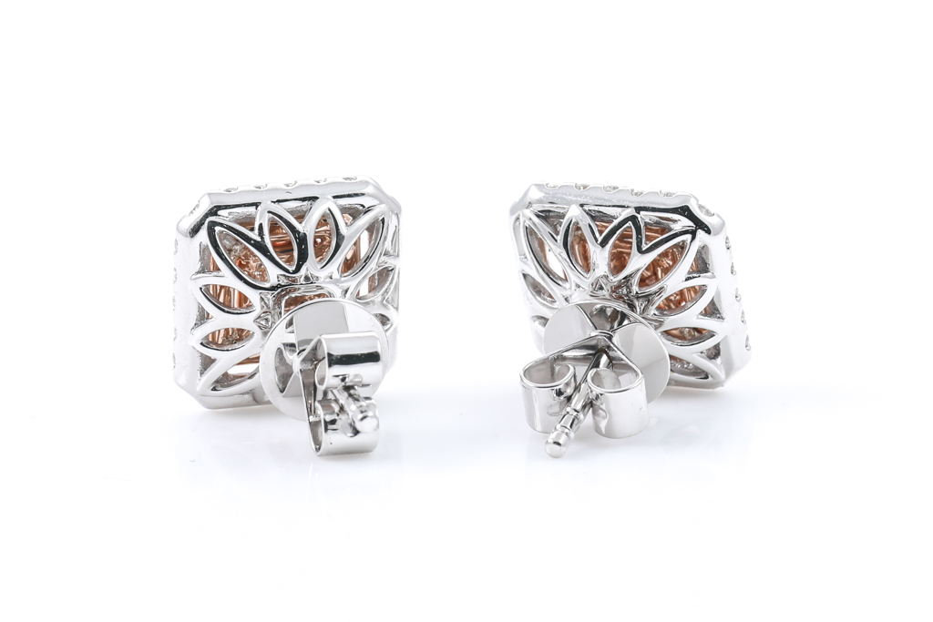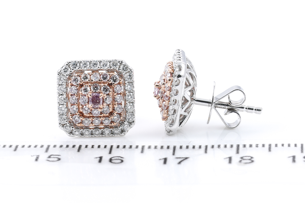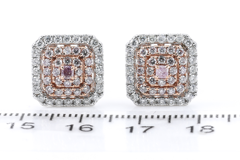 Diamond Halo earrings with centre pink cushion cut Diamonds totalling 0.12cts and surrounding Diamonds totalling 1.30cts (Estimated grading: Light Pink & G-H SI-P1). 18ct rose gold and white gold. Weight: 7.4g. With Certificate #416197. (As new)
