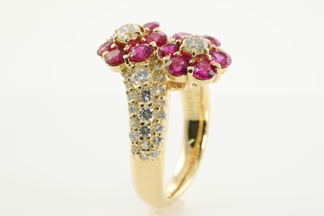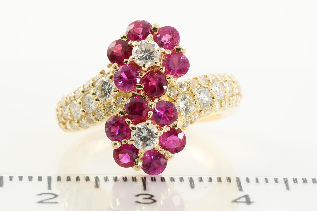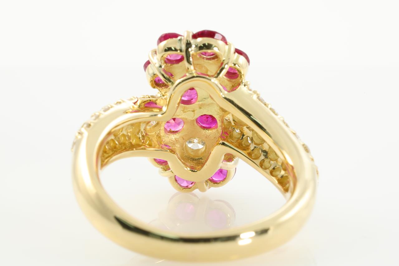 Ruby and Diamond ring with round Rubies totalling 1.42cts and Diamonds totalling 0.90cts (Estimated grading: H VS-SI). 18ct yellow gold. Ring size J - Ring resizing is not recommended. Weight: 7.2g (Pre-owned)