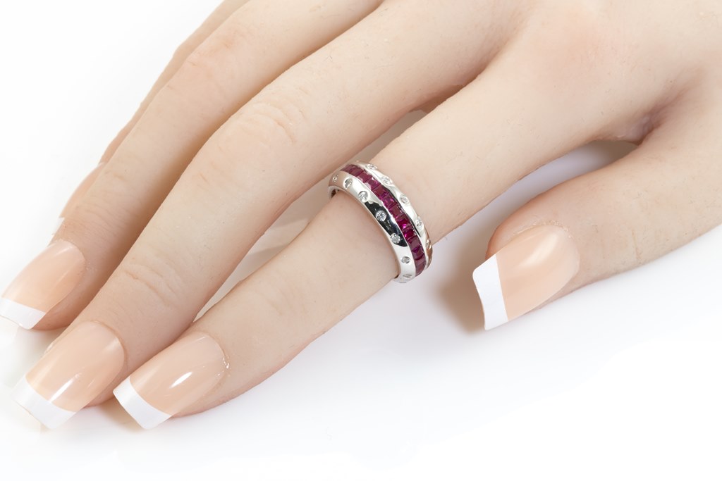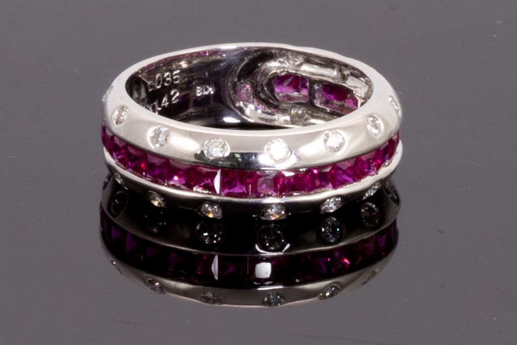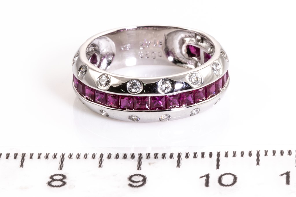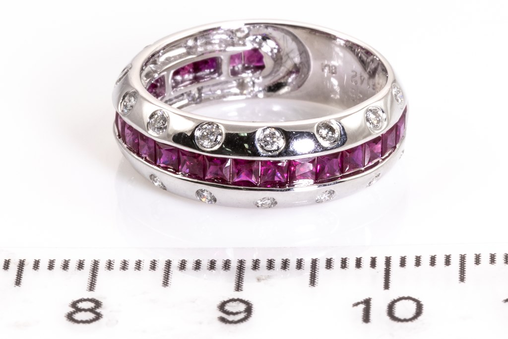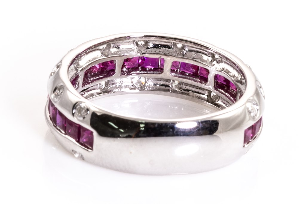 Ruby and Diamond ring with princess cut Rubies totalling 1.42cts and round Diamonds totalling 0.35cts (Estimated grading: H-I SI-P1). 18ct white gold. Ring size L - ring resizing is not recommended. Weight: 5.1g. (Pre-owned)