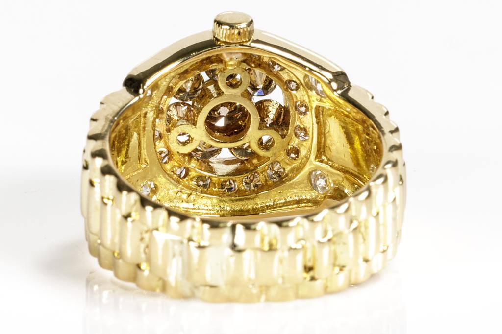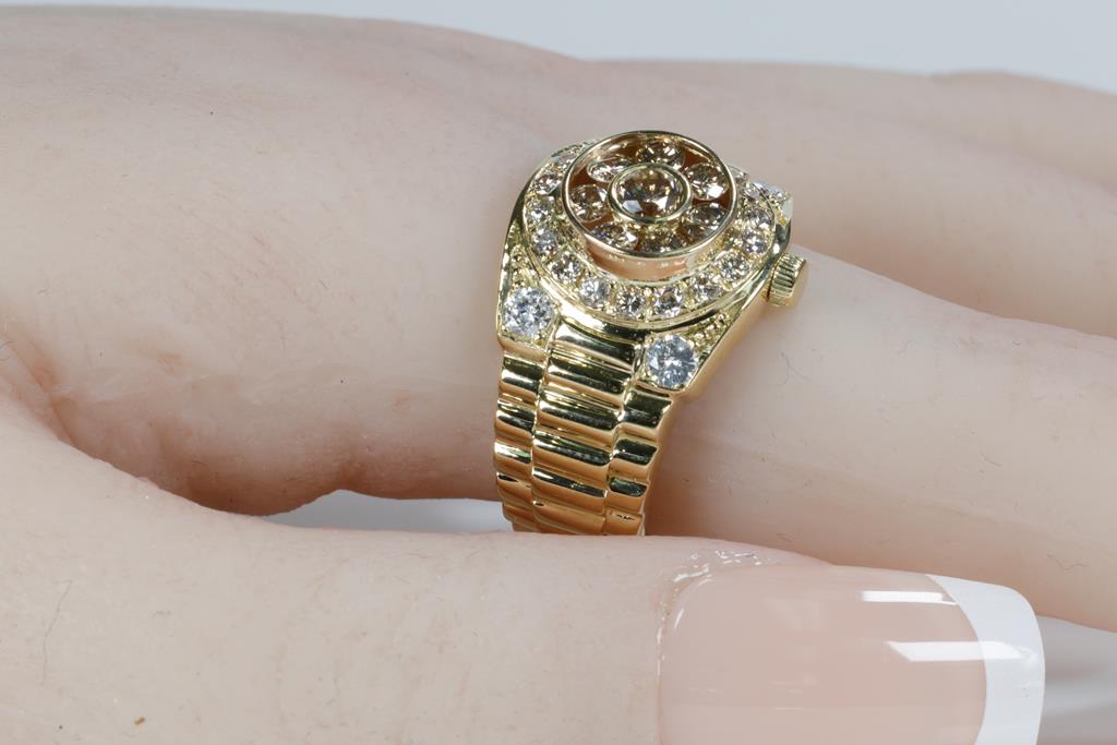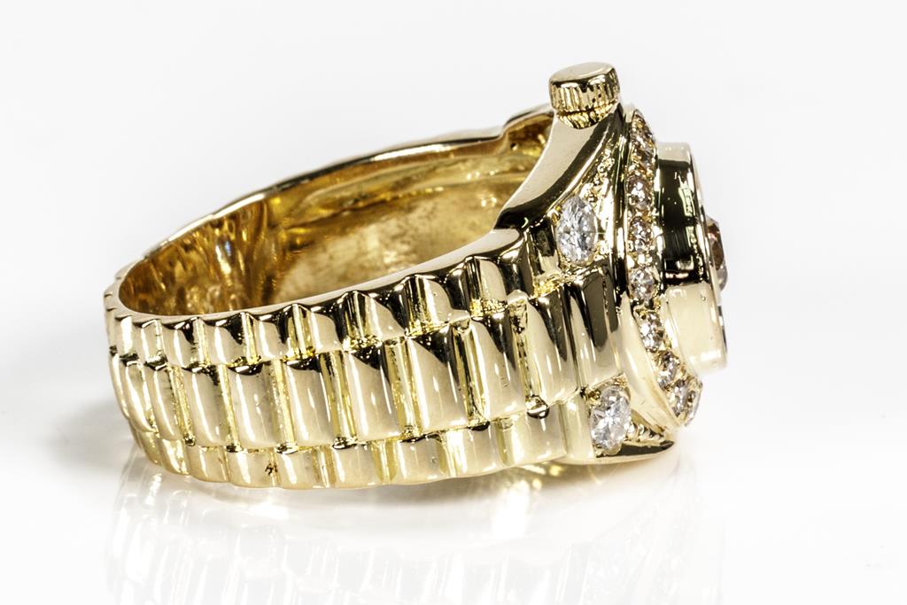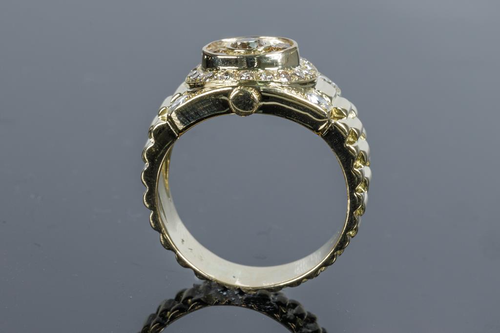Diamond mens ring with round Diamonds totalling 1.43cts (Estimated grading: Champagn-H SI-P1). 18ct yellow gold. Ring size: R - ring resizing is not recommended. Weight: 11.4g. (Pre-owned)