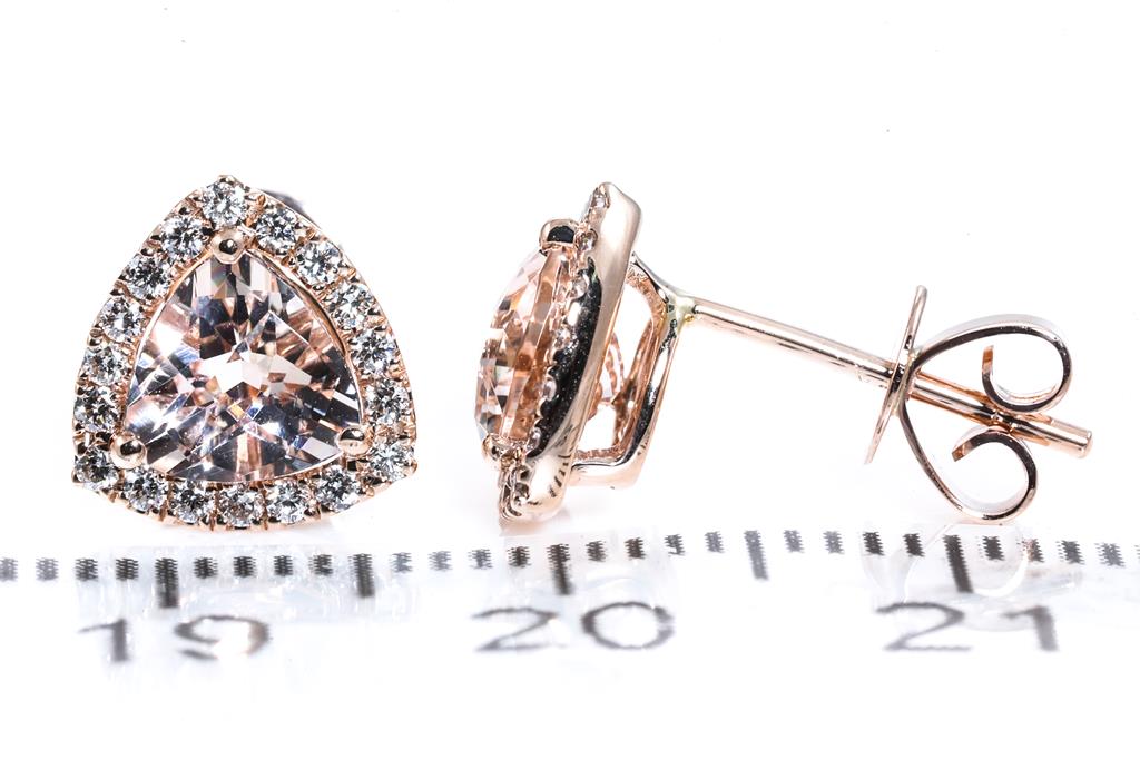 Morganite and Diamond earrings with trilliant Morganite totalling 1.43cts and round Diamonds totalling 0.25cts. 14ct rose gold. Weight: 1.8g. (New)