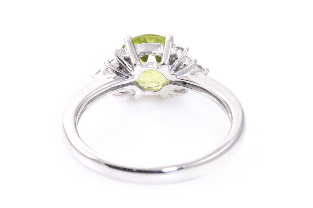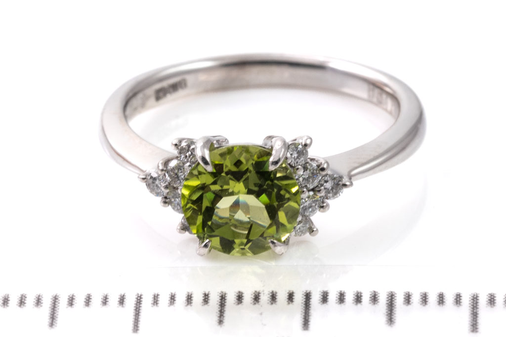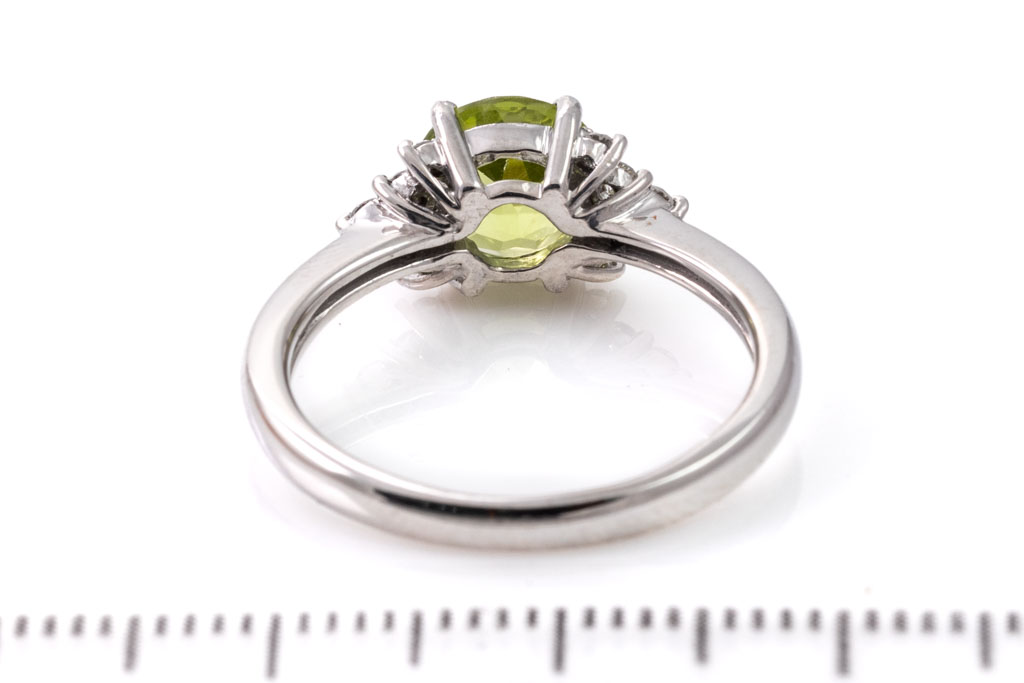 Peridot and Diamond ring with a round Peridot of 1.43ct and Diamonds totalling 0.17cts. 18ct white gold. Ring size L. Weight: 3.7g. (Pre-owned)
