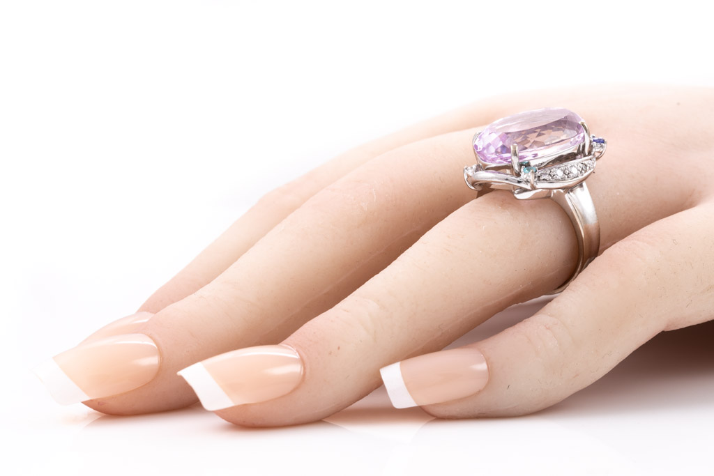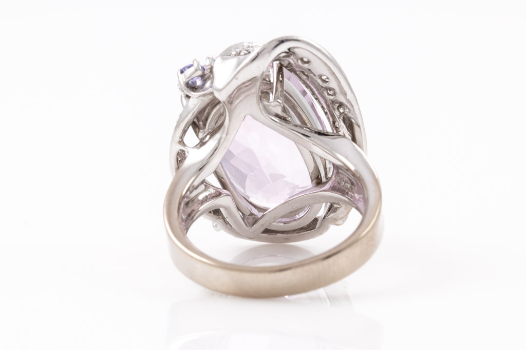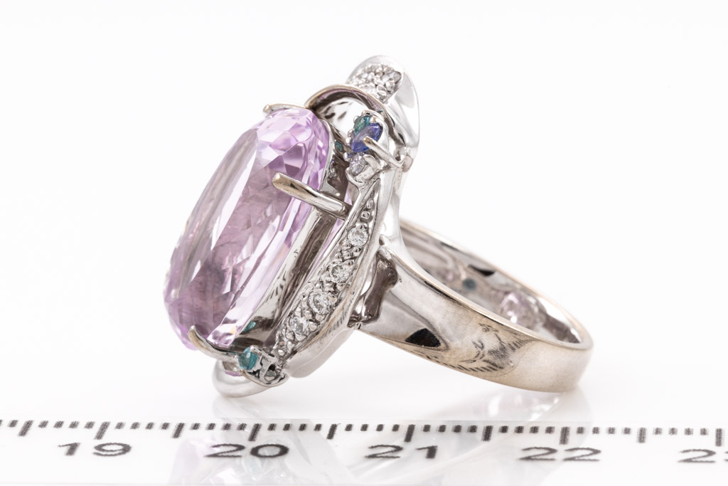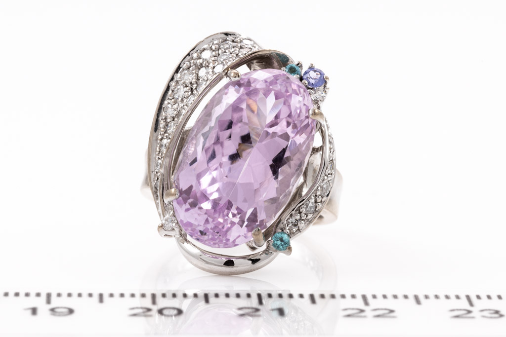 Kunzite and Diamond ring with oval shape Kunzite of 14.48ct, one round Iolite of 0.05ct, two round Paraiba Tourmalines totalling 0.05cts and round Diamonds totalling 0.35cts (Estimated grading: G-H VS-SI). 18ct white gold. Ring size L1/2. Weight: 14.4g. (Pre-owned)