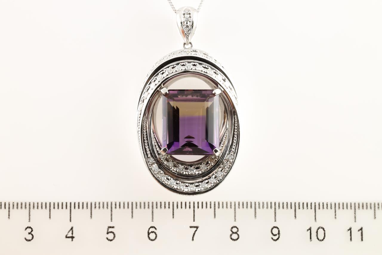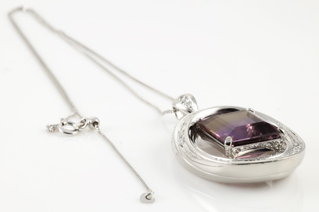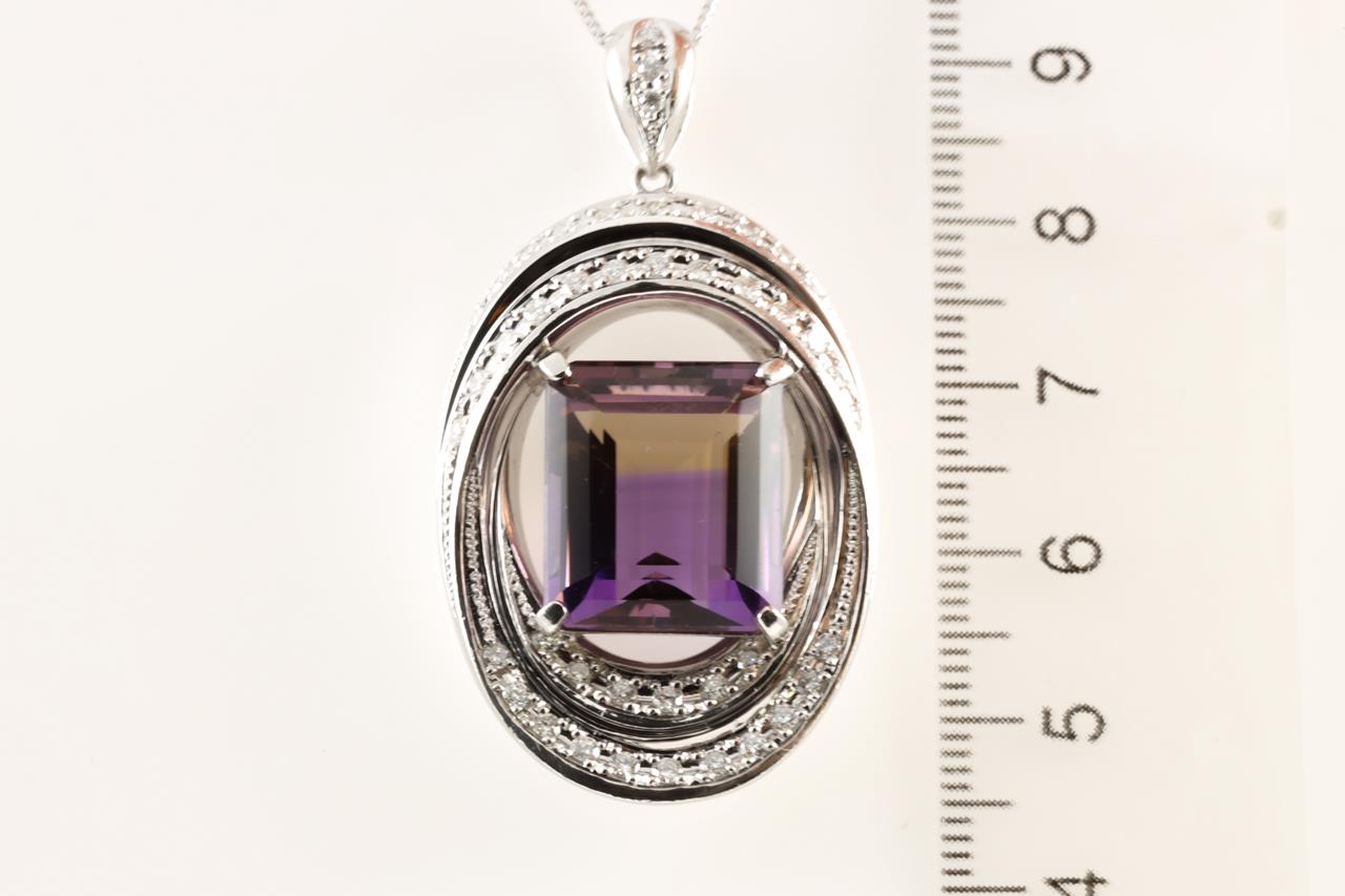 Ametrine and Diamond pendant with an emerald cut Ametrine of 14.49ct and Diamonds totalling 1.12cts (Estimated grading: H SI). Platinum with 18ct white gold 44cm adjustable chain. Weight: 26.3g. (Pre-owned)