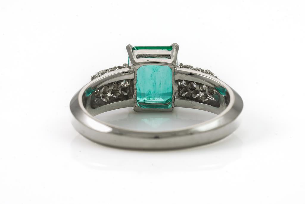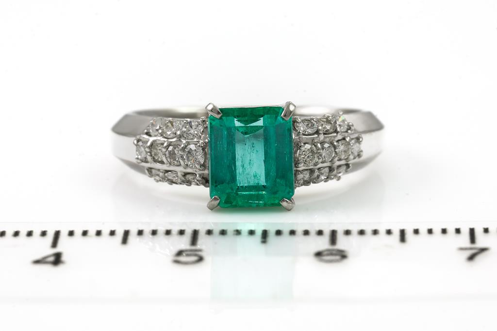 Emerald and Diamond ring with an emerald cut Emerald of 1.44ct and Diamonds totalling 0.39cts (Estimated grading: H-I SI-P1). Platinum. Ring size O - ring resizing is not recommended. Weight: 6.7g. (Pre-owned)