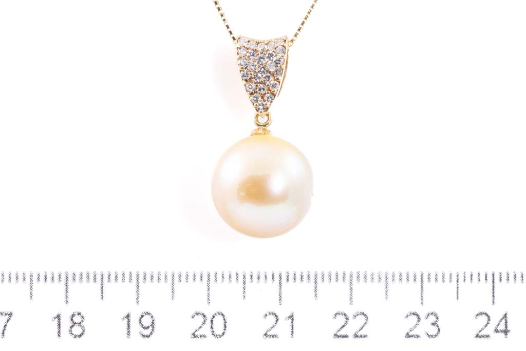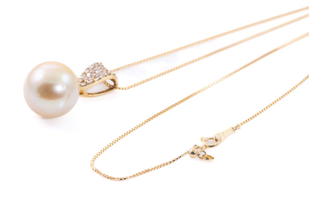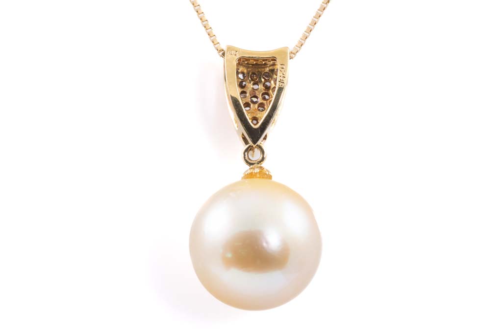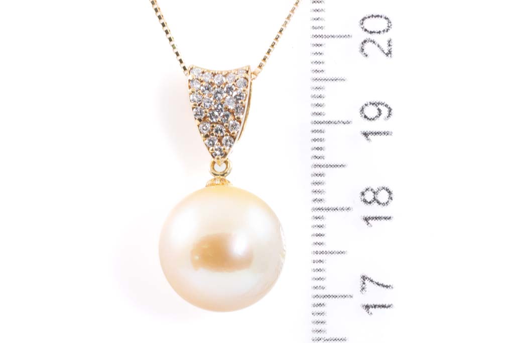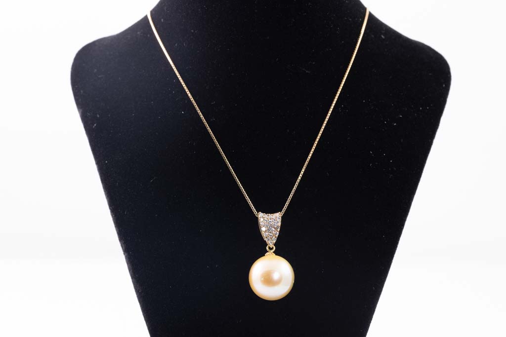 Pearl and Diamond pendant with Golden South Sea Pearl of 14.4mm and Diamonds totalling 0.29cts (Estimated grading: H SI). 18ct yellow gold with 18ct yellow gold 44cm adjustable chain. Weight: 7.8g. (Pre-owned)
