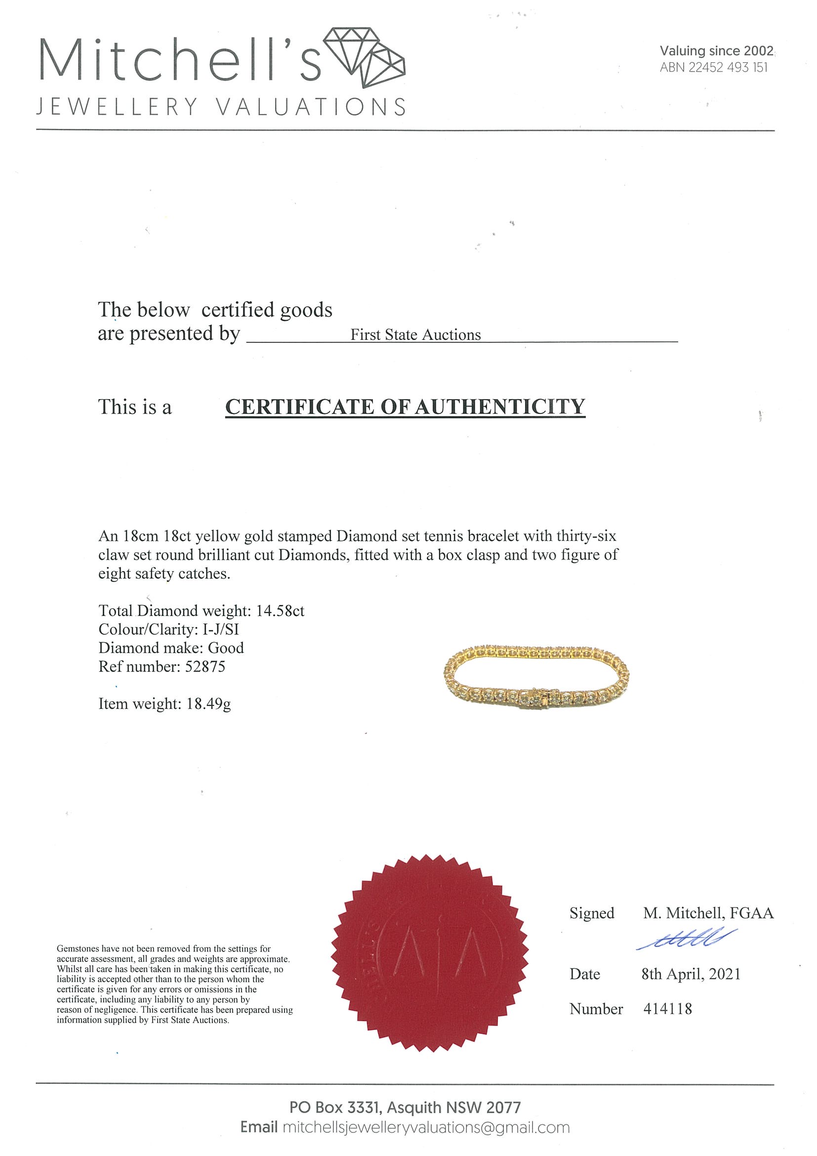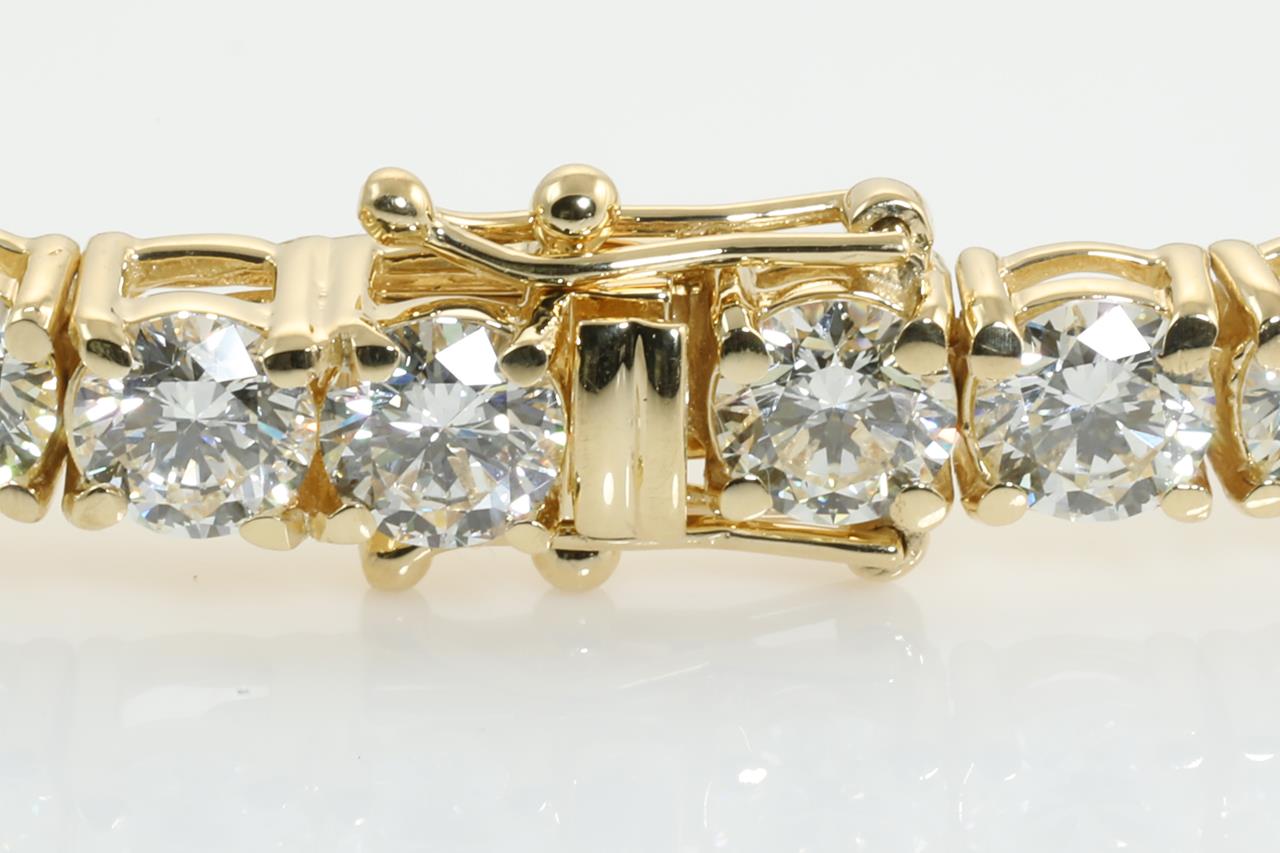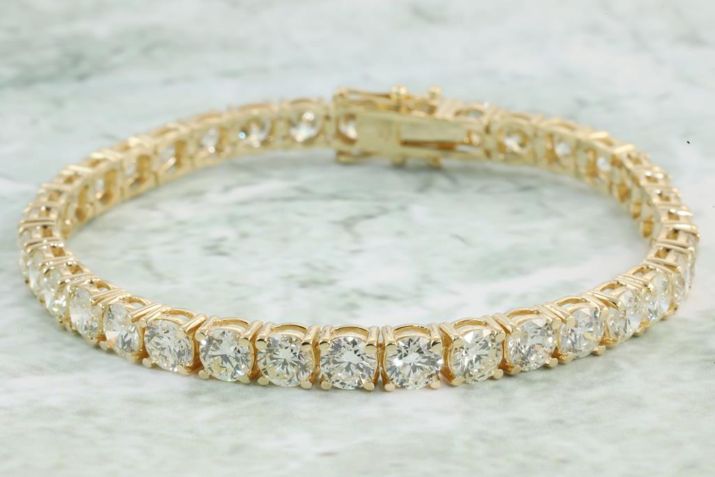 Diamond tennis bracelet with 36 round Diamonds totalling 14.58cts (Estimated grading: I-J SI). 18ct yellow gold. Length: 18cm Weight: 18.4g With certificate #414118 (New)