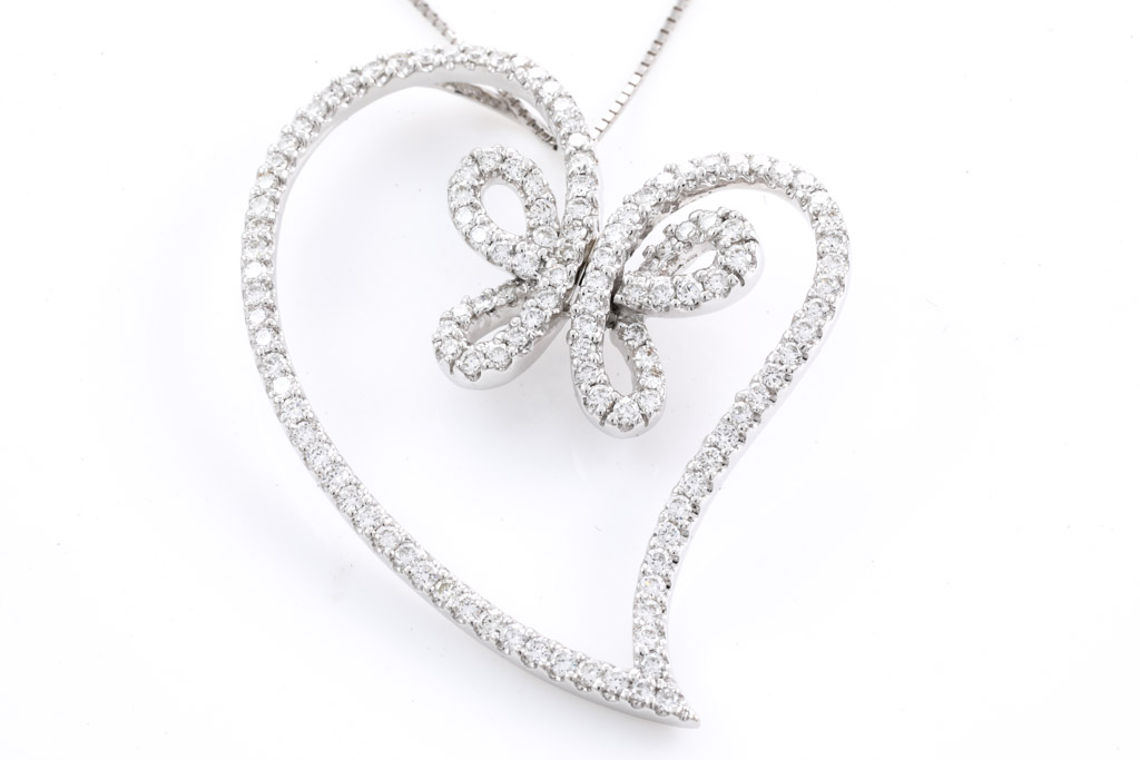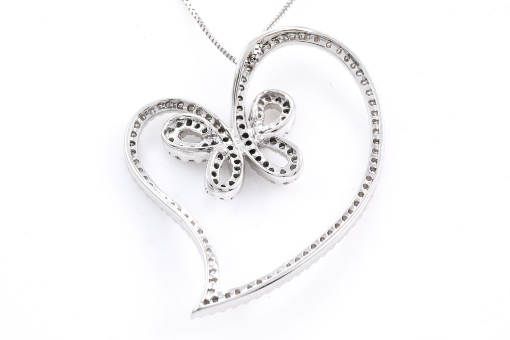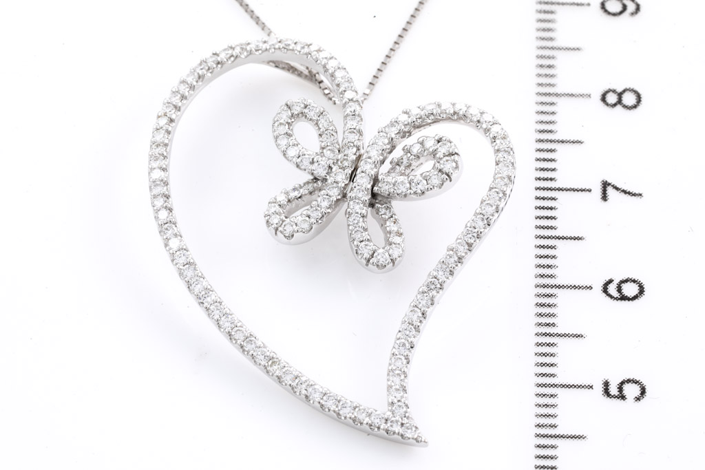 Diamond heart designed pendant with round Diamonds totalling 1.45cts (Estimated grading: H SI). 18ct white gold with 18ct white gold adjustable 44cm chain. Length: 44cm. Weight: 8.9g. (Pre-owned)