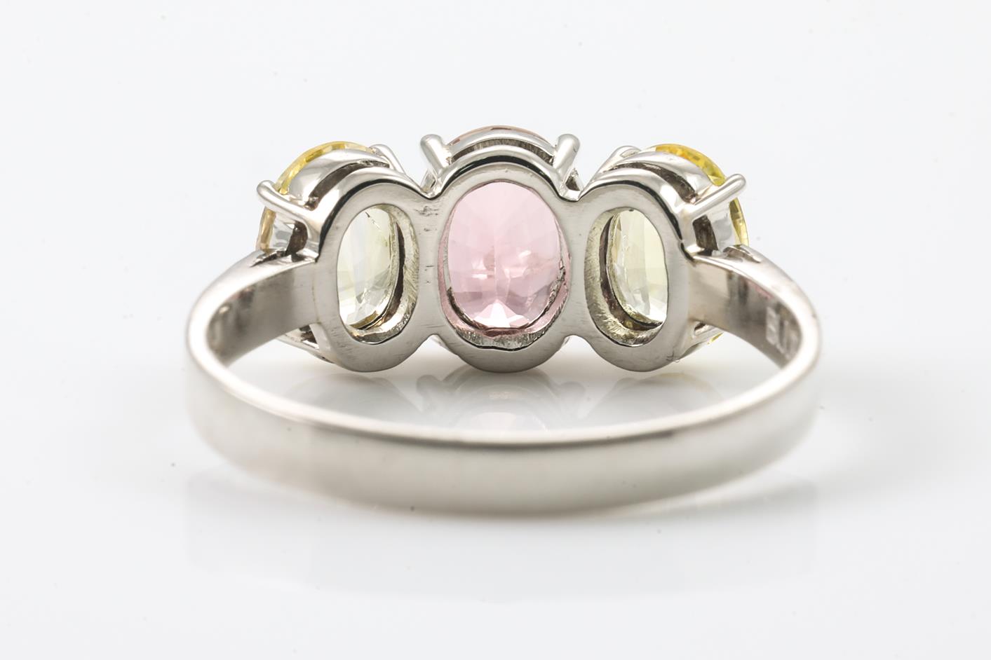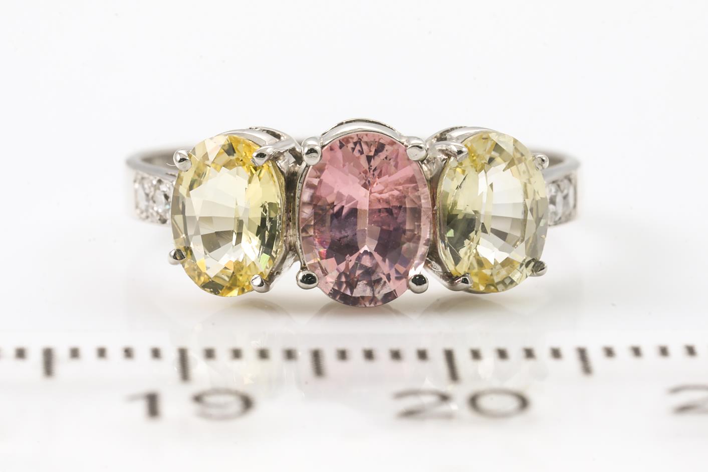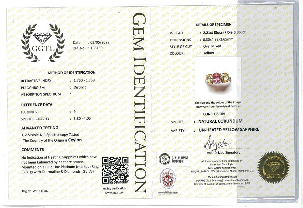 Sapphire, Tourmaline and Diamond ring with oval cut unheated Ceylon yellow Sapphires totalling approximately 1.45cts, pink oval Tourmaline of approximately 0.75cts and round Diamonds totalling 0.06ct. Platinum. Ring size L 1/2. Resizing not recommended. Weight 3.8g. With GGTL Laboratory report #136150. (As New)