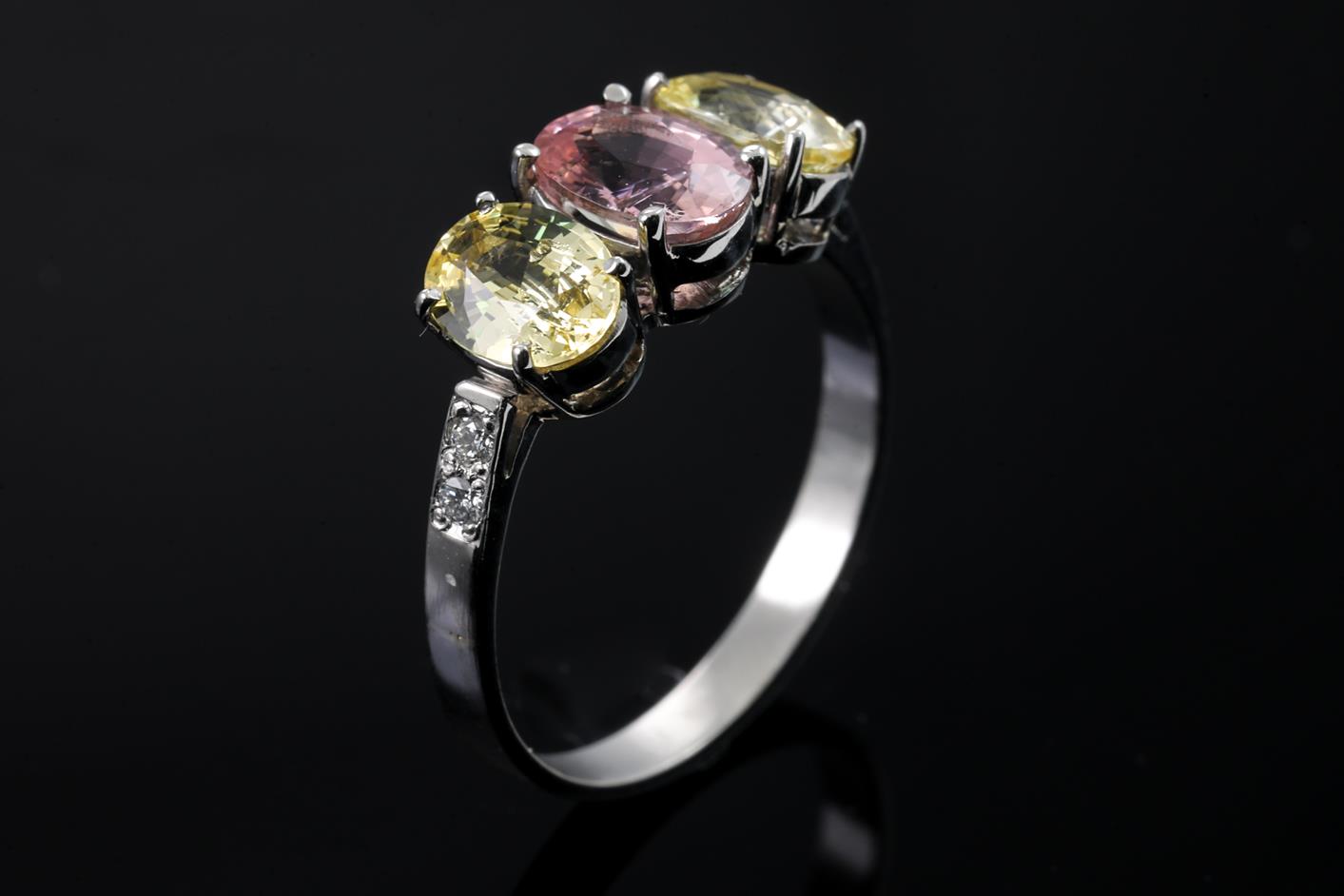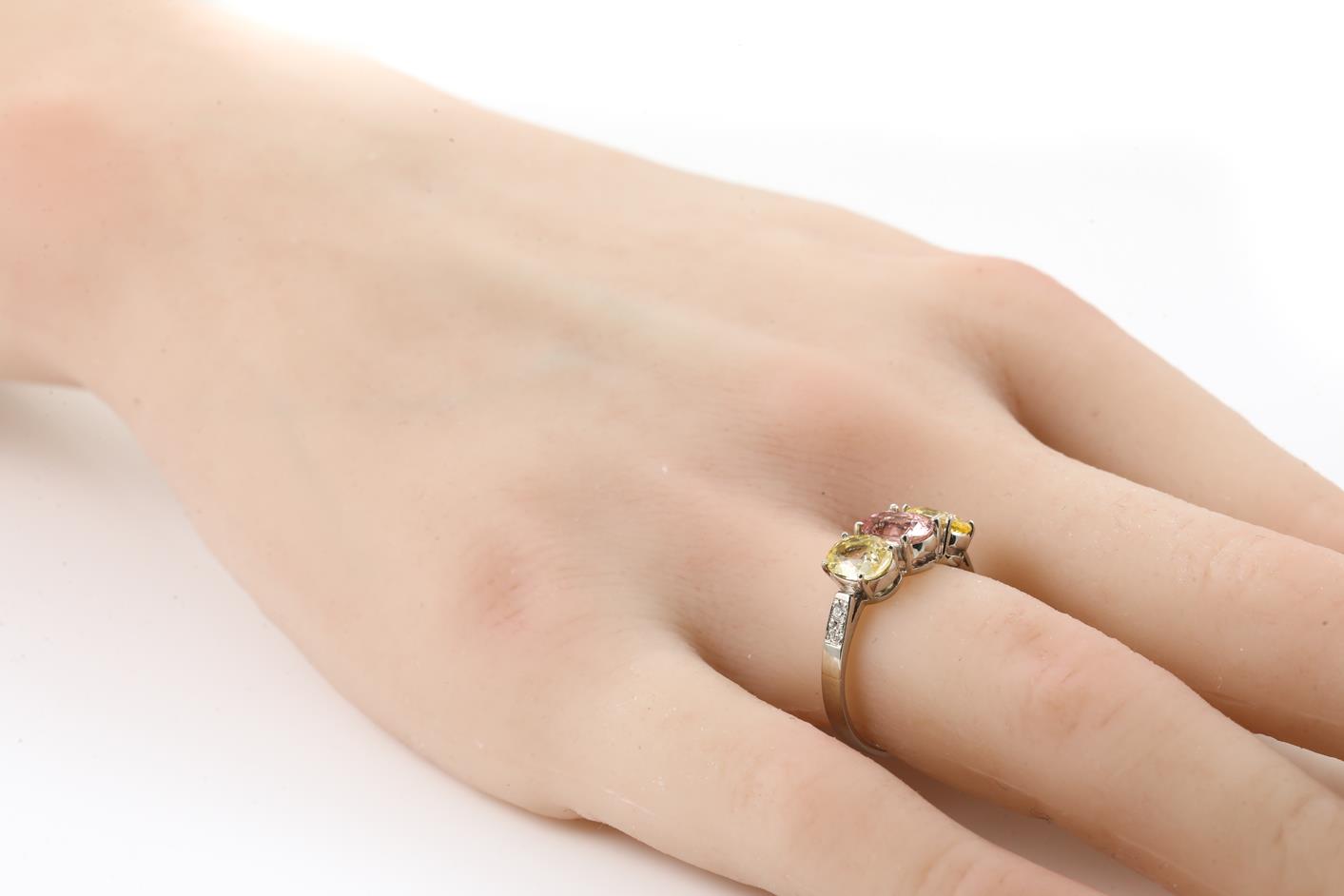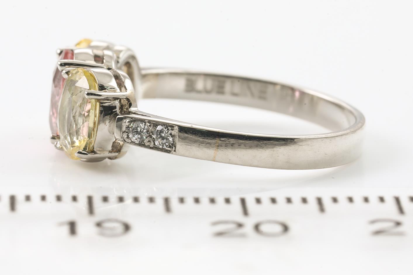 Sapphire, Tourmaline and Diamond ring with oval cut unheated Ceylon yellow Sapphires totalling approximately 1.45cts, pink oval Tourmaline of approximately 0.75cts and round Diamonds totalling 0.06ct. Platinum. Ring size L 1/2. Resizing not recommended. Weight 3.8g. With GGTL Laboratory report #136150. (As New)