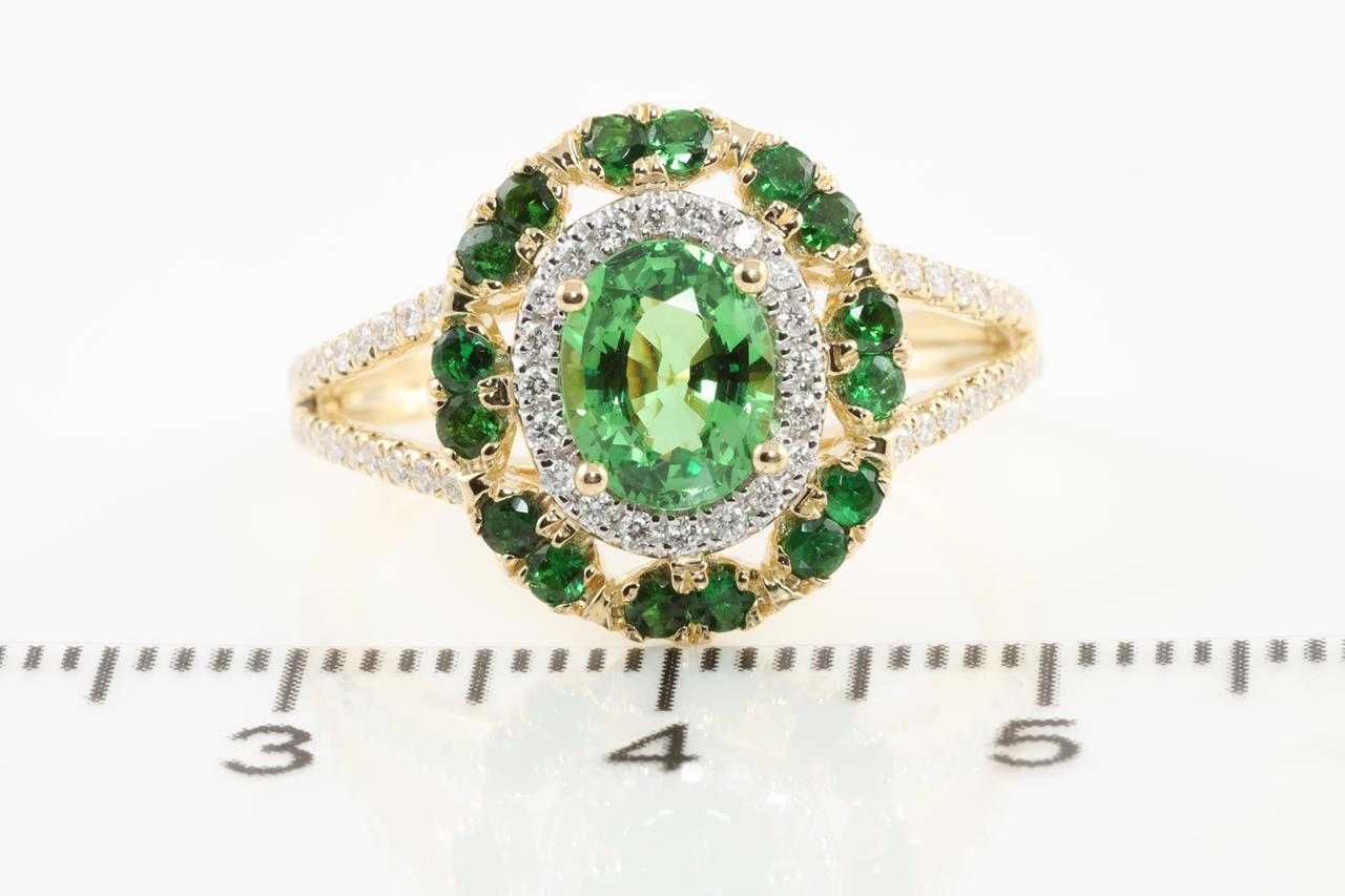 Tsavorite and Diamond ring with oval and round Tsavorites totalling 1.45cts and Diamonds totalling 0.24cts. 14ct yellow gold. Ring size N1/2 - ring resizing is not recommended. Weight:3.8g (Pre-owned)