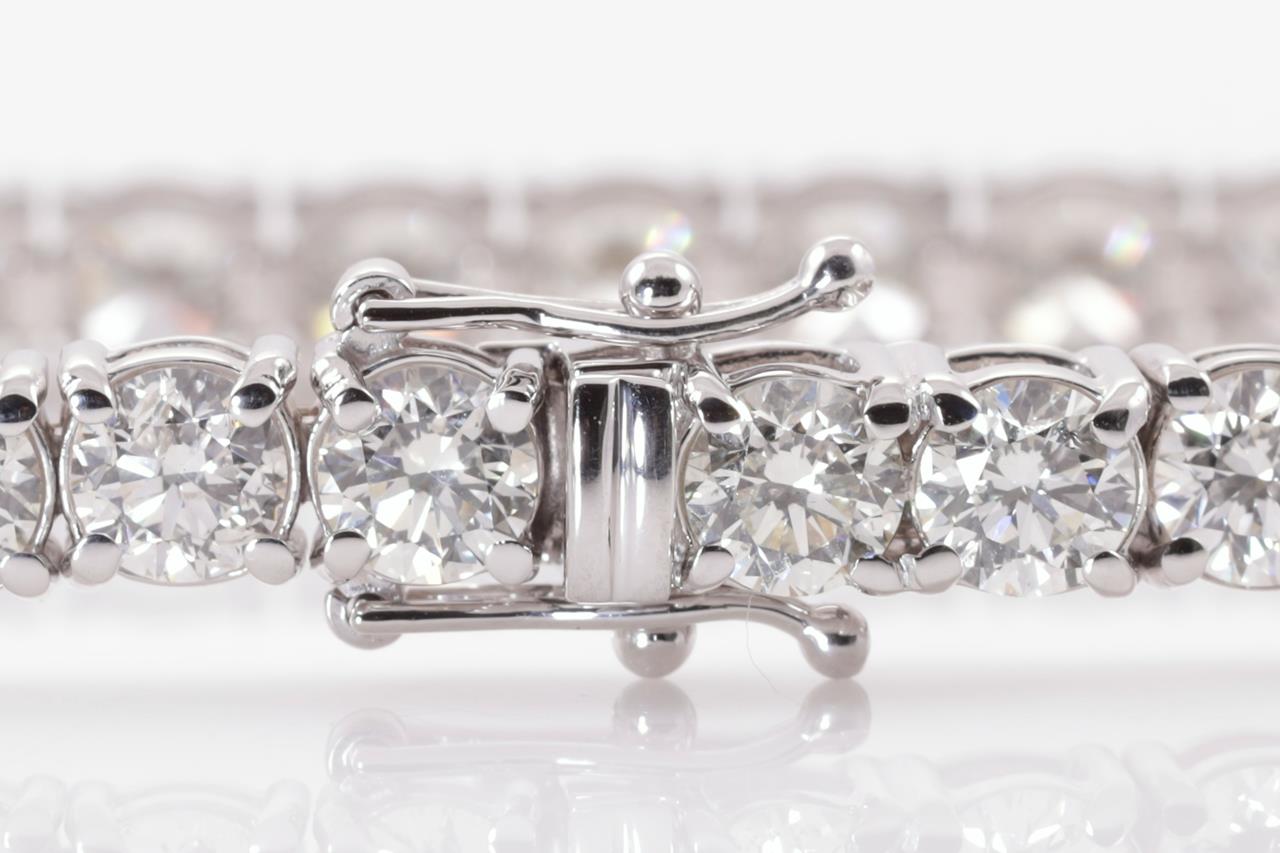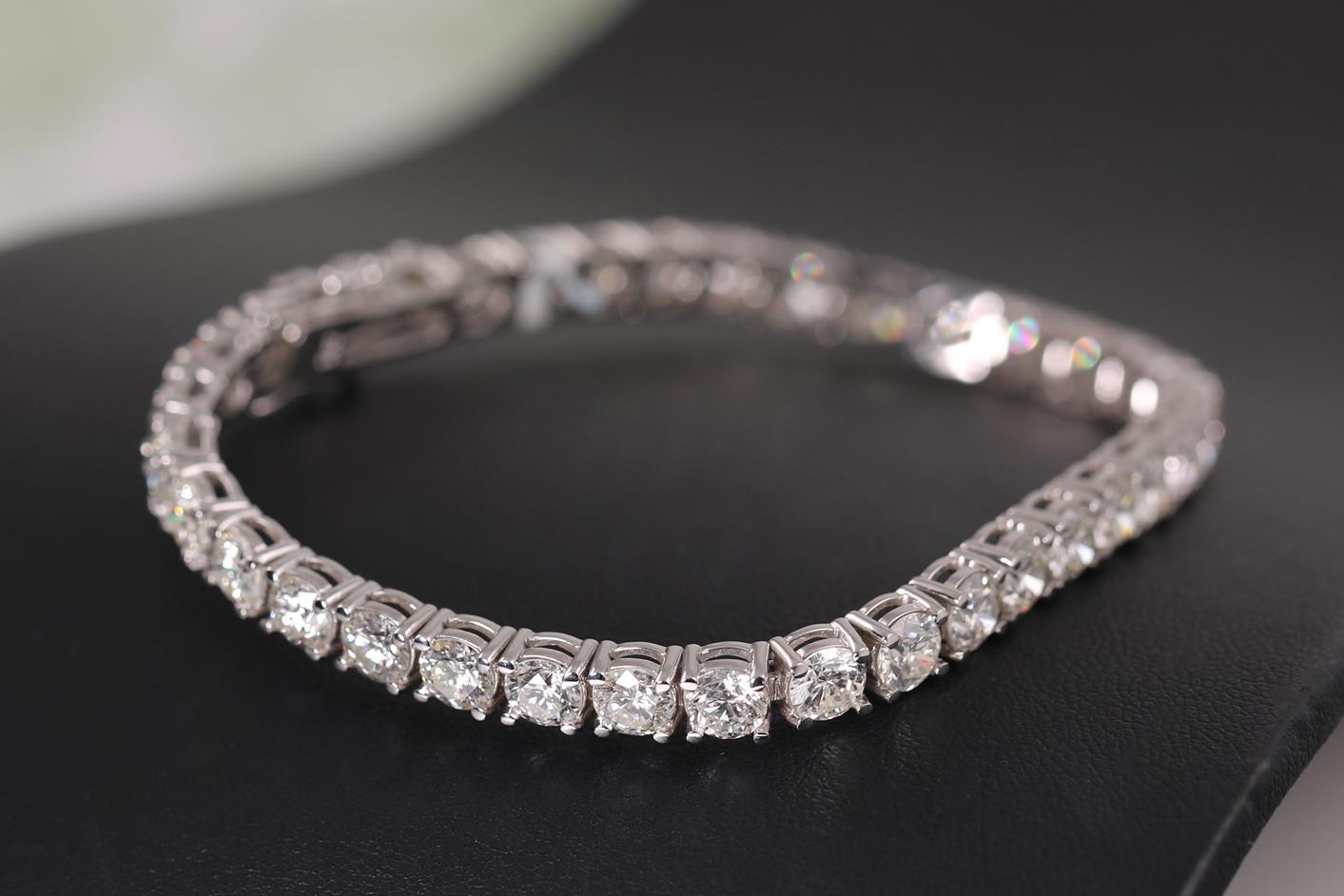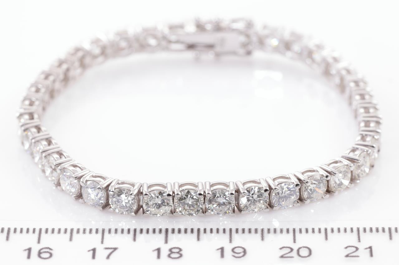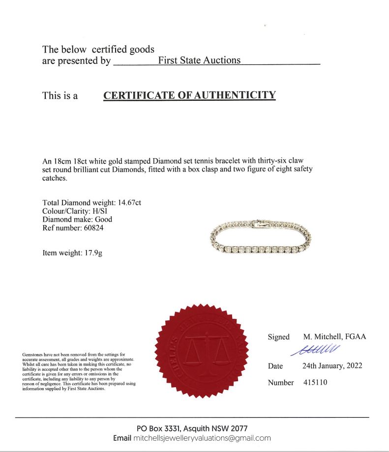 Diamond tennis bracelet with 36 round Diamonds totalling 14.67cts (Estimated grading: H SI). 18ct white gold. Length: 18cm. Weight: 17.9g. With certificate #415120. (New)