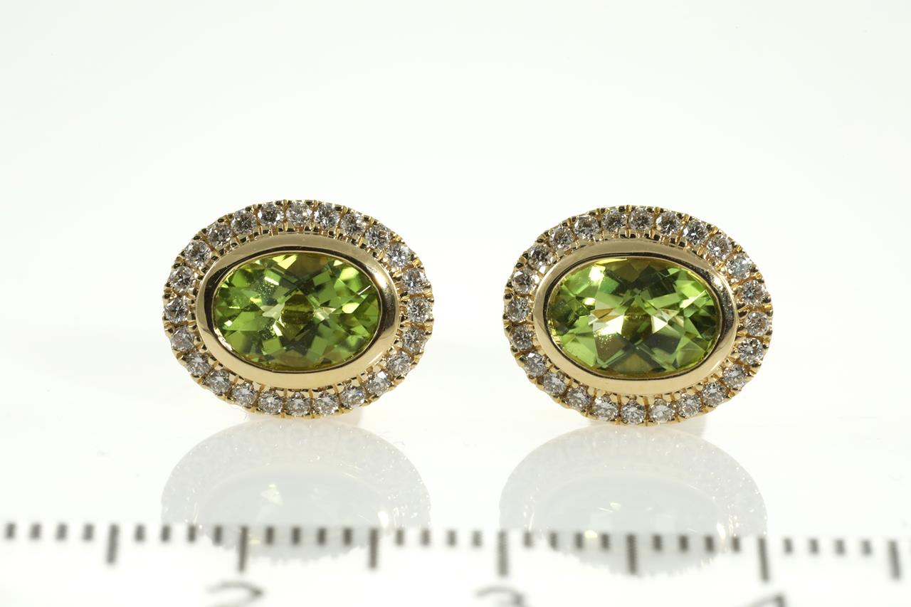 Peridot and Diamond earrings with oval checkerboard cut Peridot totalling 1.46cts and Diamonds totalling 0.25cts. 14ct Yellow gold. Weight: 2.5g. (New)