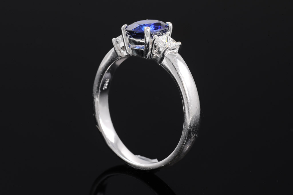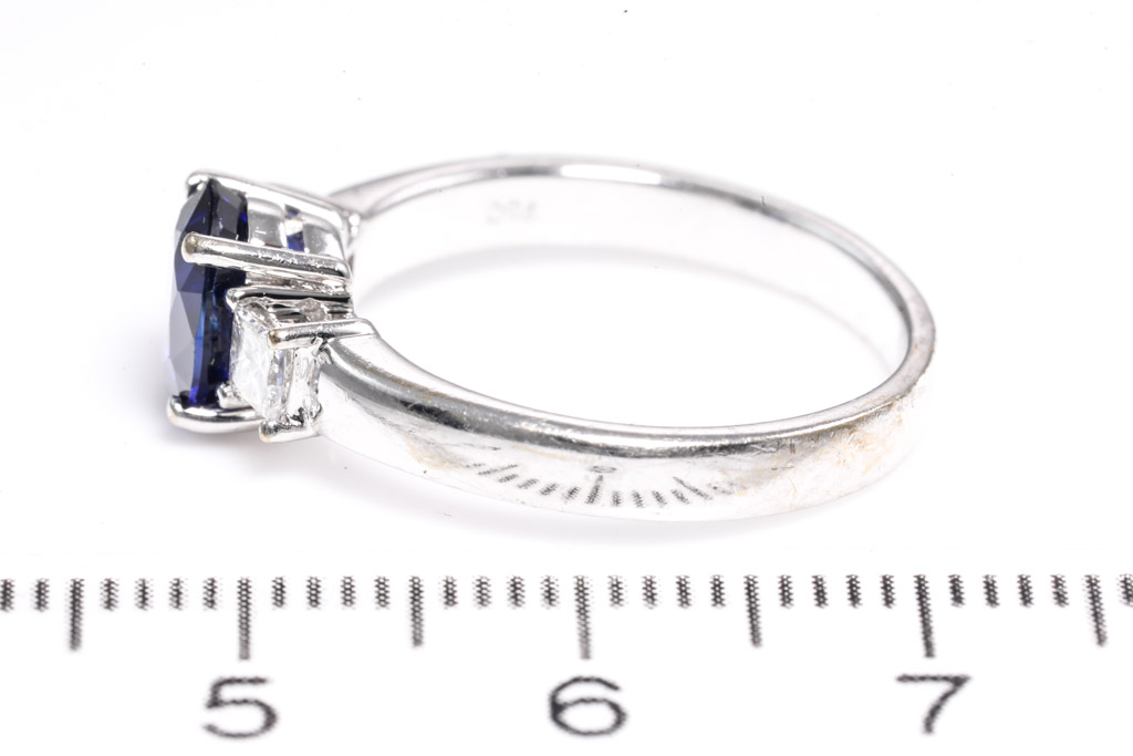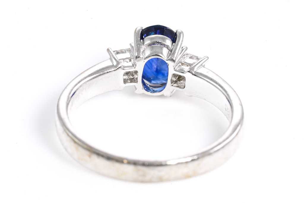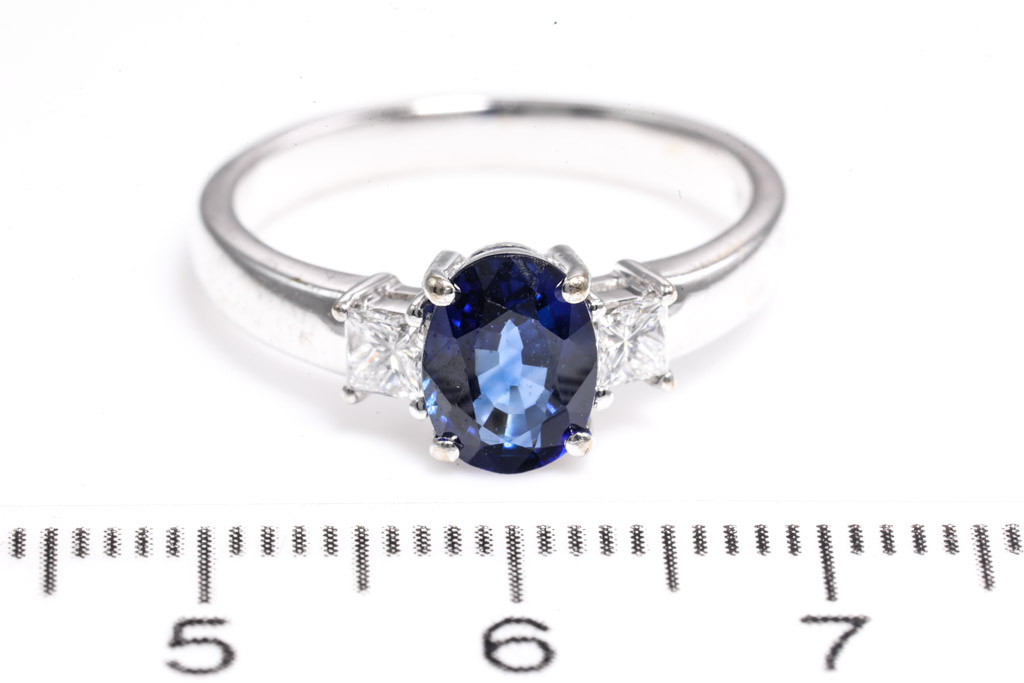 Sapphire and Diamond ring with oval shape blue Sapphire of 1.46ct and 2 princess cut Diamonds totalling approximately 0.16cts. 18ct white gold. Ring size: M1/2. Weight: 4.6g. (Pre-owned)