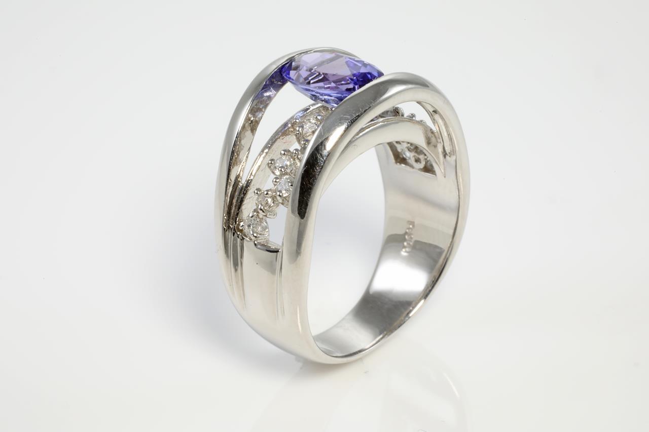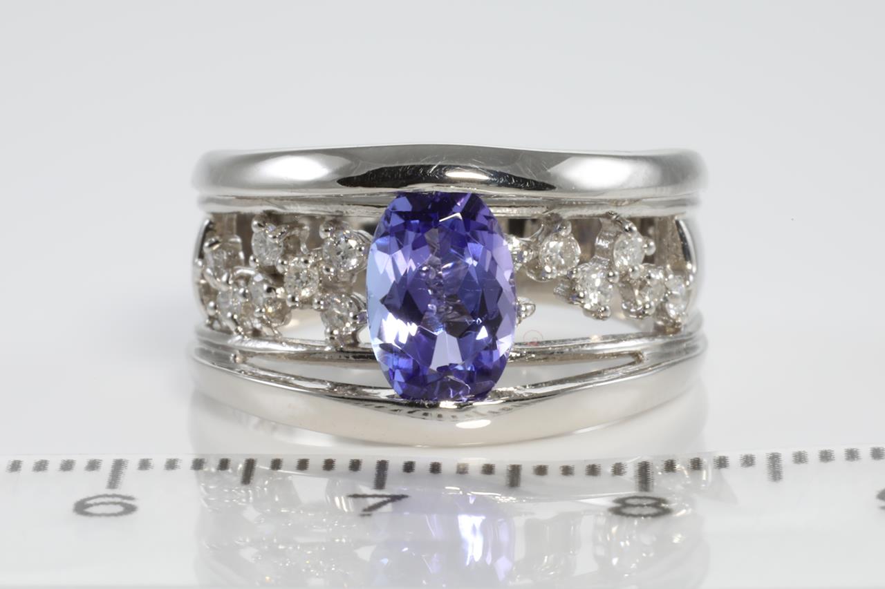 Tanzanite and Diamond ring with oval cut Tanzanite of 1.46ct and Diamonds totalling 0.32cts (Estimated grading H-I SI-P1). Platinum. Ring size: N1/2 - Ring resizing is not recommended. Weight: 12.9g. (As new).