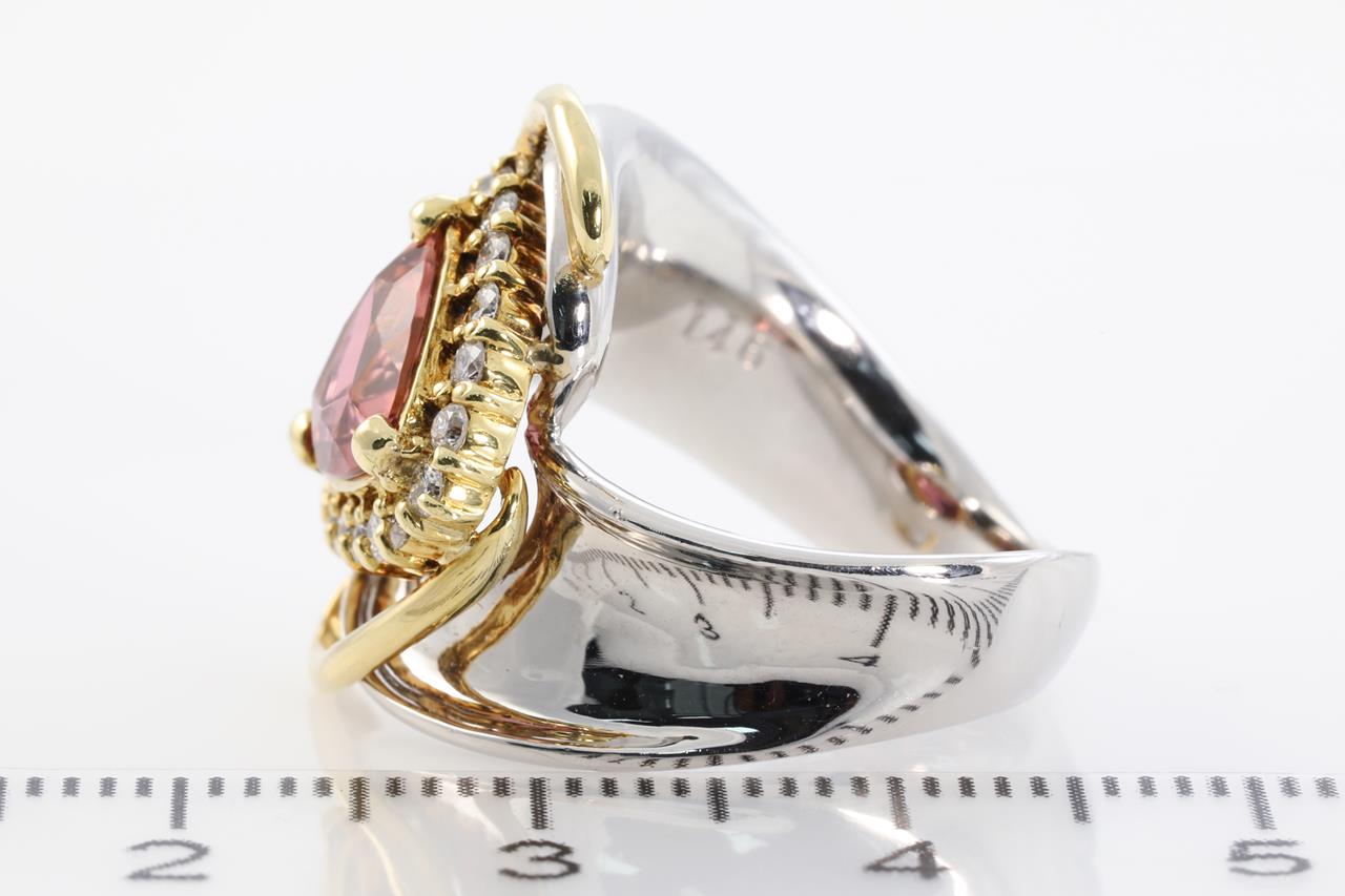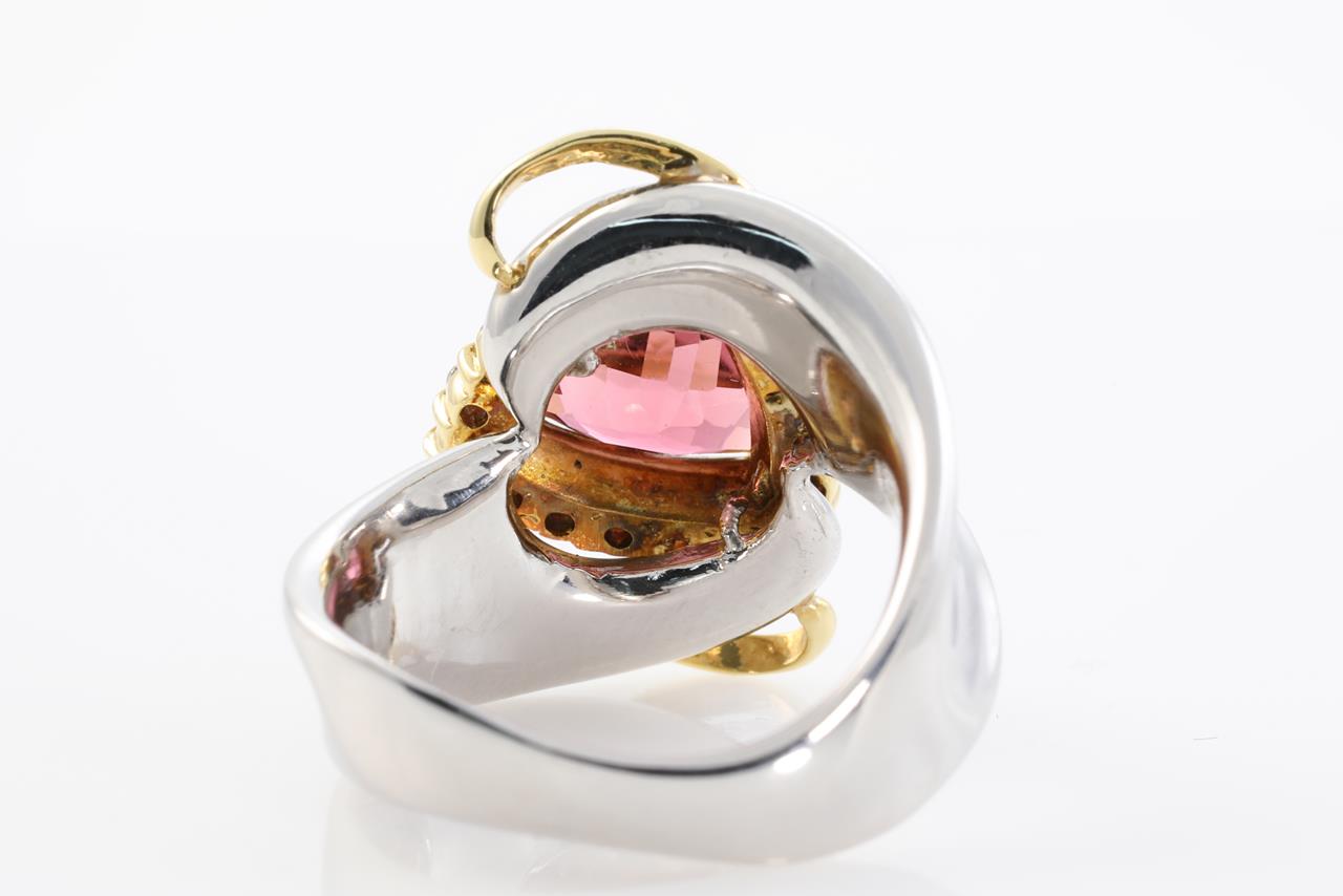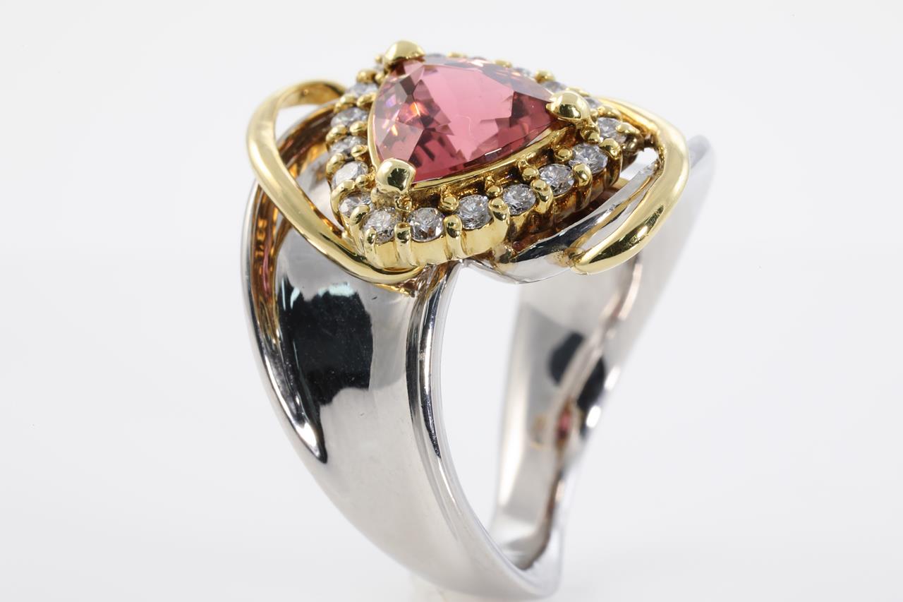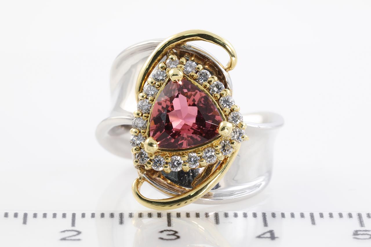 Tourmaline and Diamond ring with trilliant cut Pink Tourmaline of 1.46ct and Diamonds totalling approximately 0.40cts (Estimated grading: I P1). 18ct yellow gold and platinum. Ring size: J1/2 - Ring resizing is not recommended. Weight: 12.3g (Pre-owned)