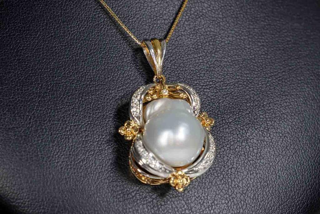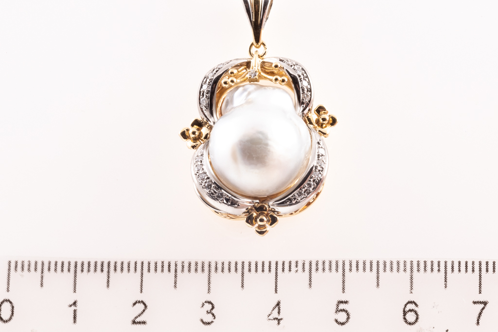 Pearl and Diamond pendant with Baroque South Sea Pearl of approximately 14.6mm and round Diamonds totalling 0.15cts. 18ct yellow gold and platinum with 44cm 18ct yellow gold chain. Weight: 13g. (Pre-owned)